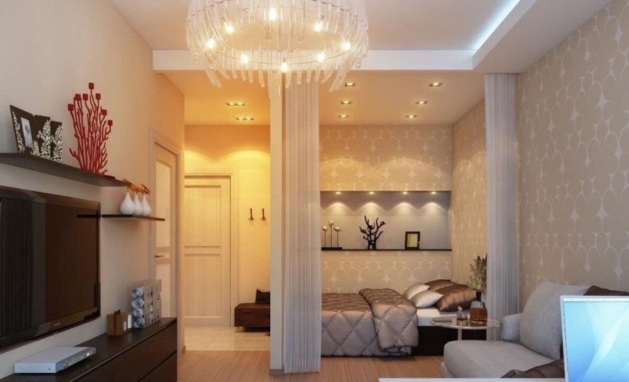 Интерьер однокомнатной квартиры с кроватью и диваном