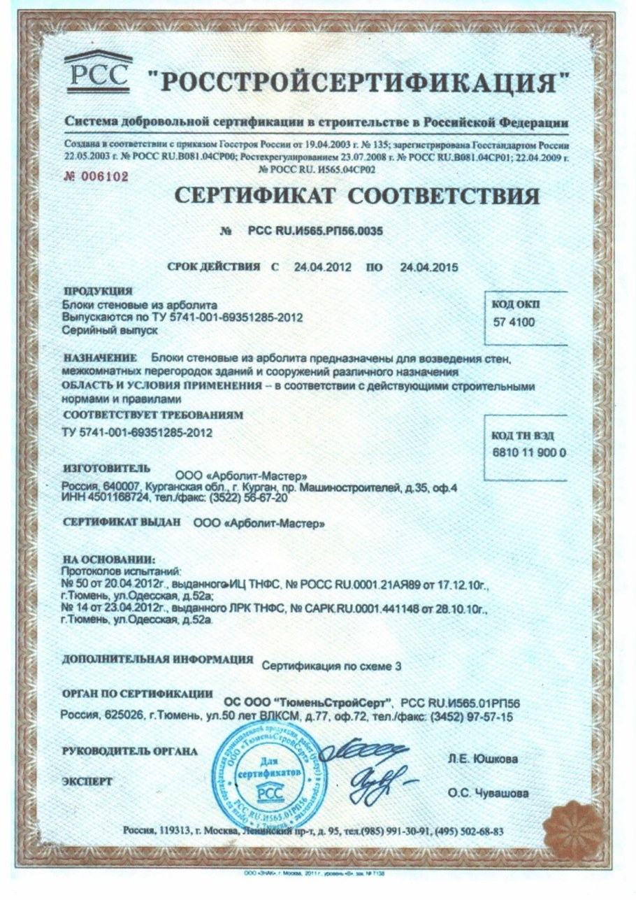Сертификат соответствия №рсс ru.и565.РП08.0541