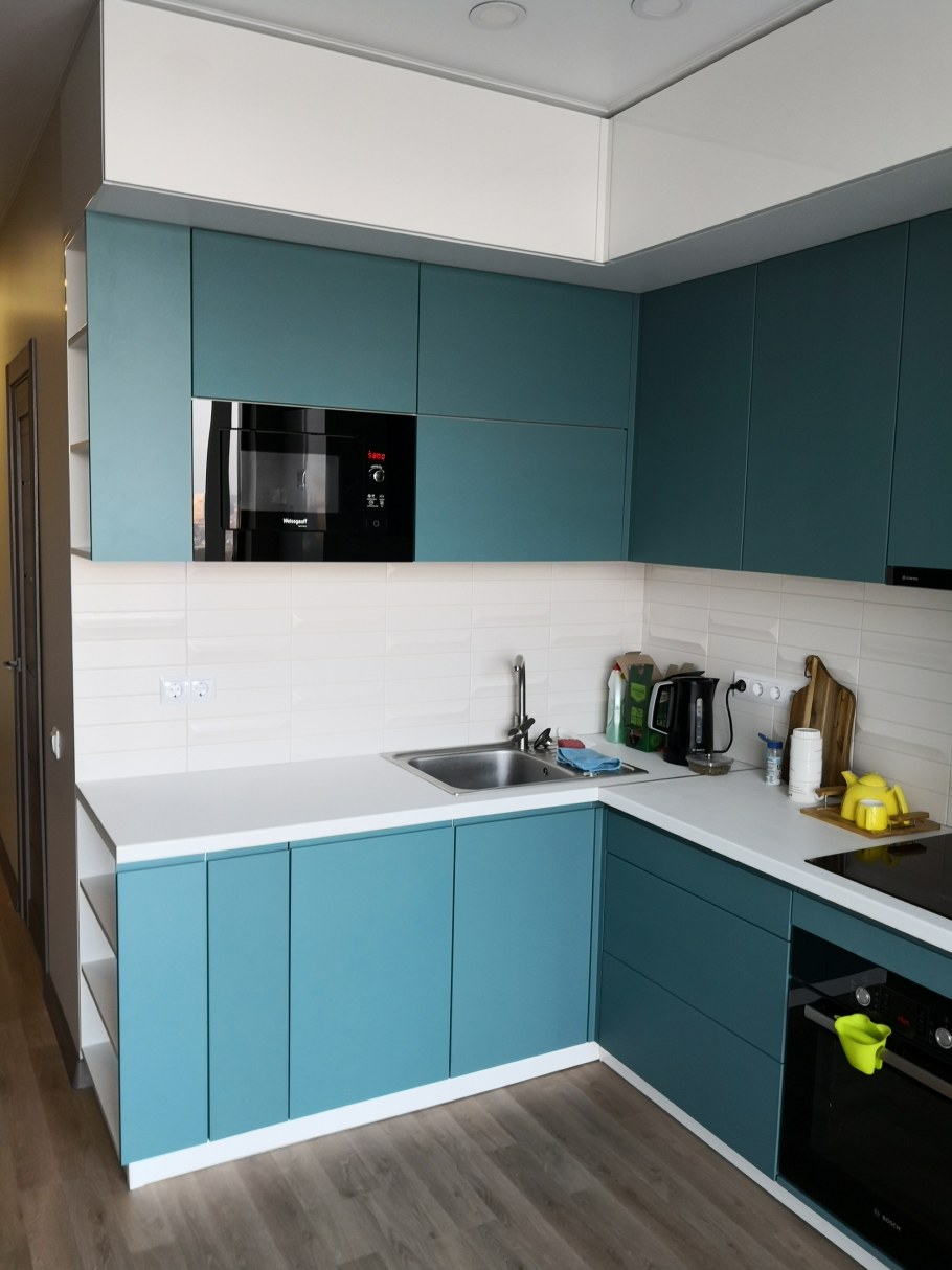 Кухня волна 2,0м (белый глянец теплый/бирюза металлик)