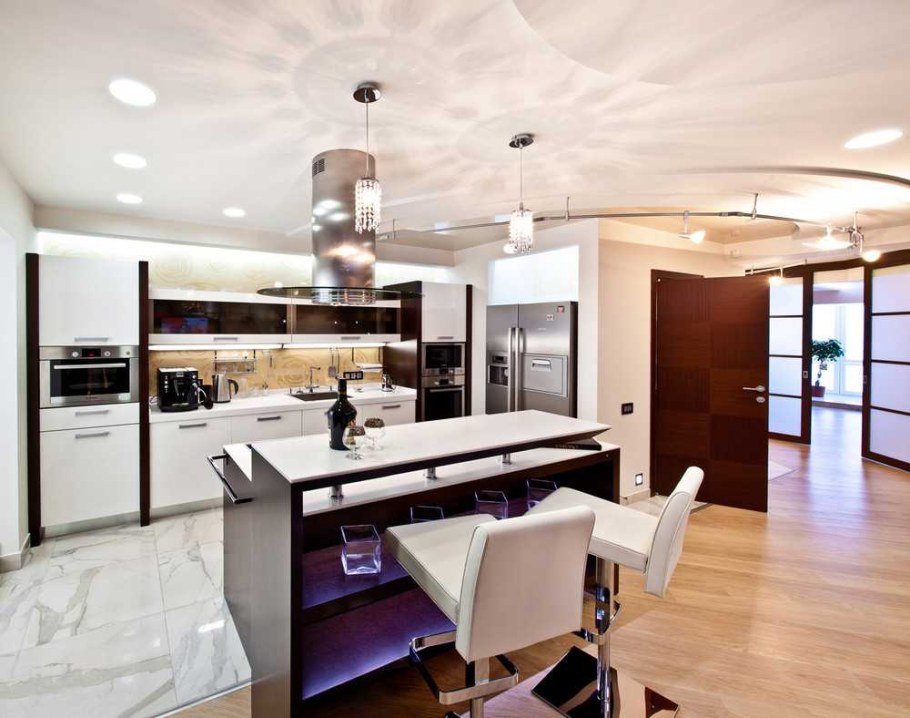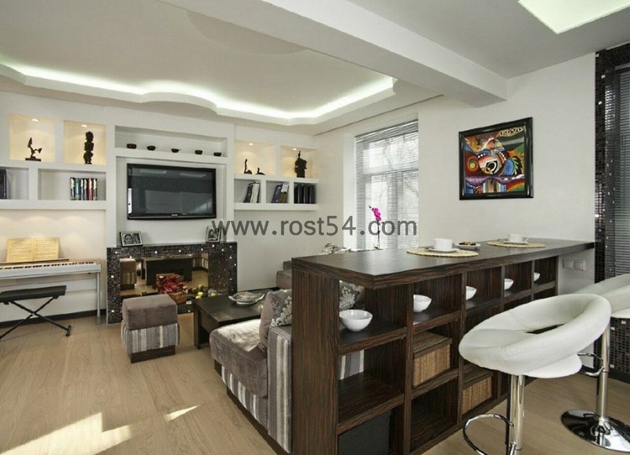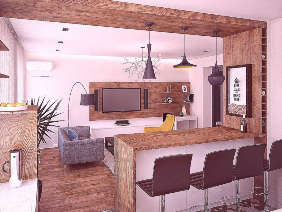 Кухня гостиная с встроенной барной стойкой посередине (77 фото)