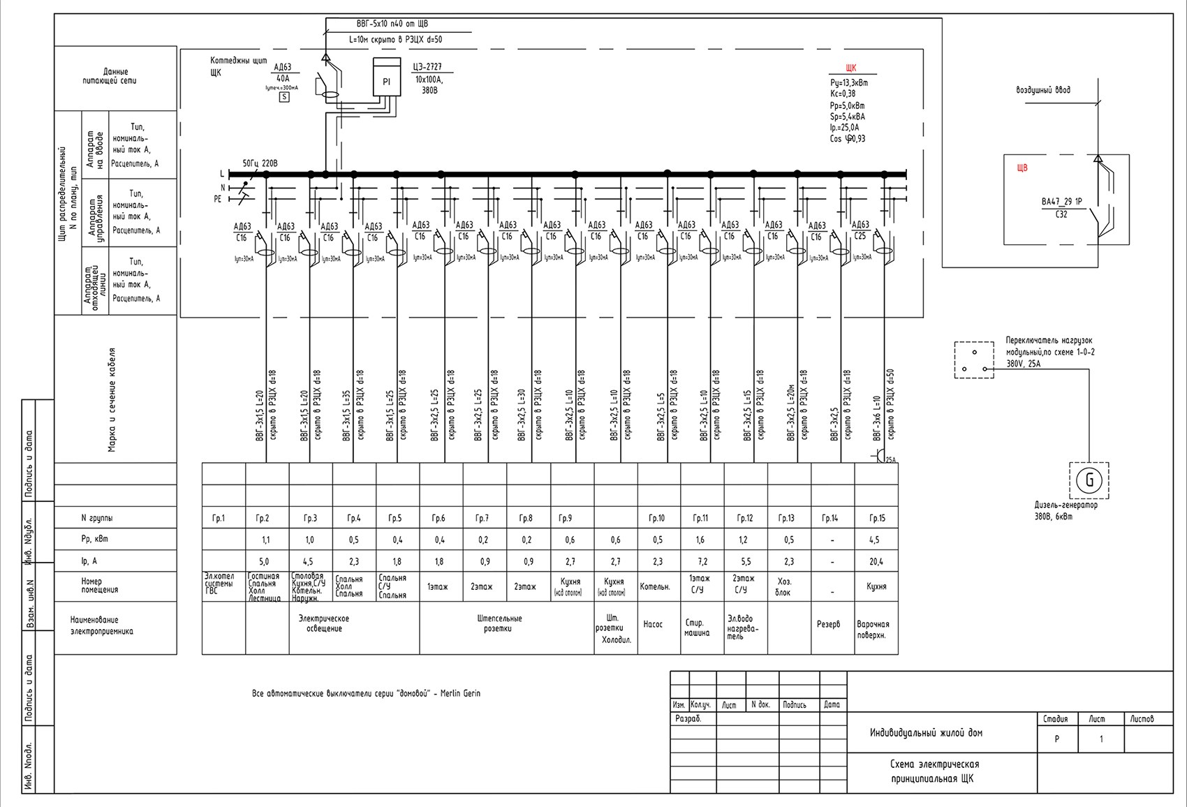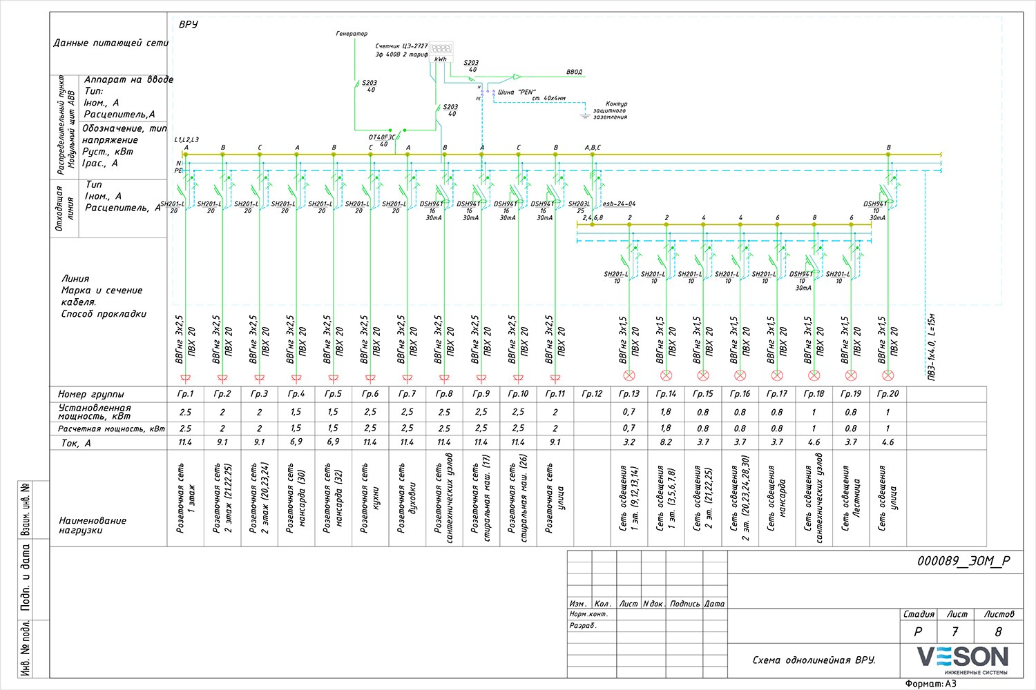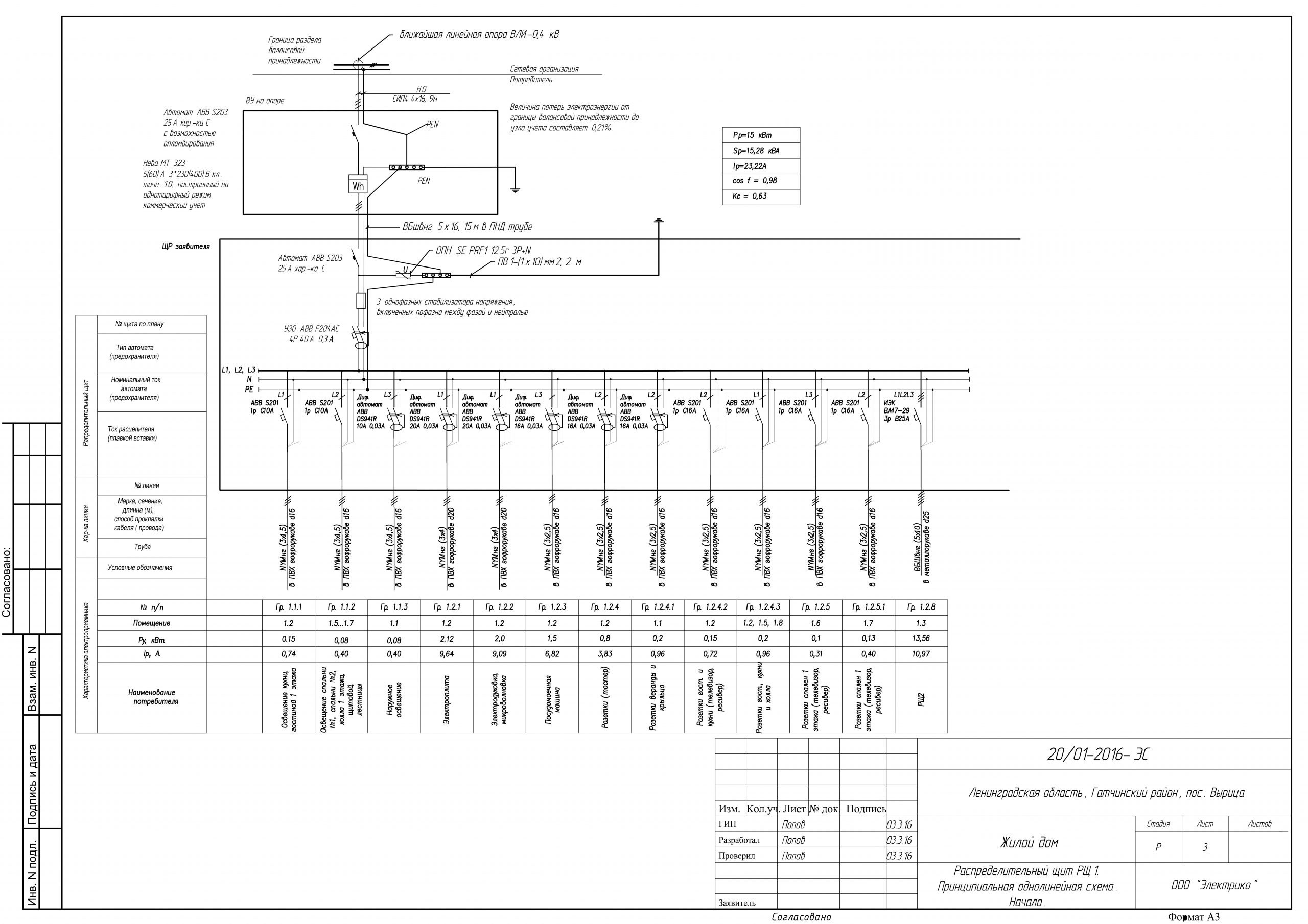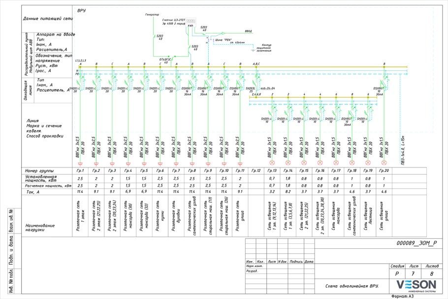 Однолинейная схема электроснабжения дома 15 КВТ