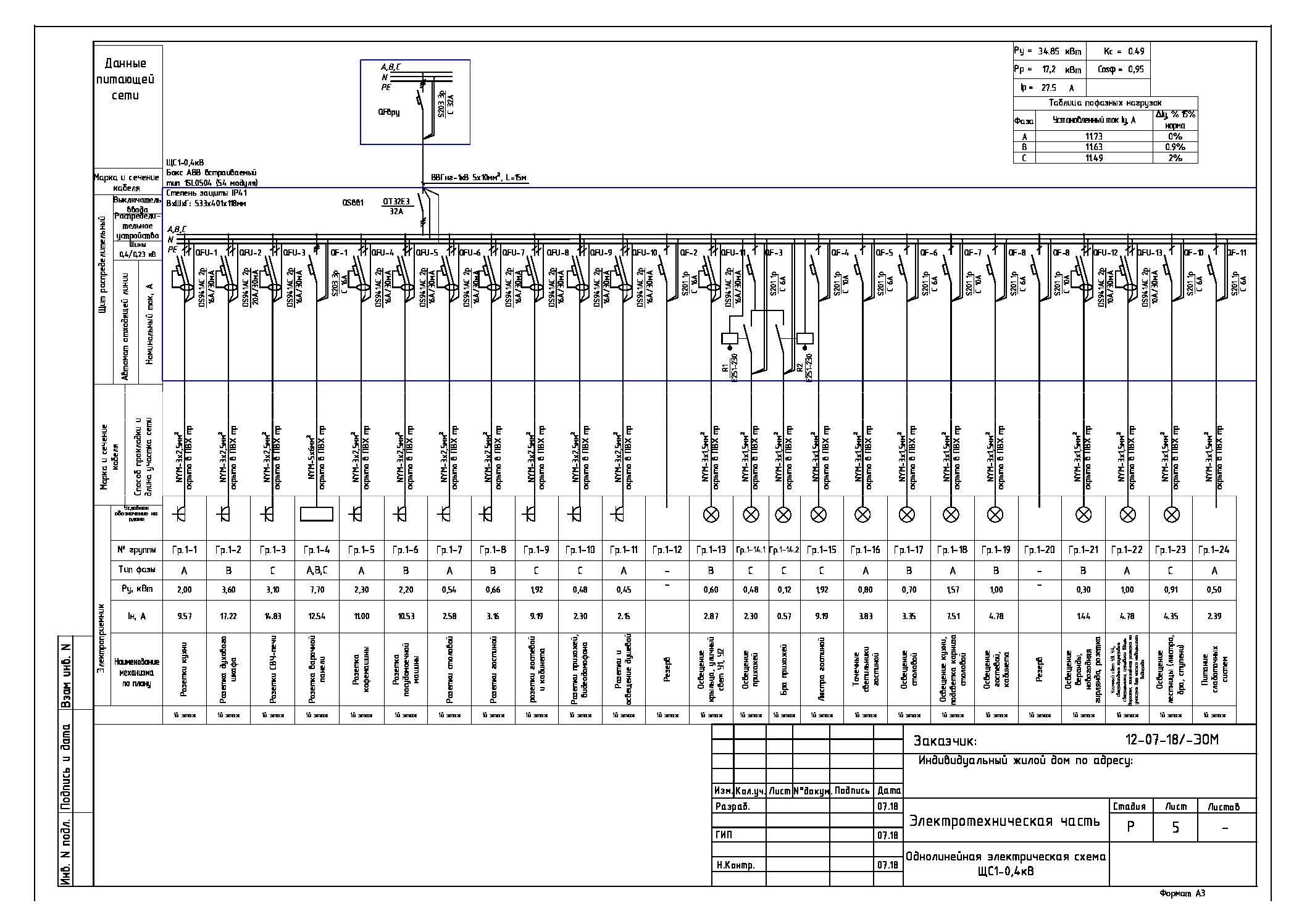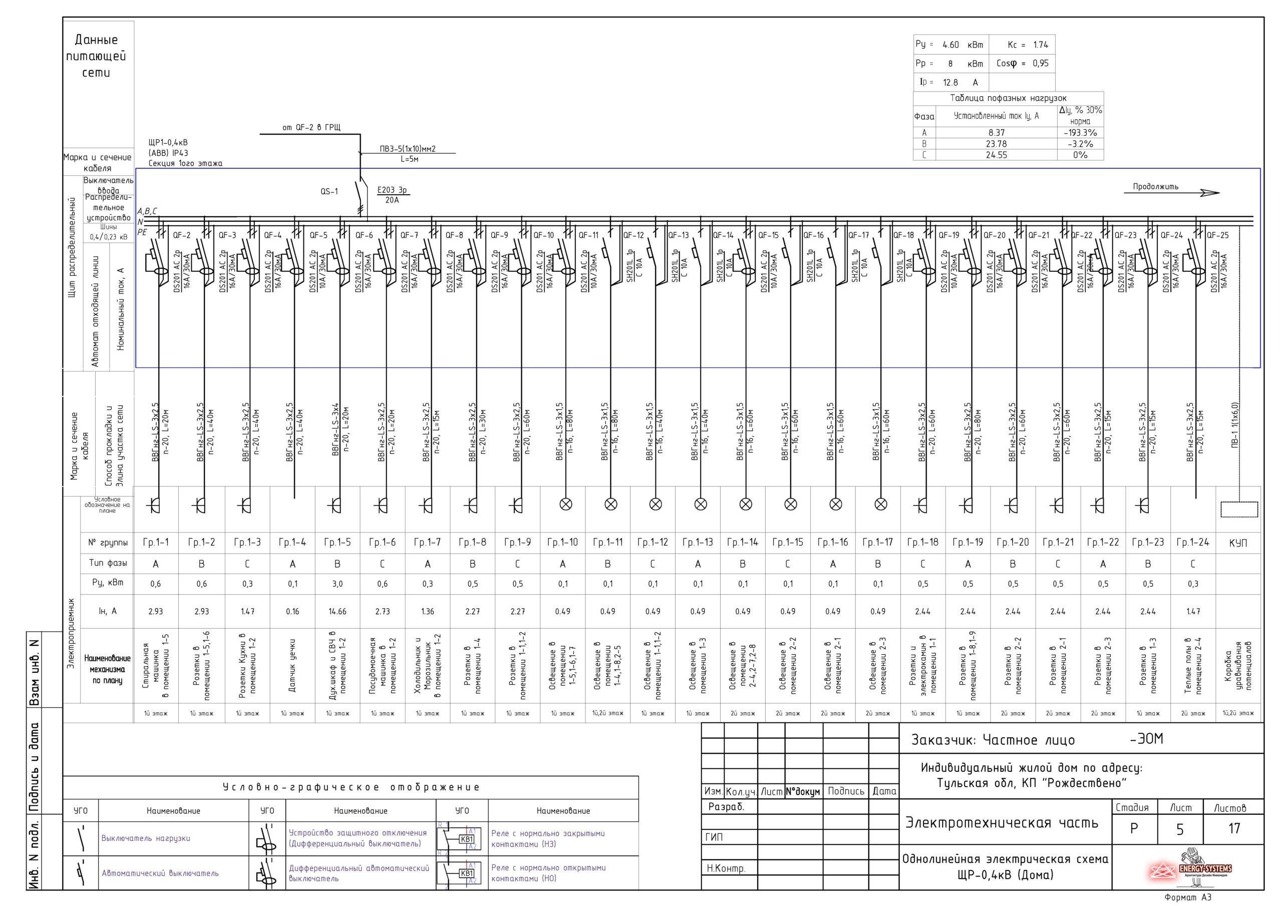 Однолинейная схема электроснабжения частного дома 15 КВТ 3 фазы