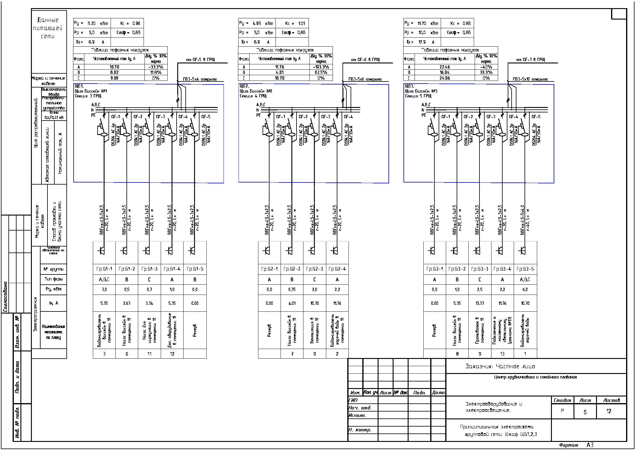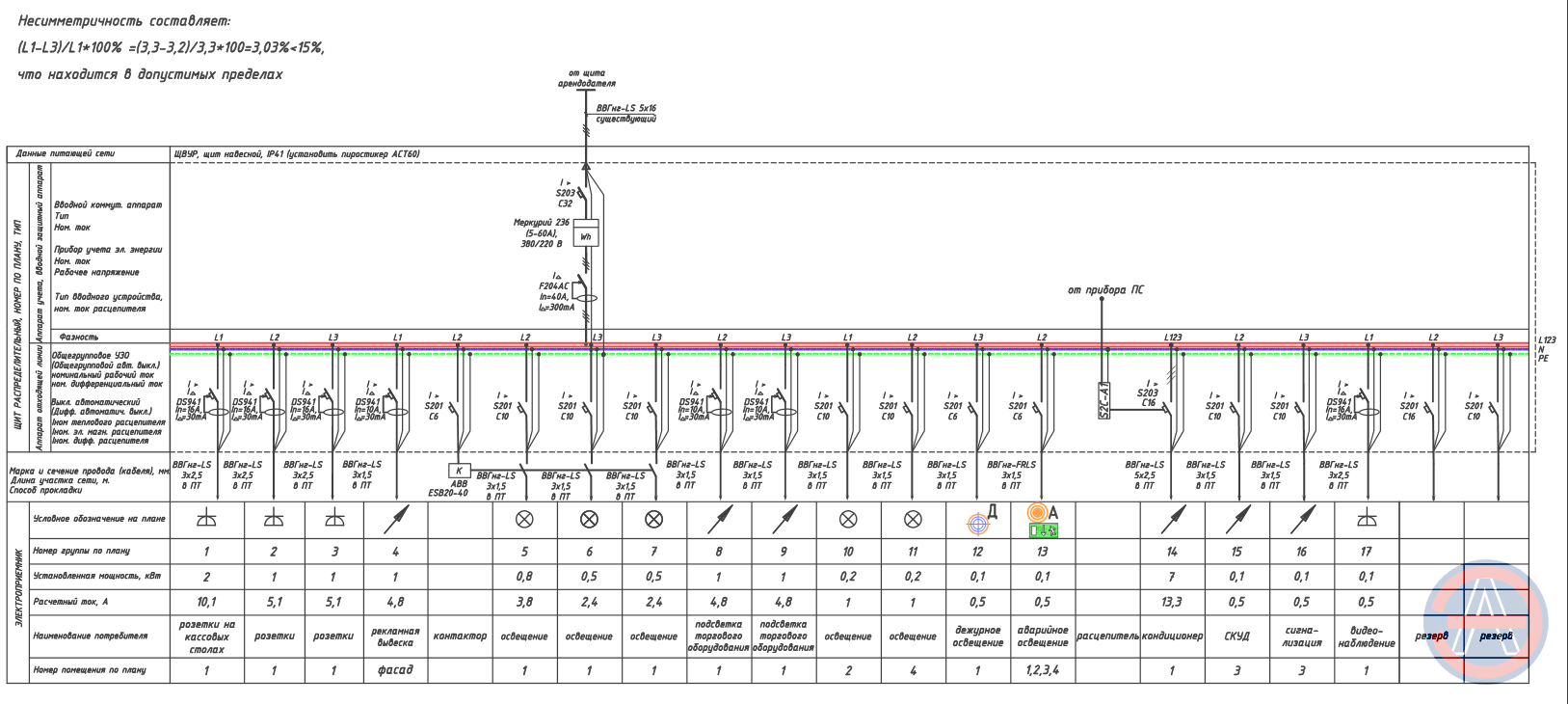 Однолинейная схема электроснабжения здания с 3х-фазным вводом