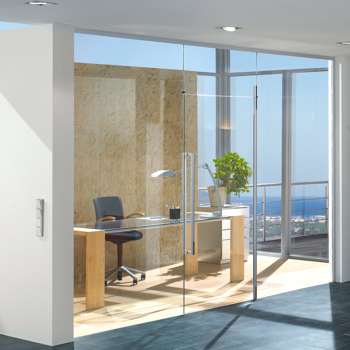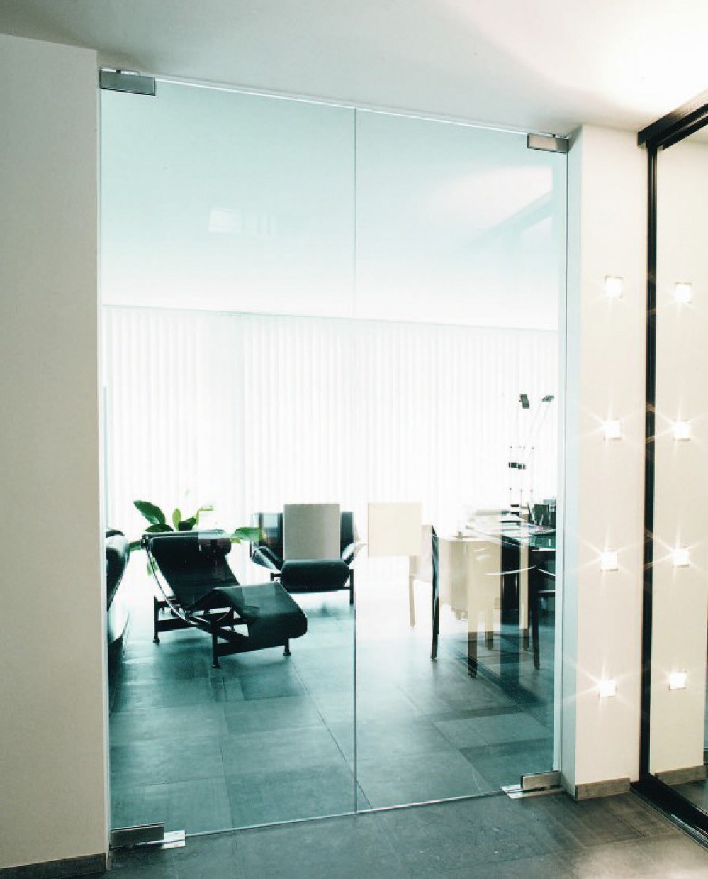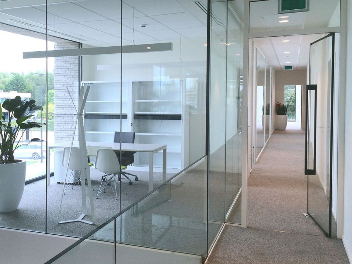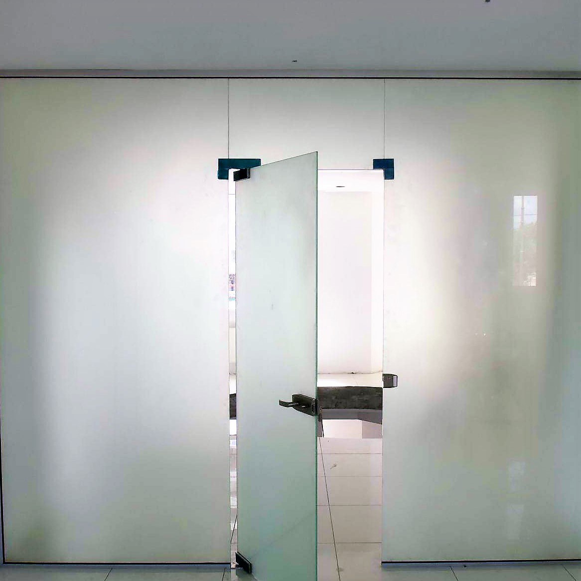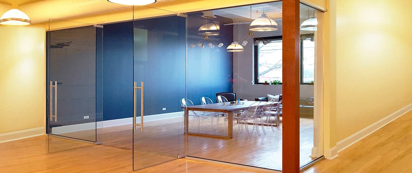 Стеклянная перегородка с маятниковой дверью