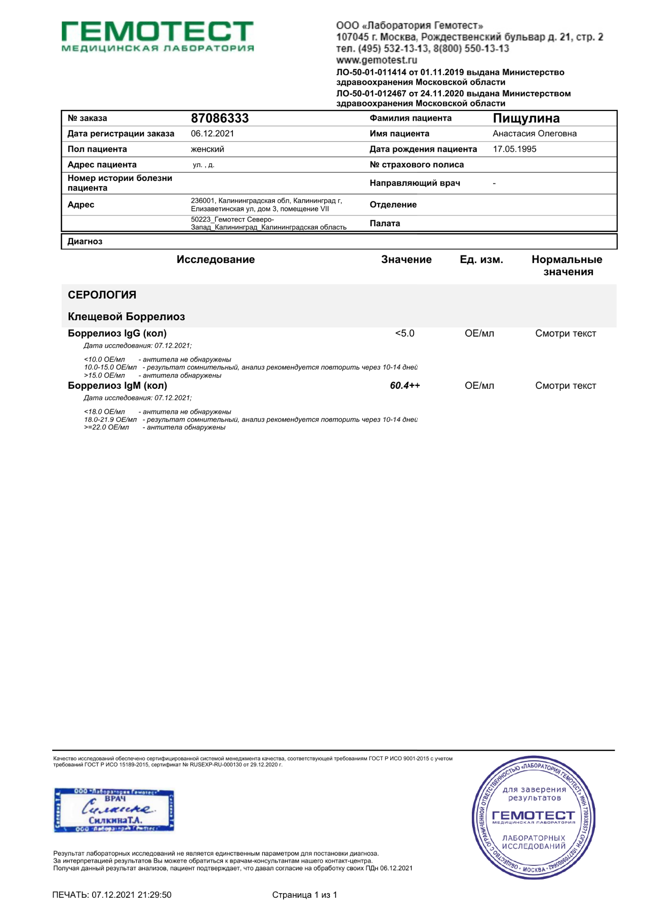 ПЦР Результаты анализов