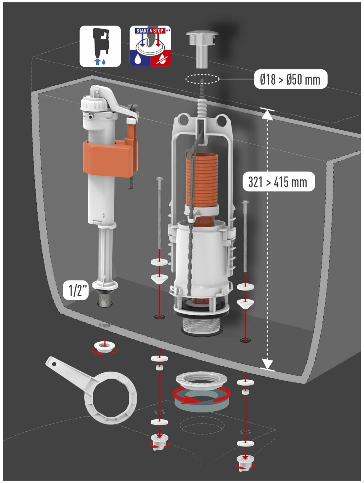 Арматура equation с нижней подводкой воды 1/2", c двойной кнопкой смыва