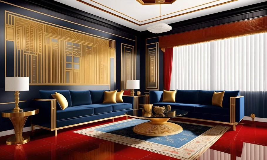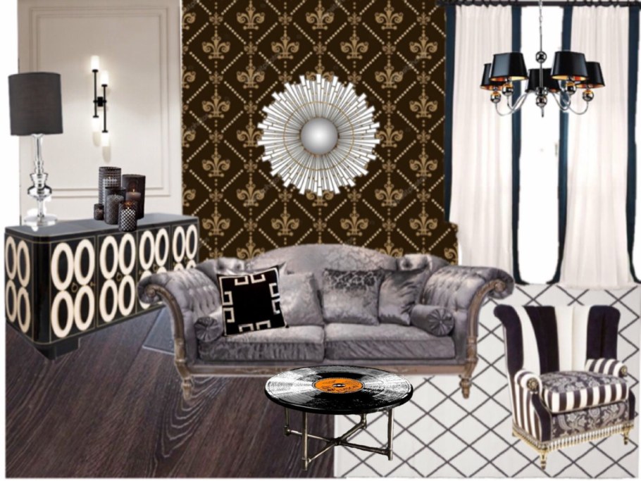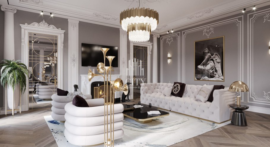Гостиная в стиле арт деко в светлых тонах с телевизором