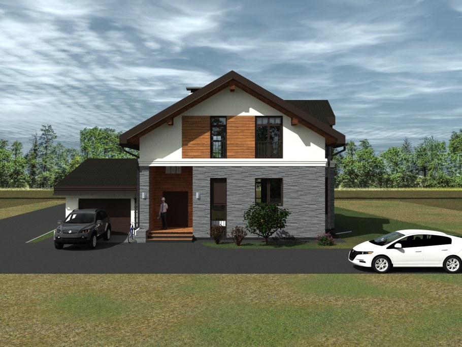 Проект двухэтажного коттеджа с двумя гаражами премиум желтый