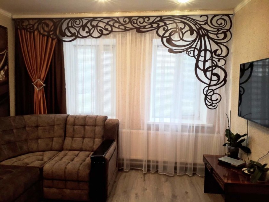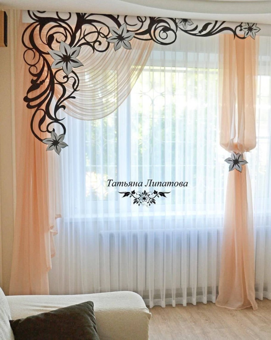 Шторы на зал коричневый и молочный с ажурным ламбрекеном