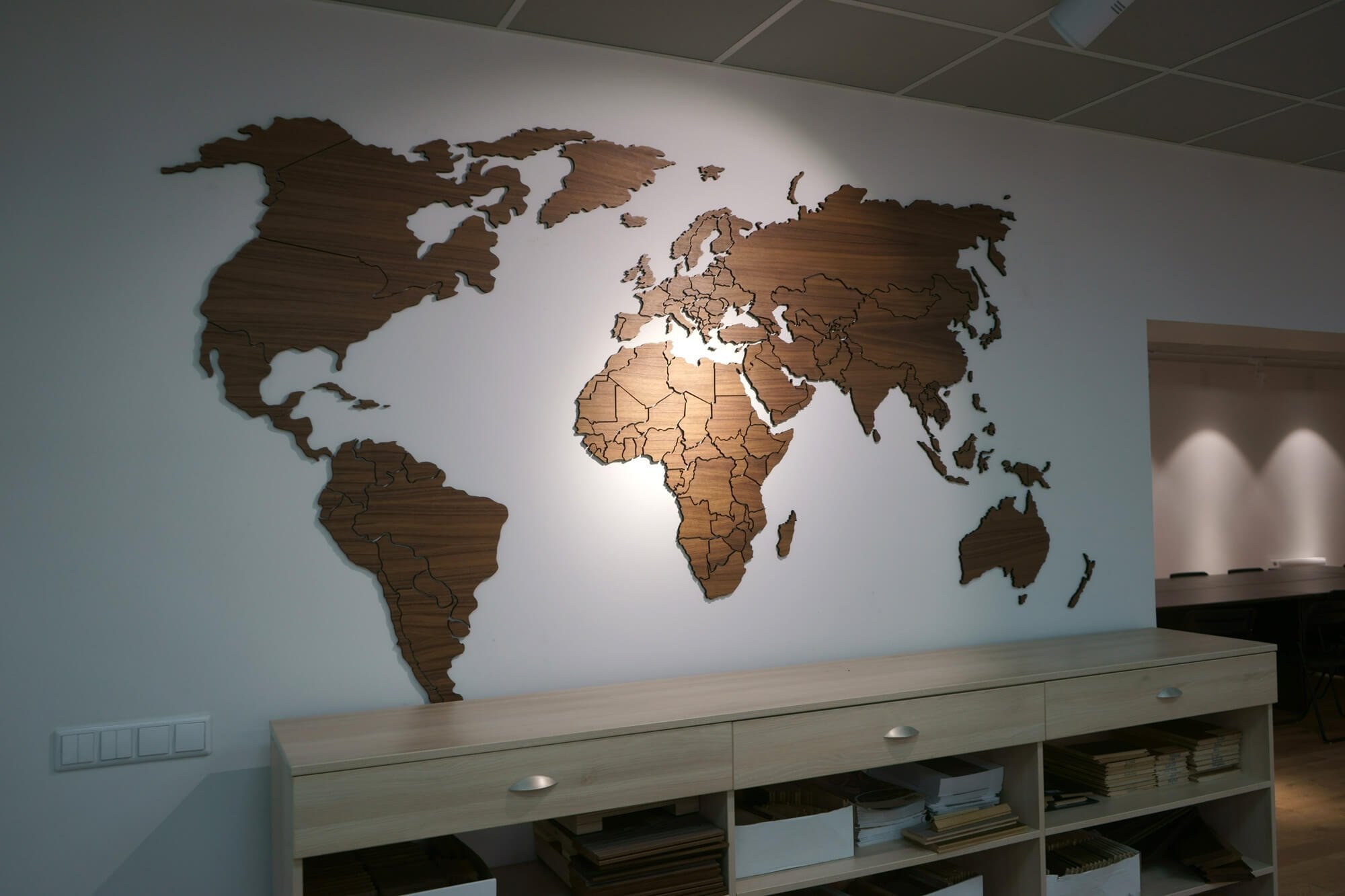 Карта мира из дерева в интерьере