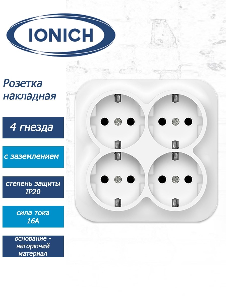 Розетка четырехместная серия ionich, у, 16а, 220в, белая (евросло