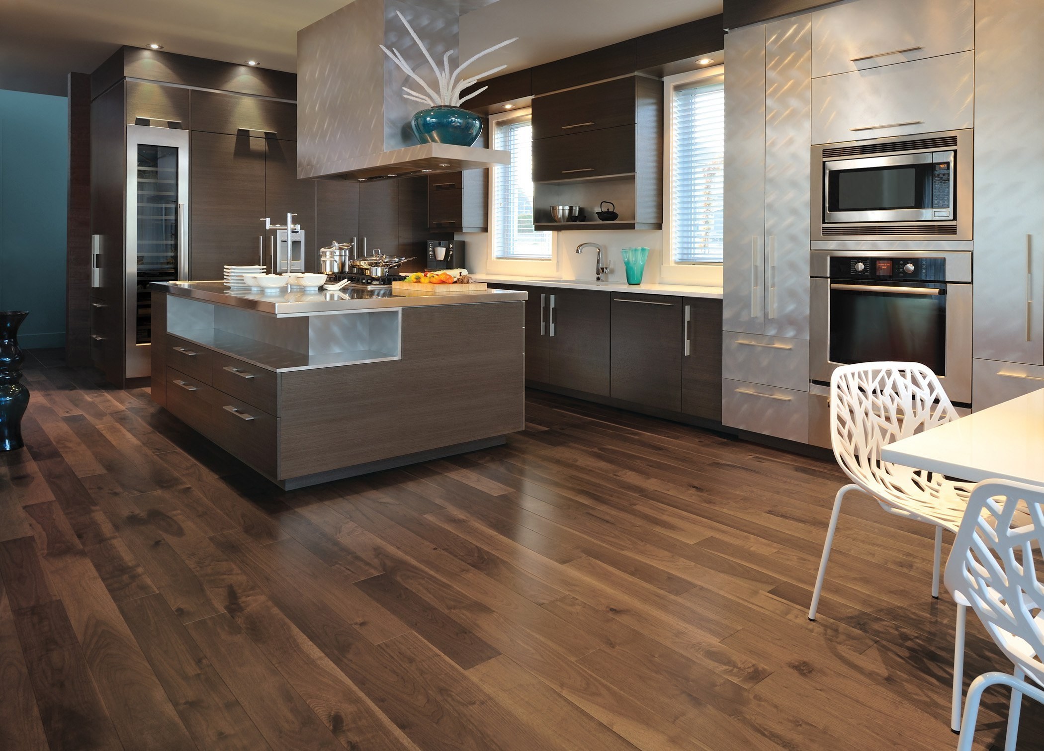 Интерьер кухни с коричневым полом