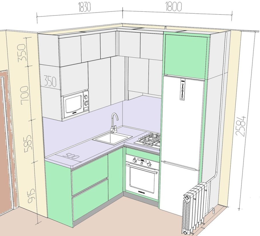 Кухонный гарнитур 3м прямой с холодильником чертеж
