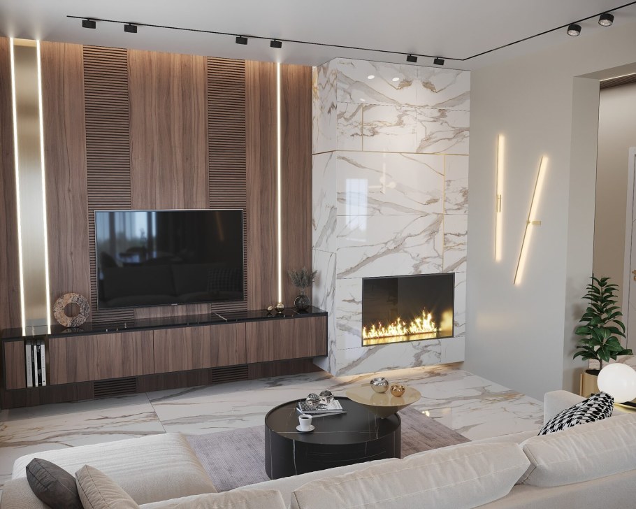 Камин и телевизор на одной стене в современном интерьере фото