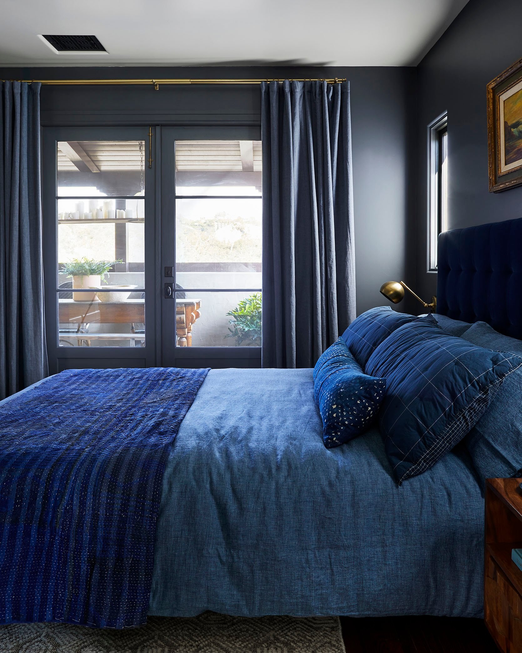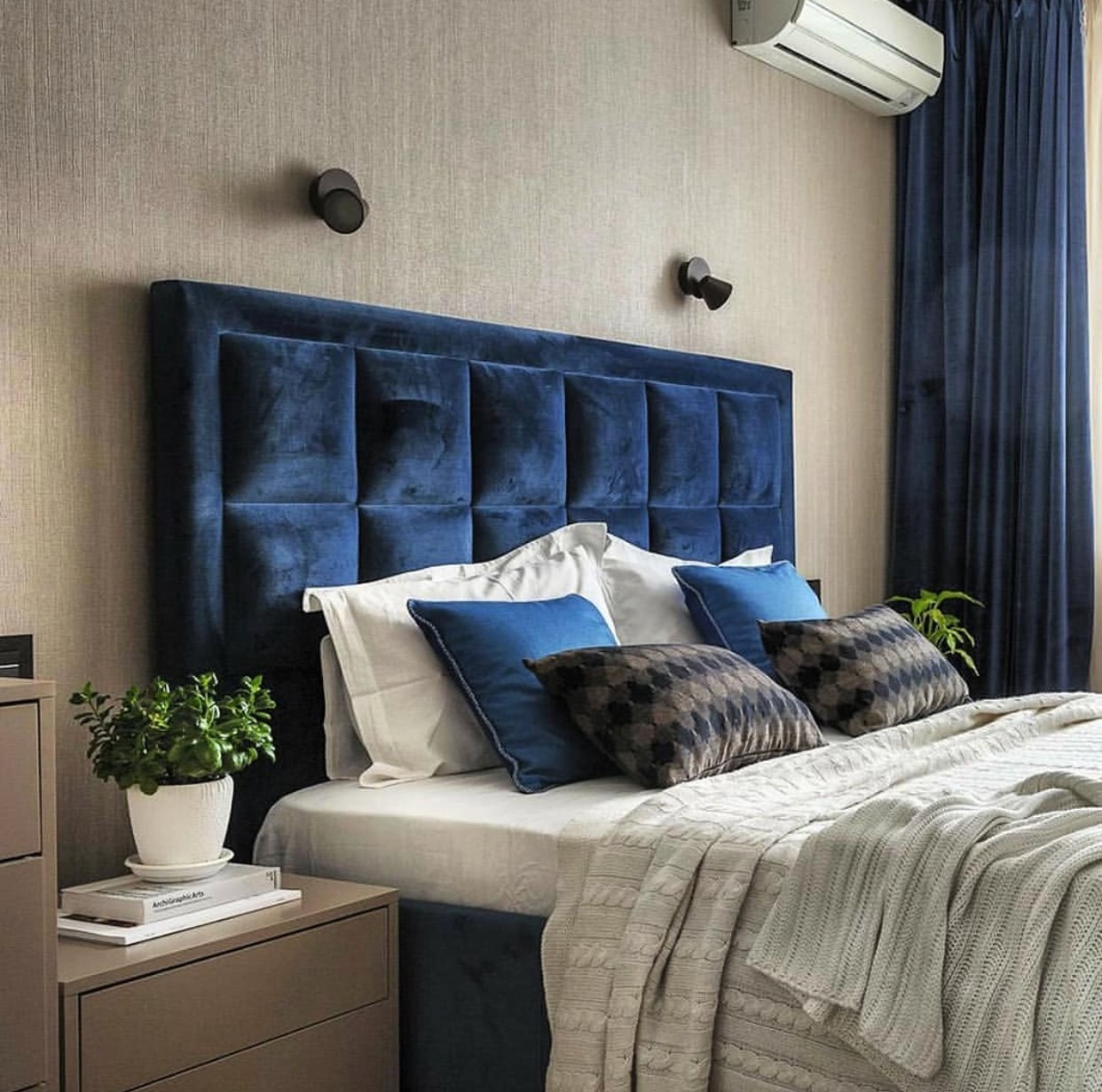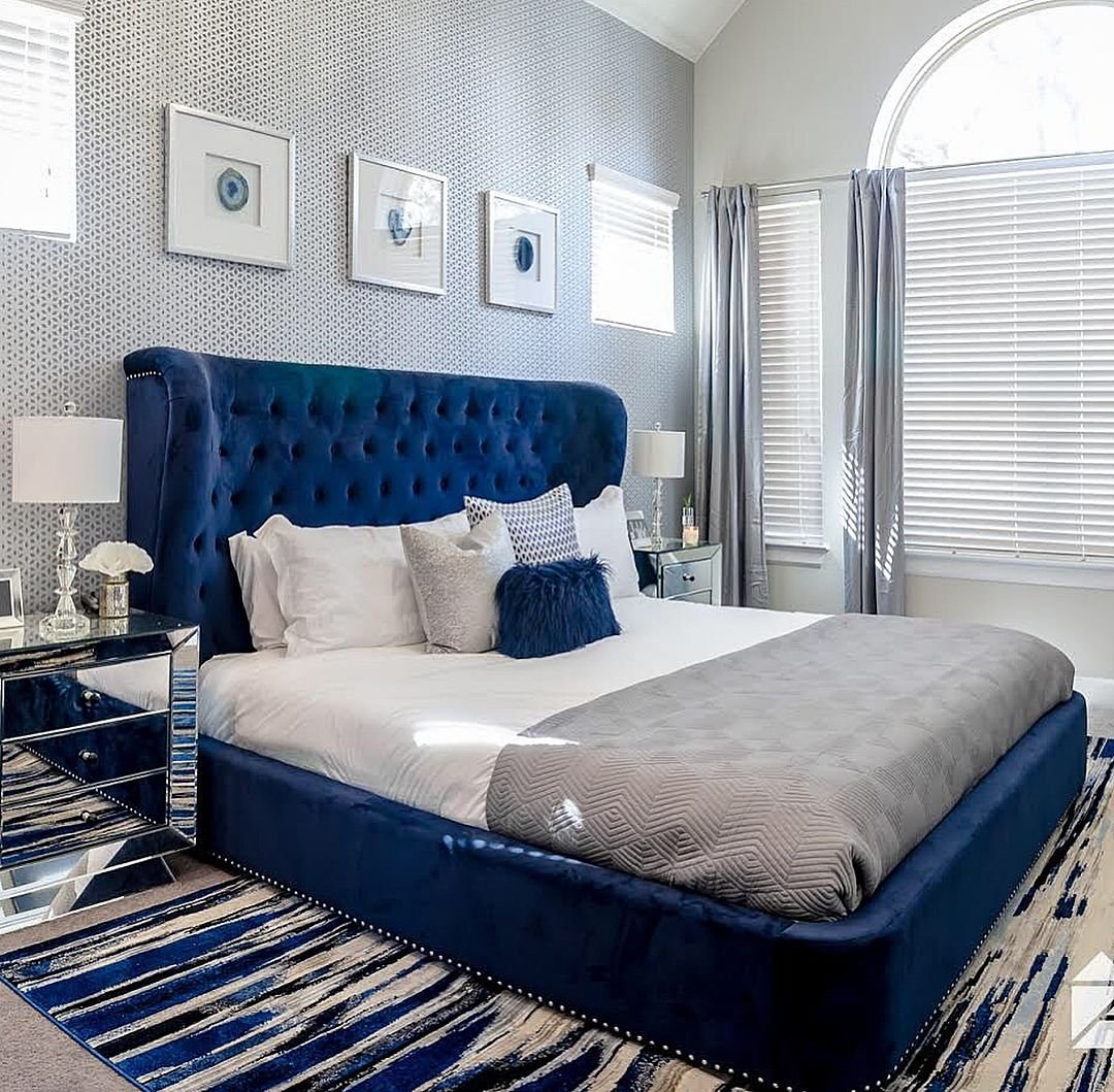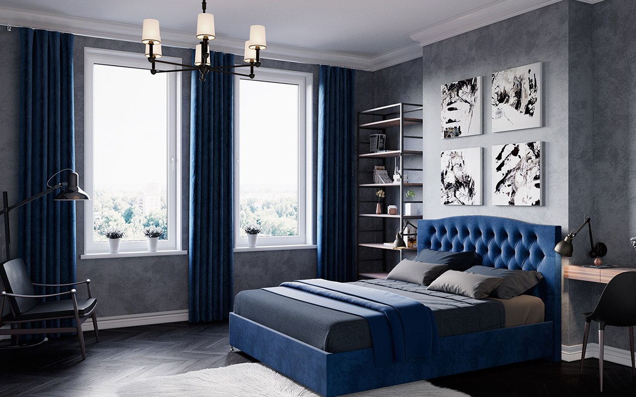 Темно синяя кровать в интерьере