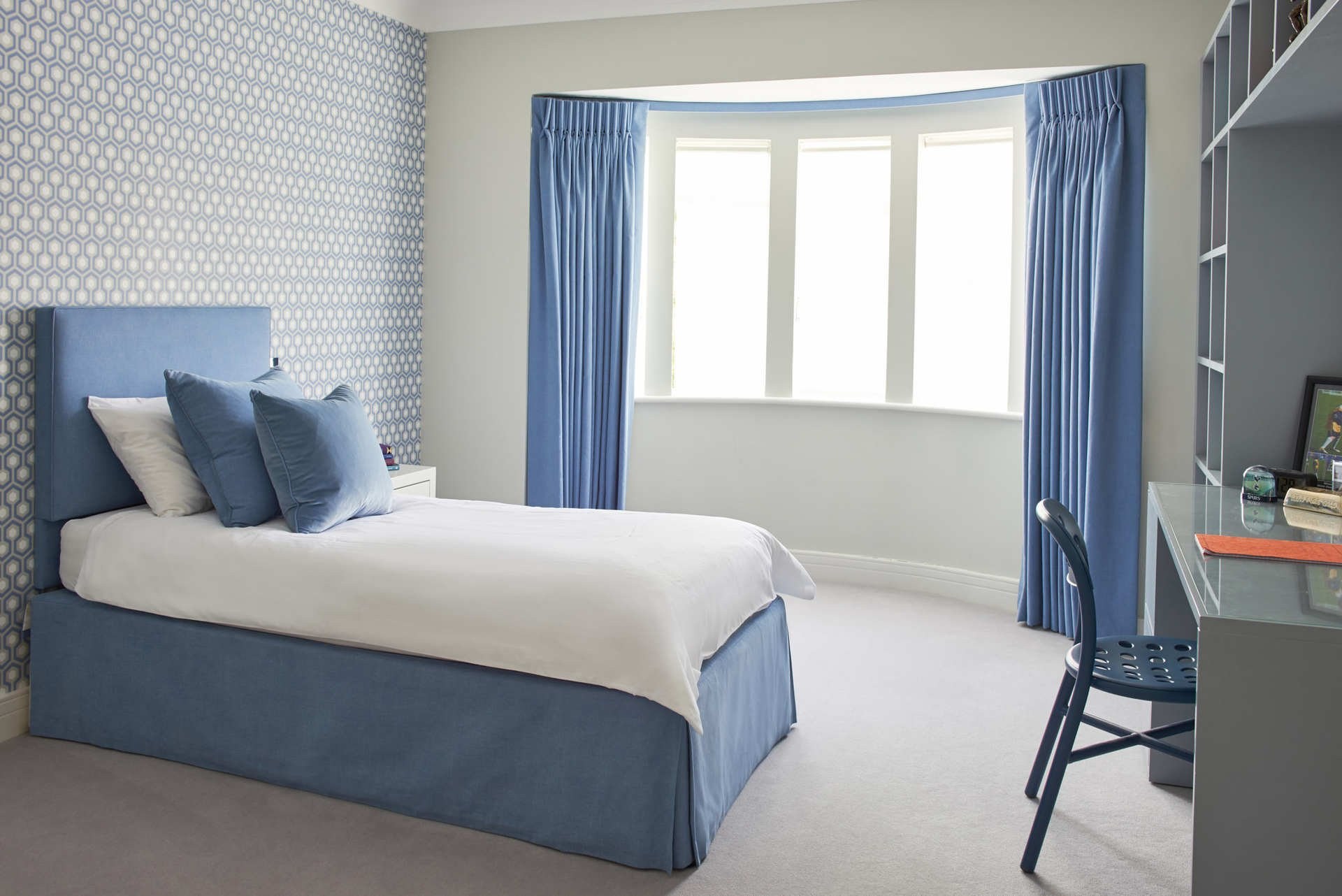 Какого цвета шторы с синей кроватью фото
