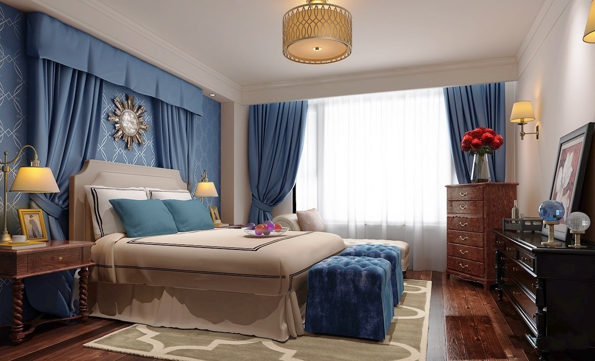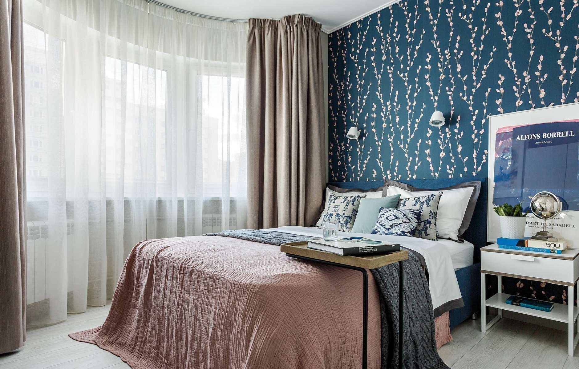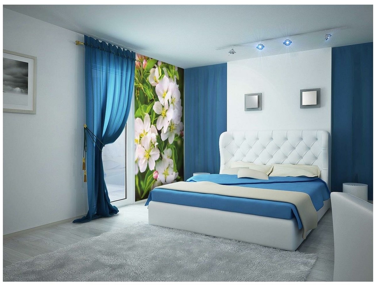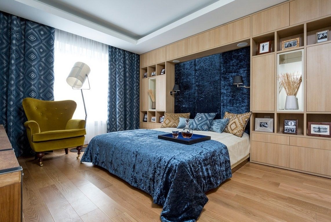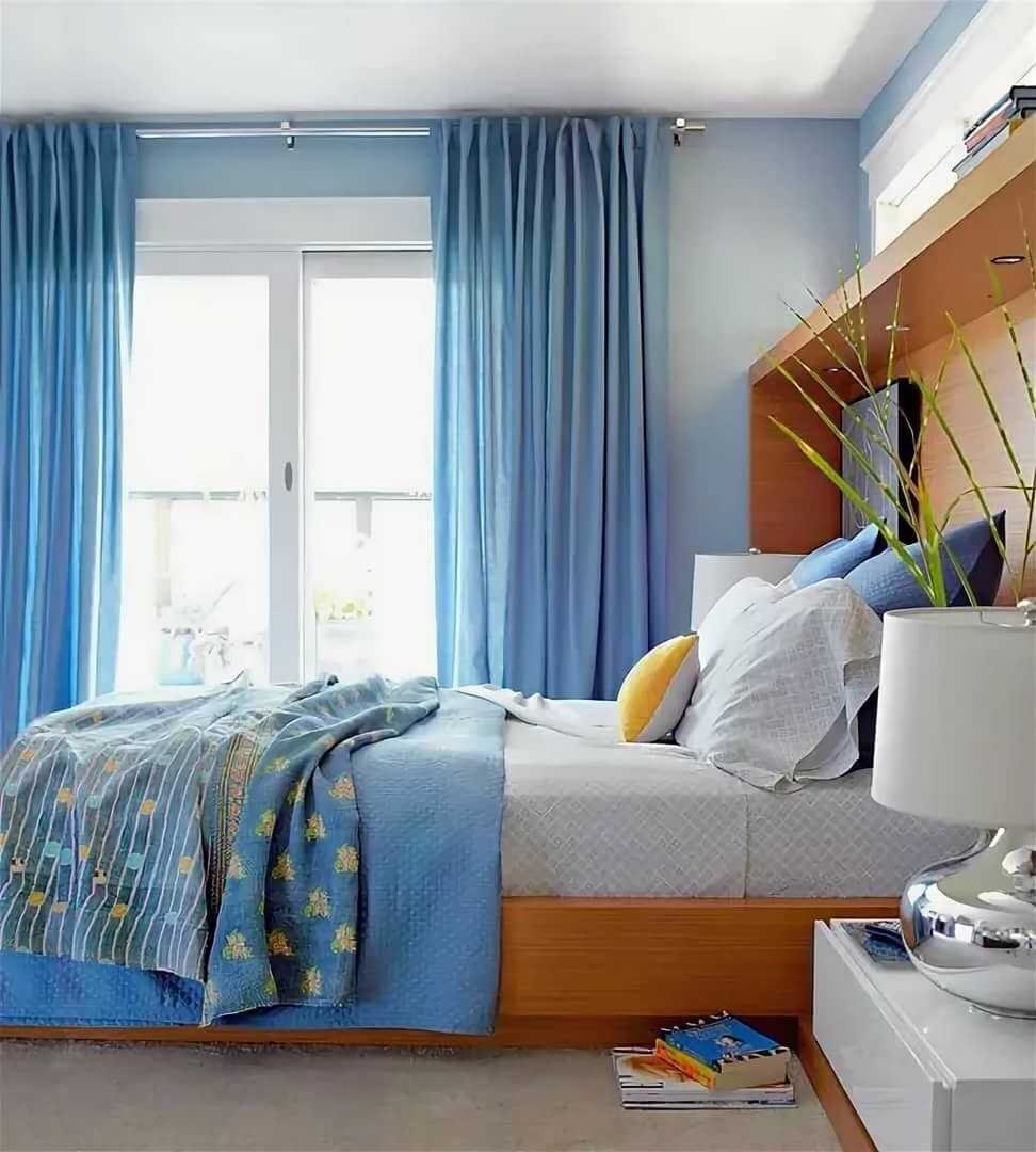 Синие шторы в интерьере спальни