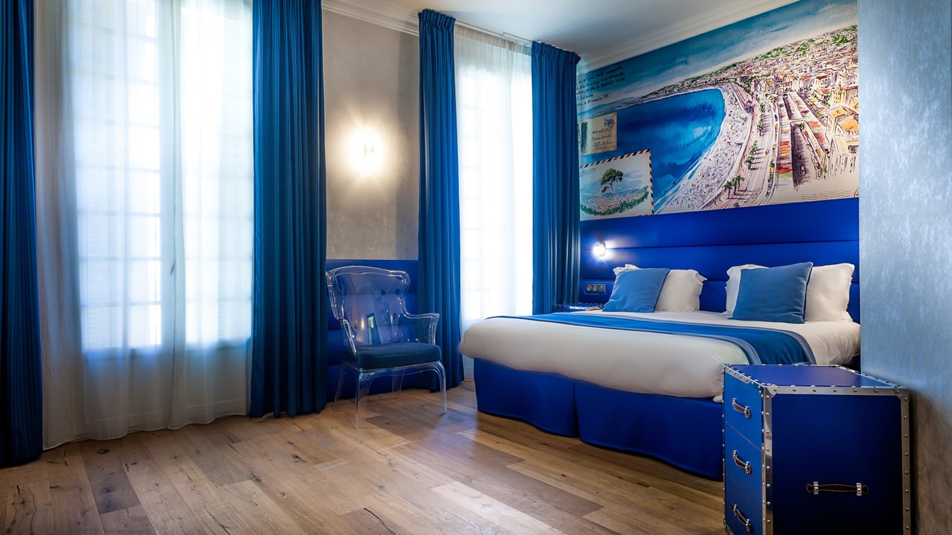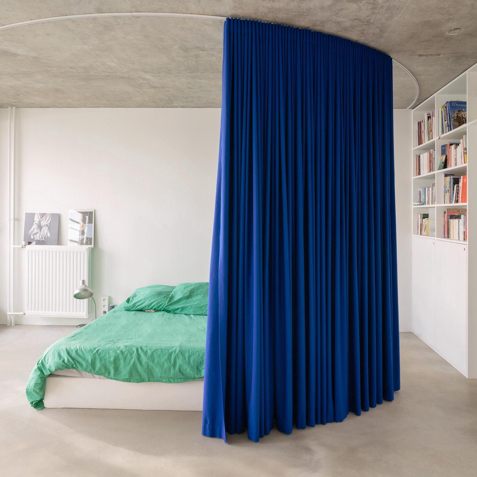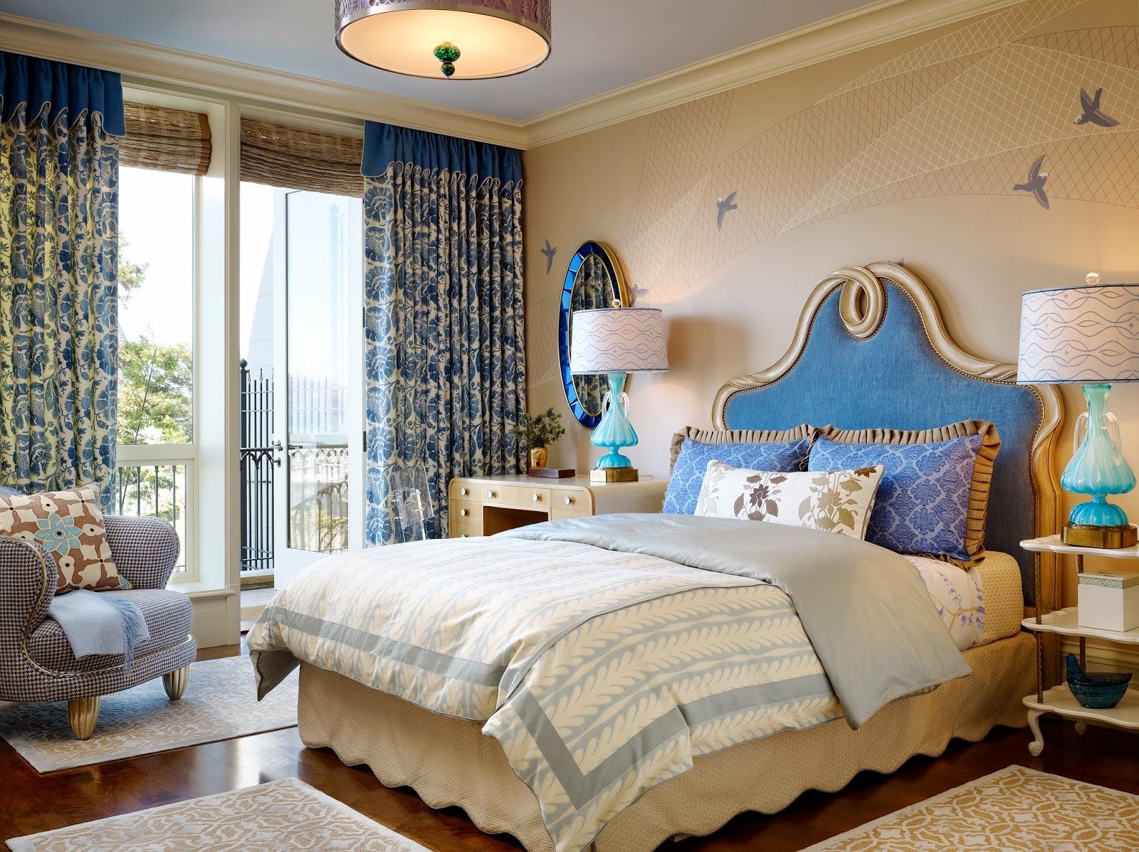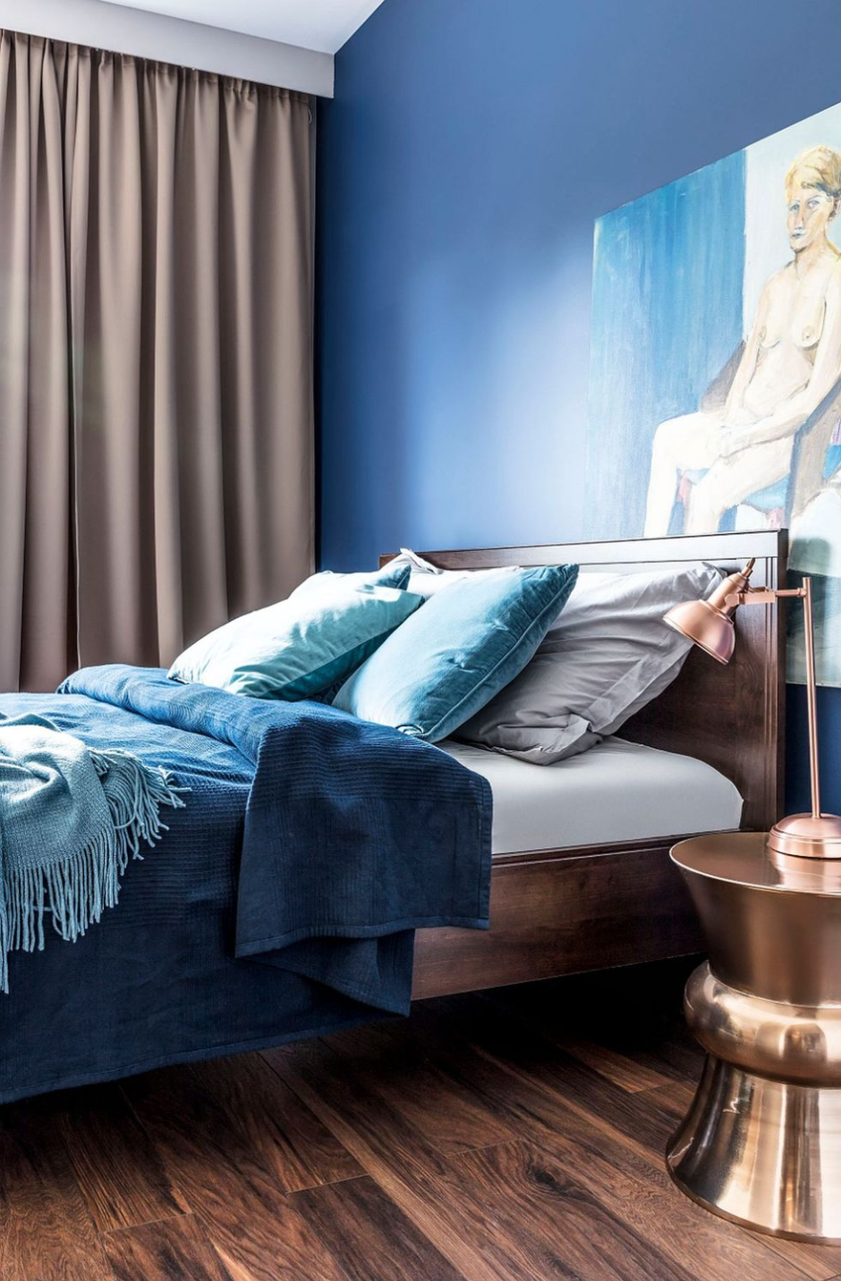 Синие шторы в интерьере спальни
