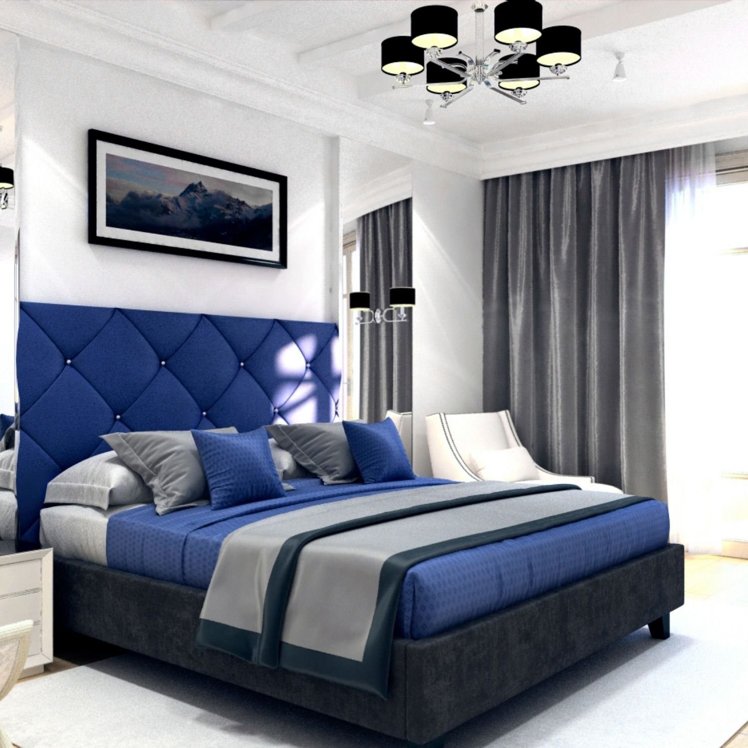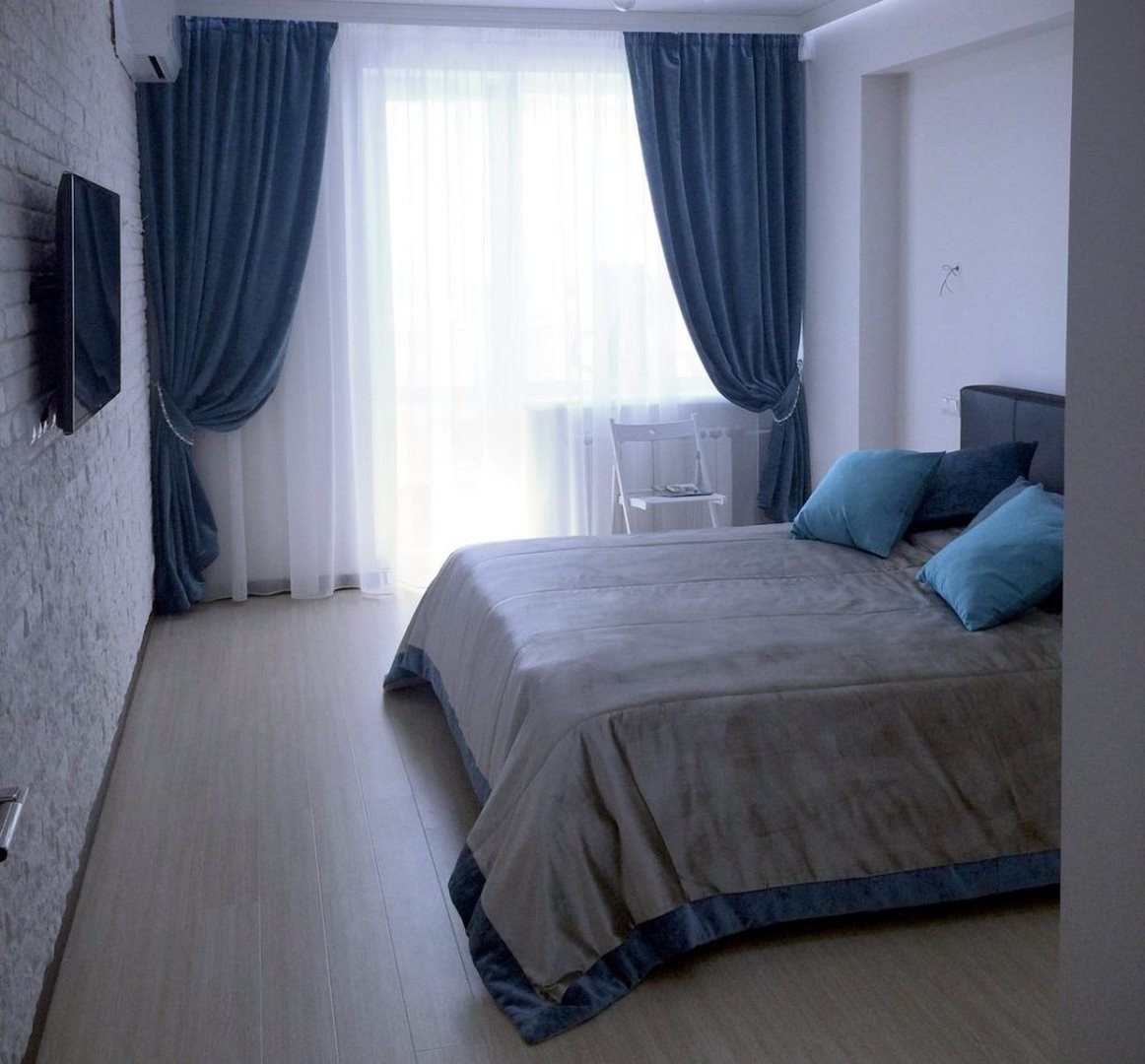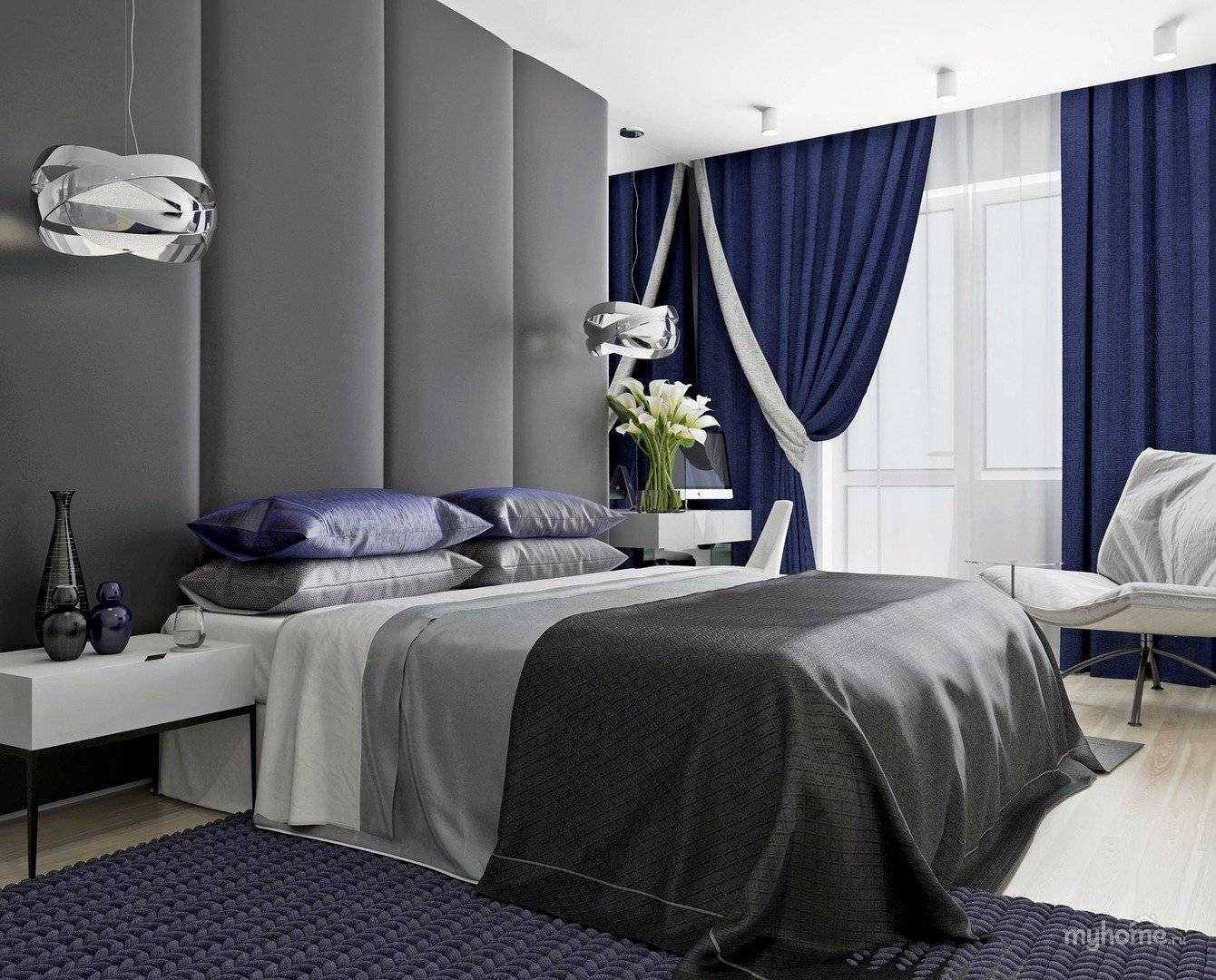 Серая спальня с синими шторами