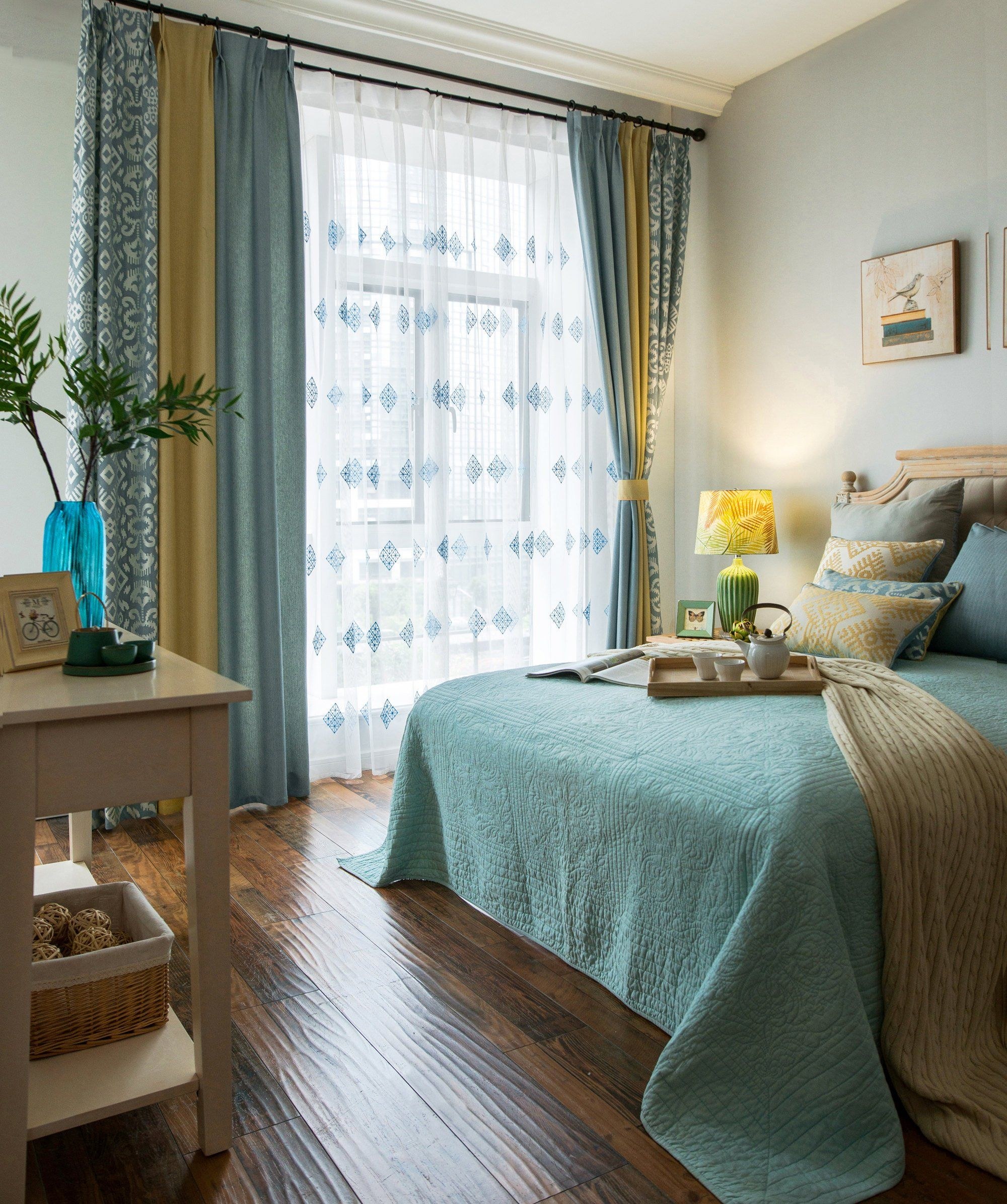 Бирюзовые шторы в спальне