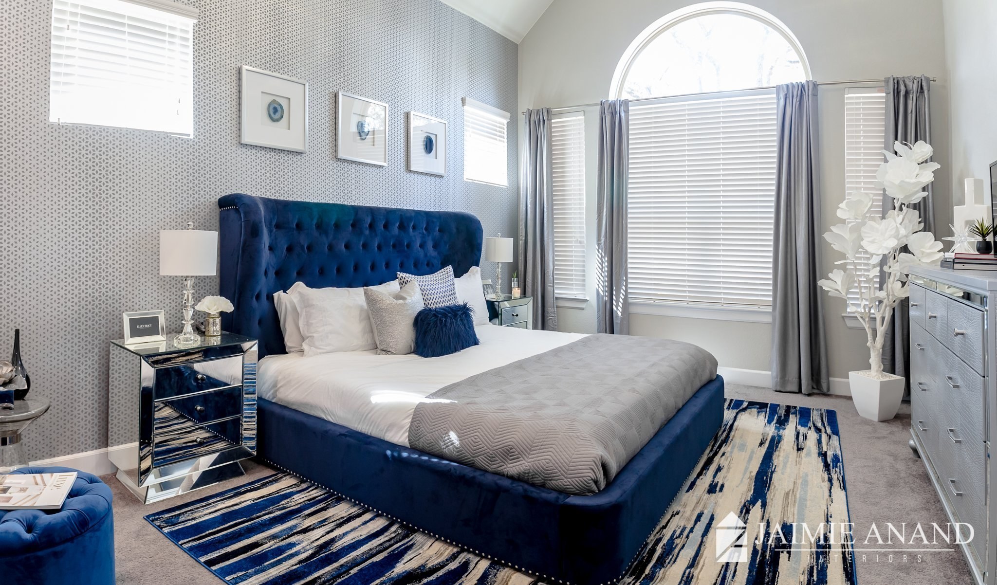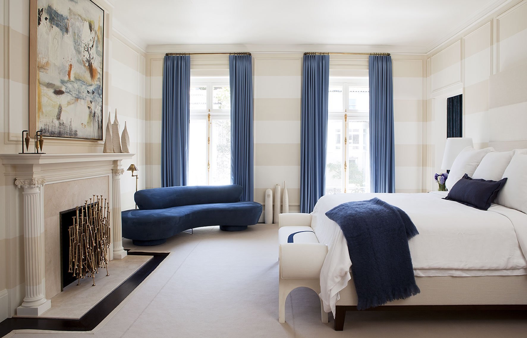 Белая спальня с синими шторами