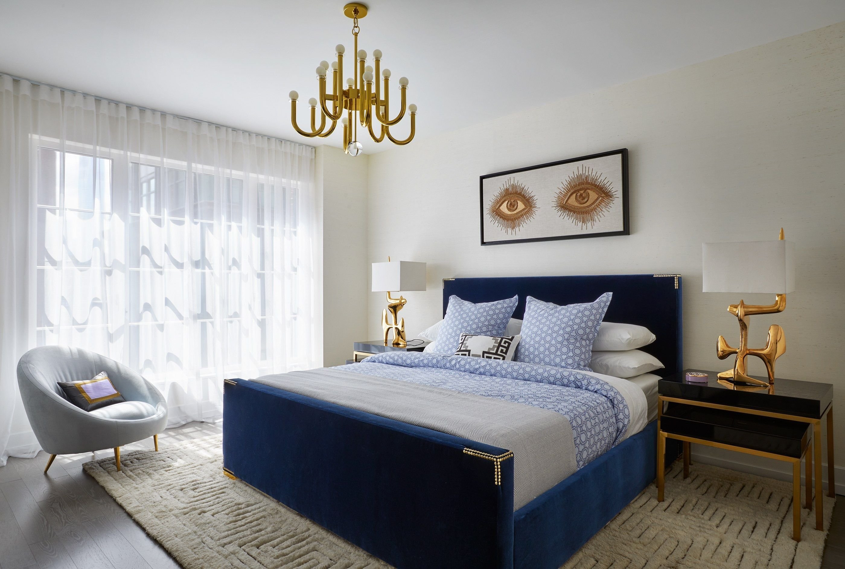 Синяя кровать в интерьере спальни