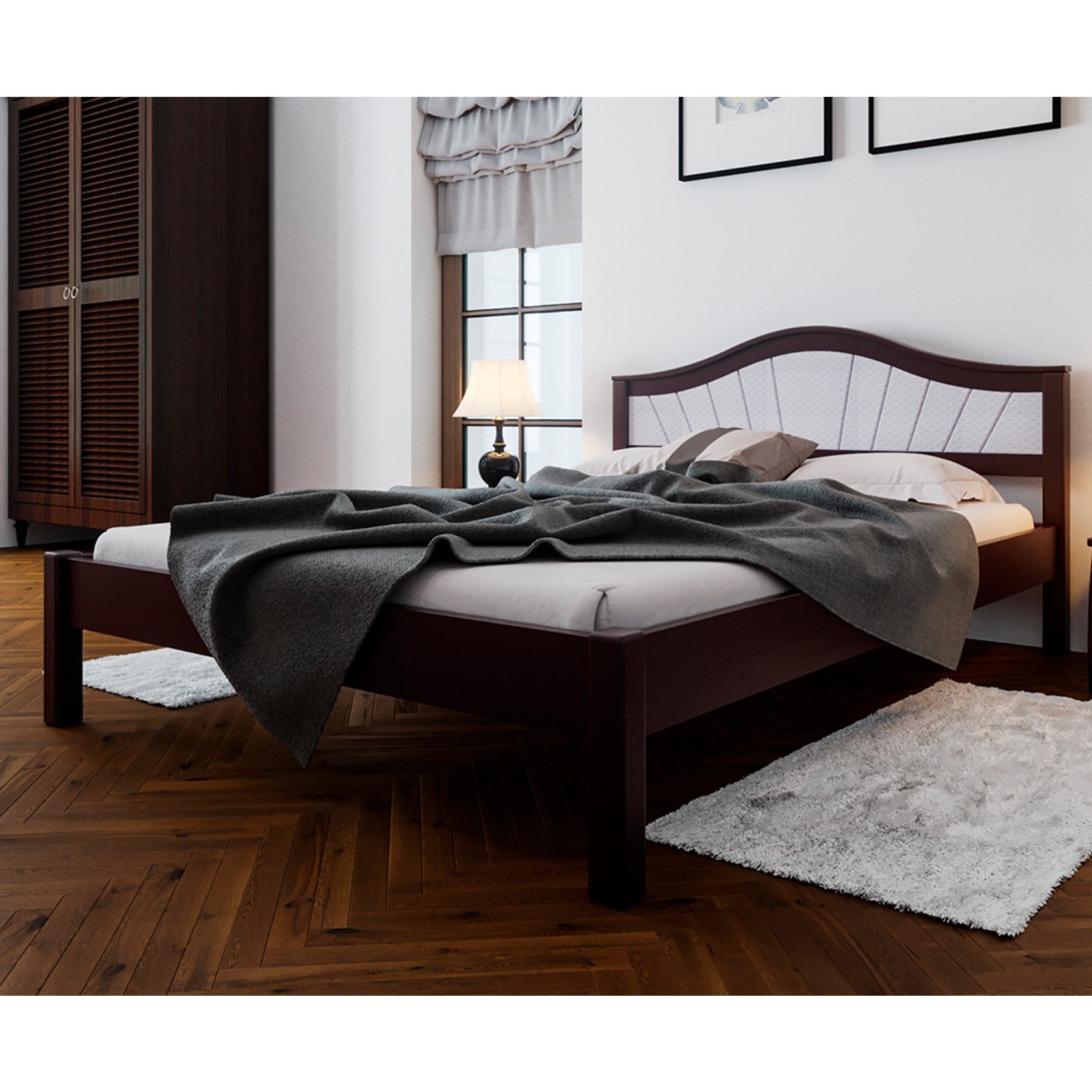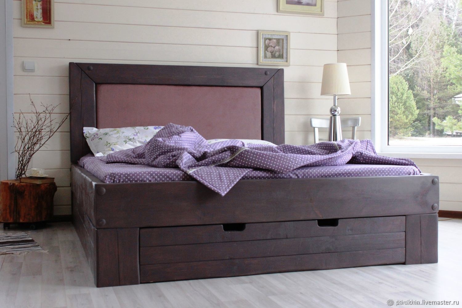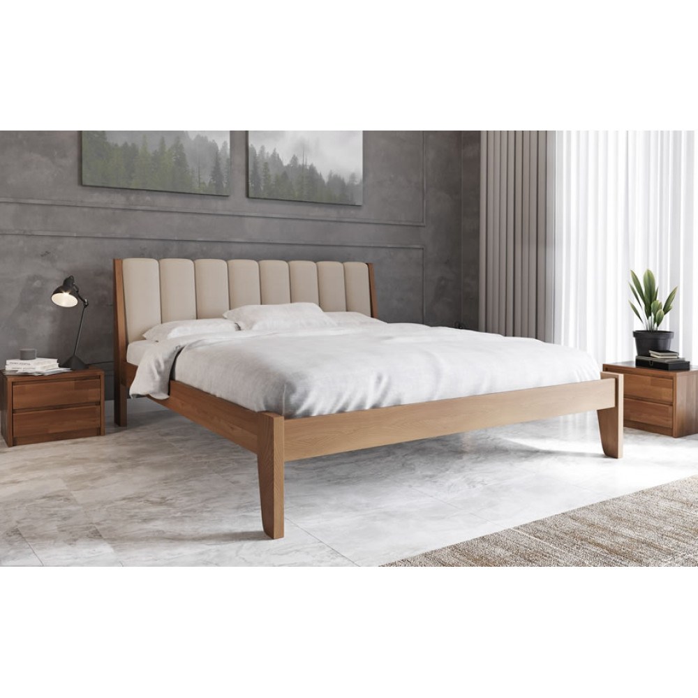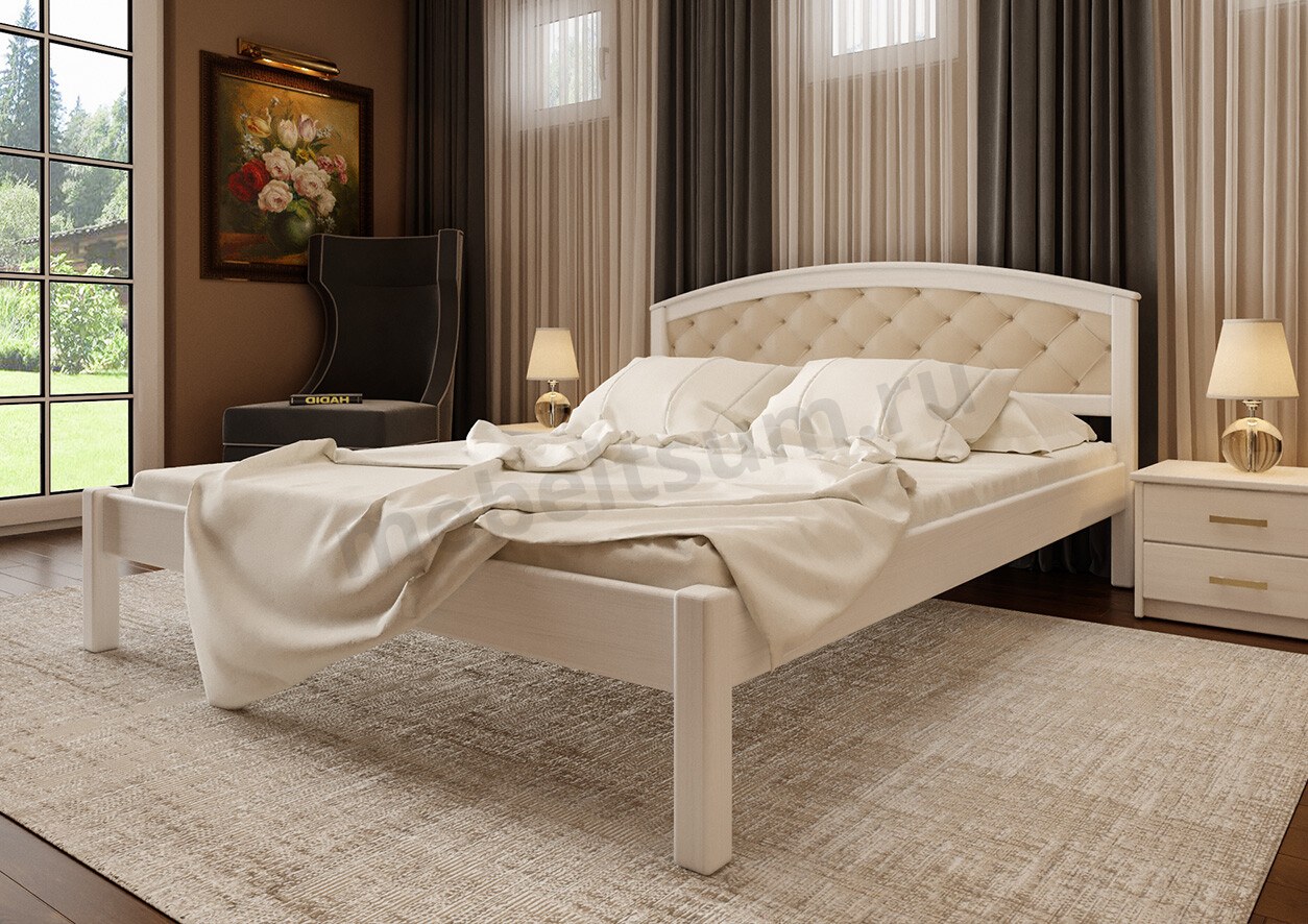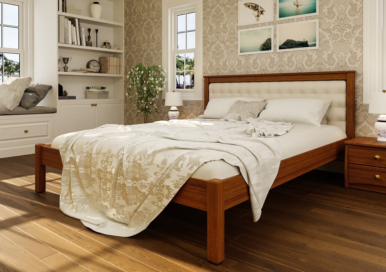 Кровать из массива дерева с мягким изголовьем (82 фото)