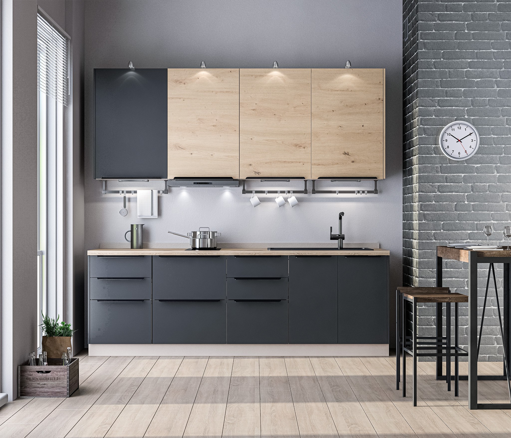 Кухонный гарнитур лофт Регина песочный/Диамант серый, дуб дикий 2,4 м
