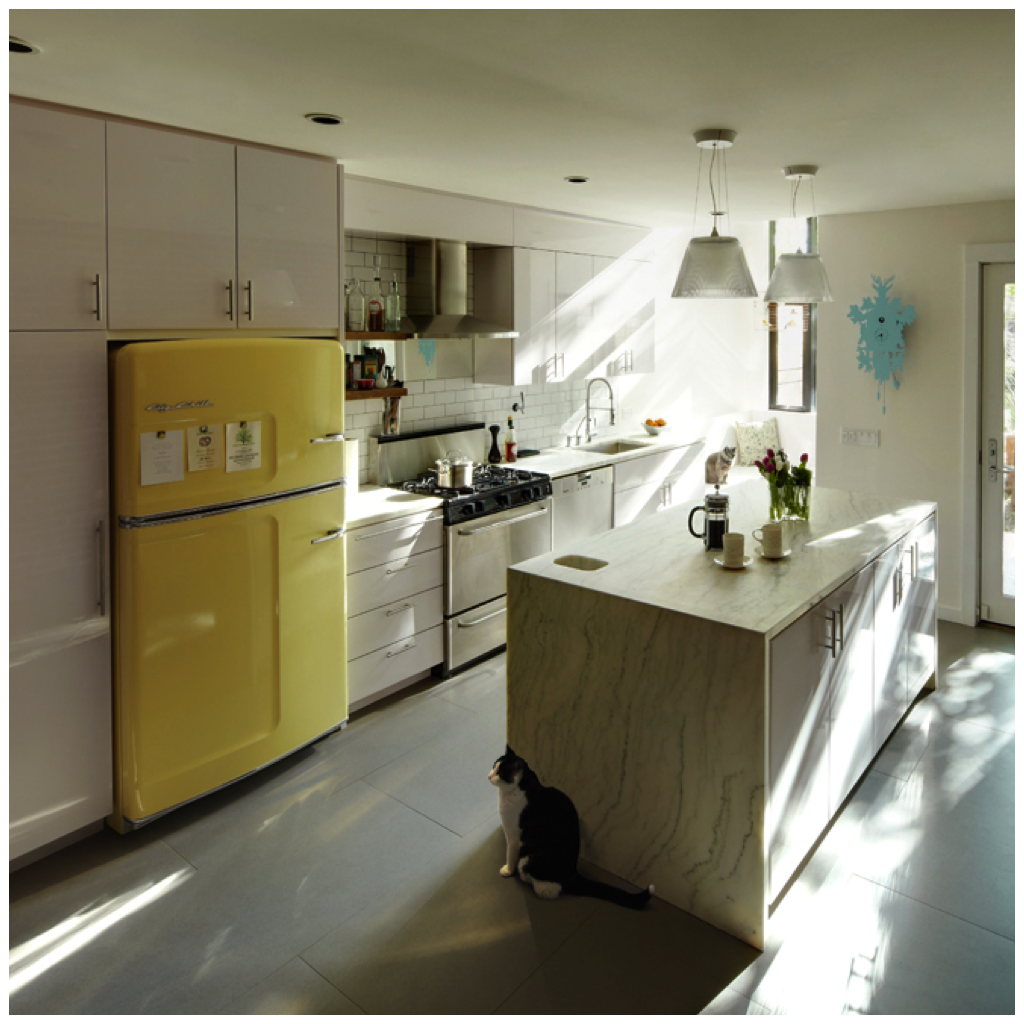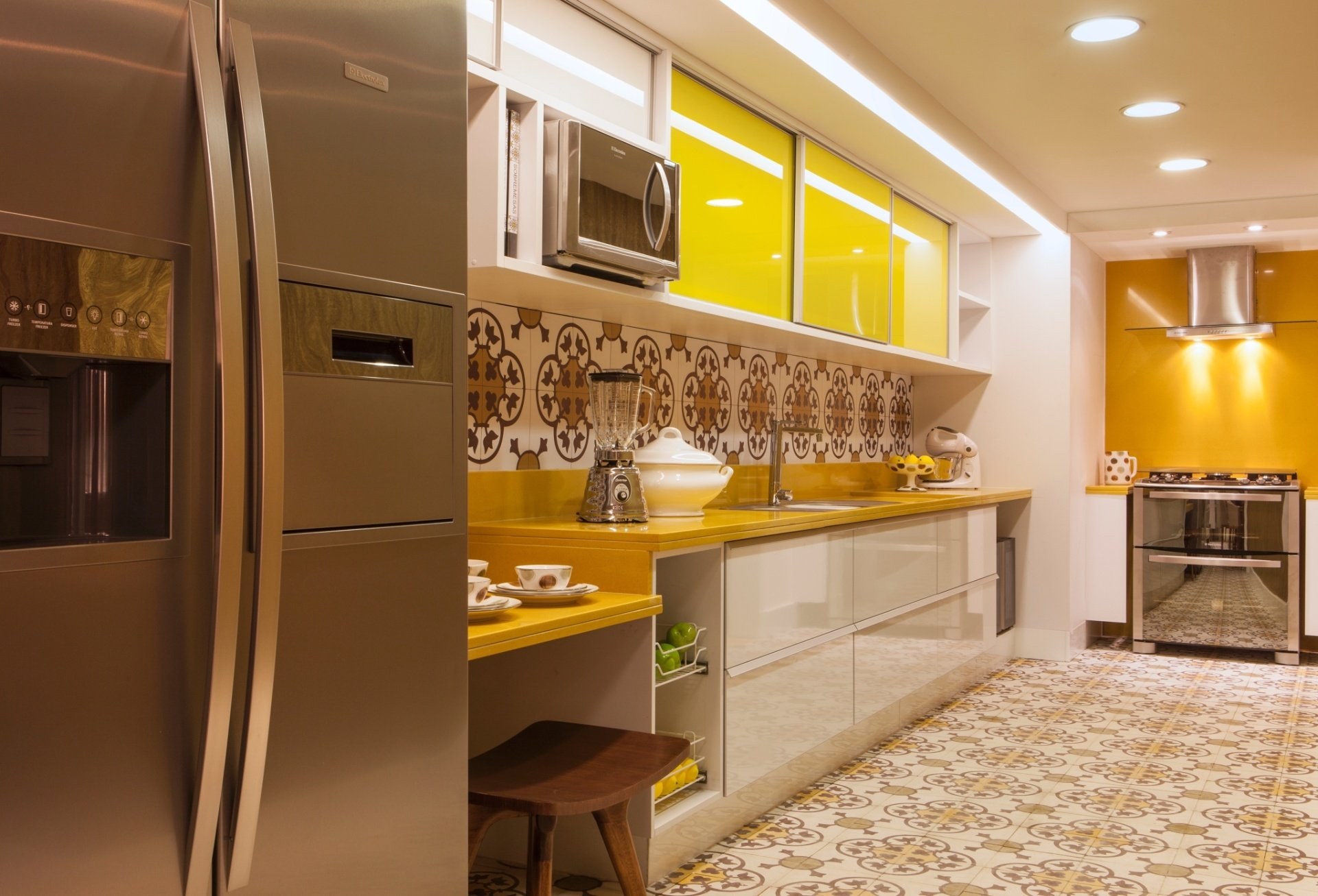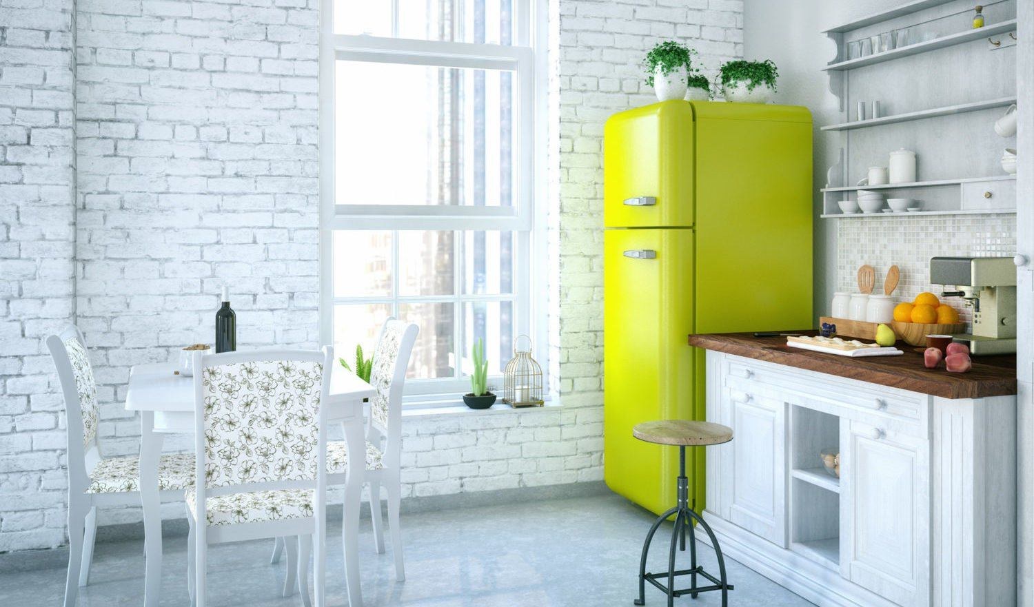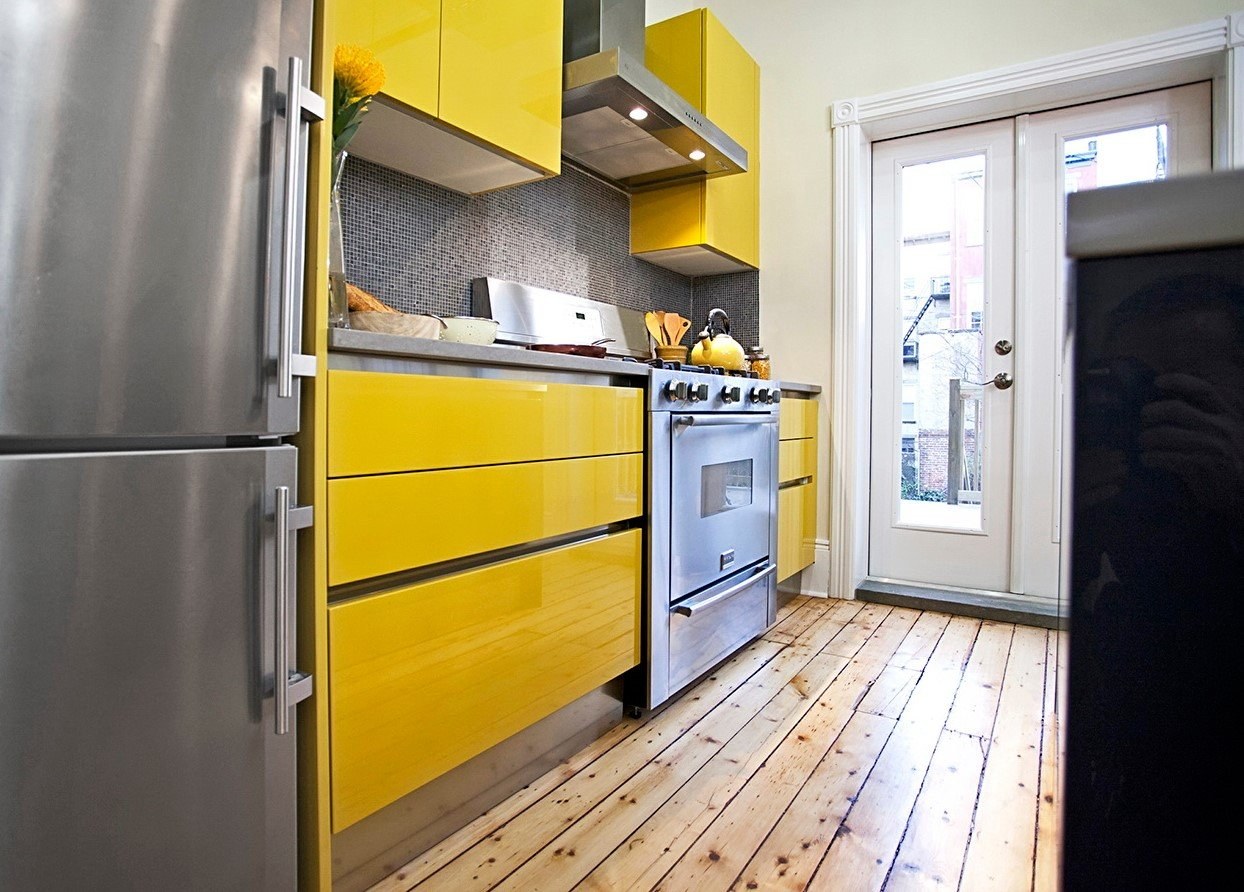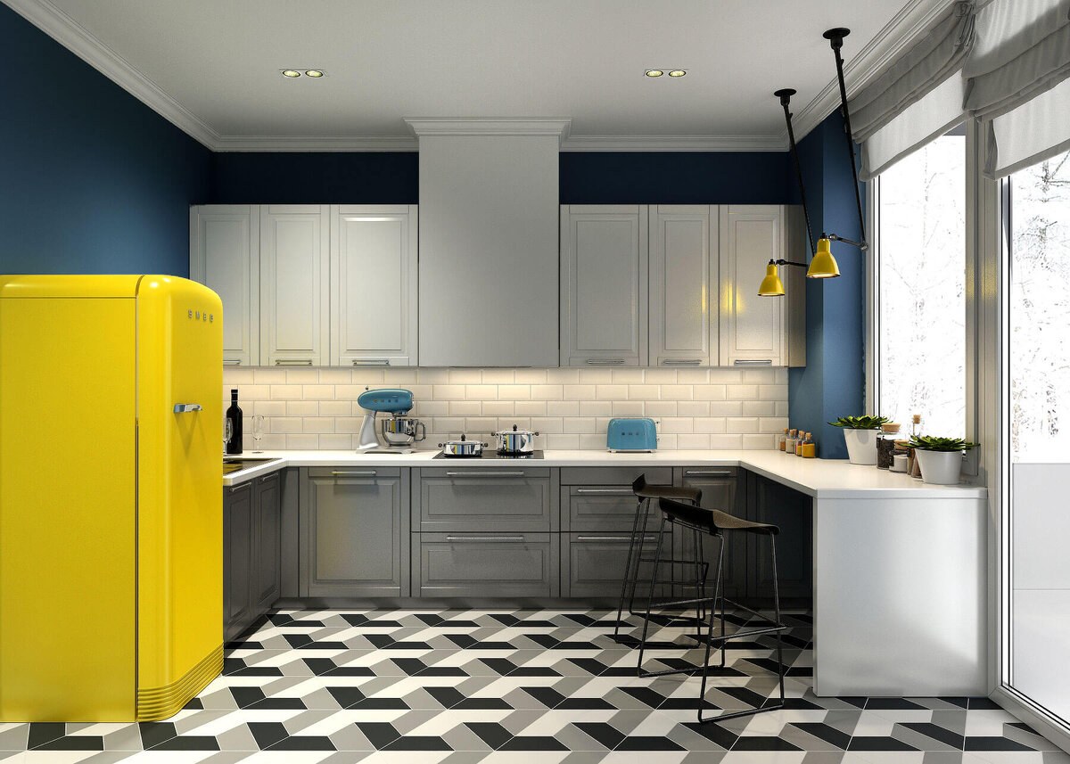 Интерьер кухни с желтым холодильником