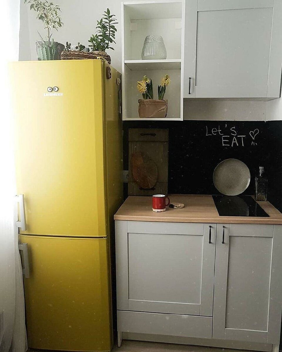 Жёлтый холодильник на маленькой кухне