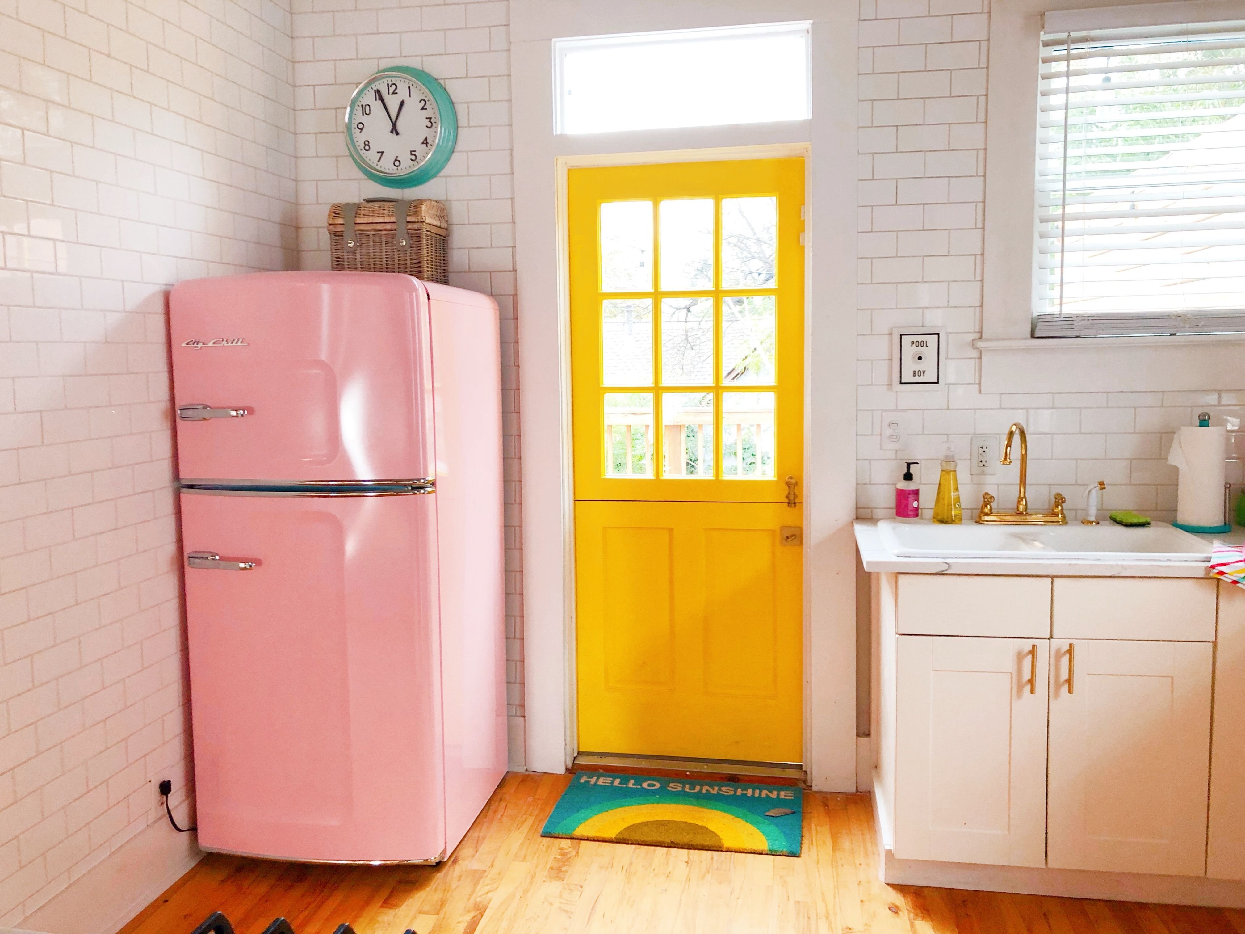 Желтый холодильник в интерьере с чем сочетается (97 фото)