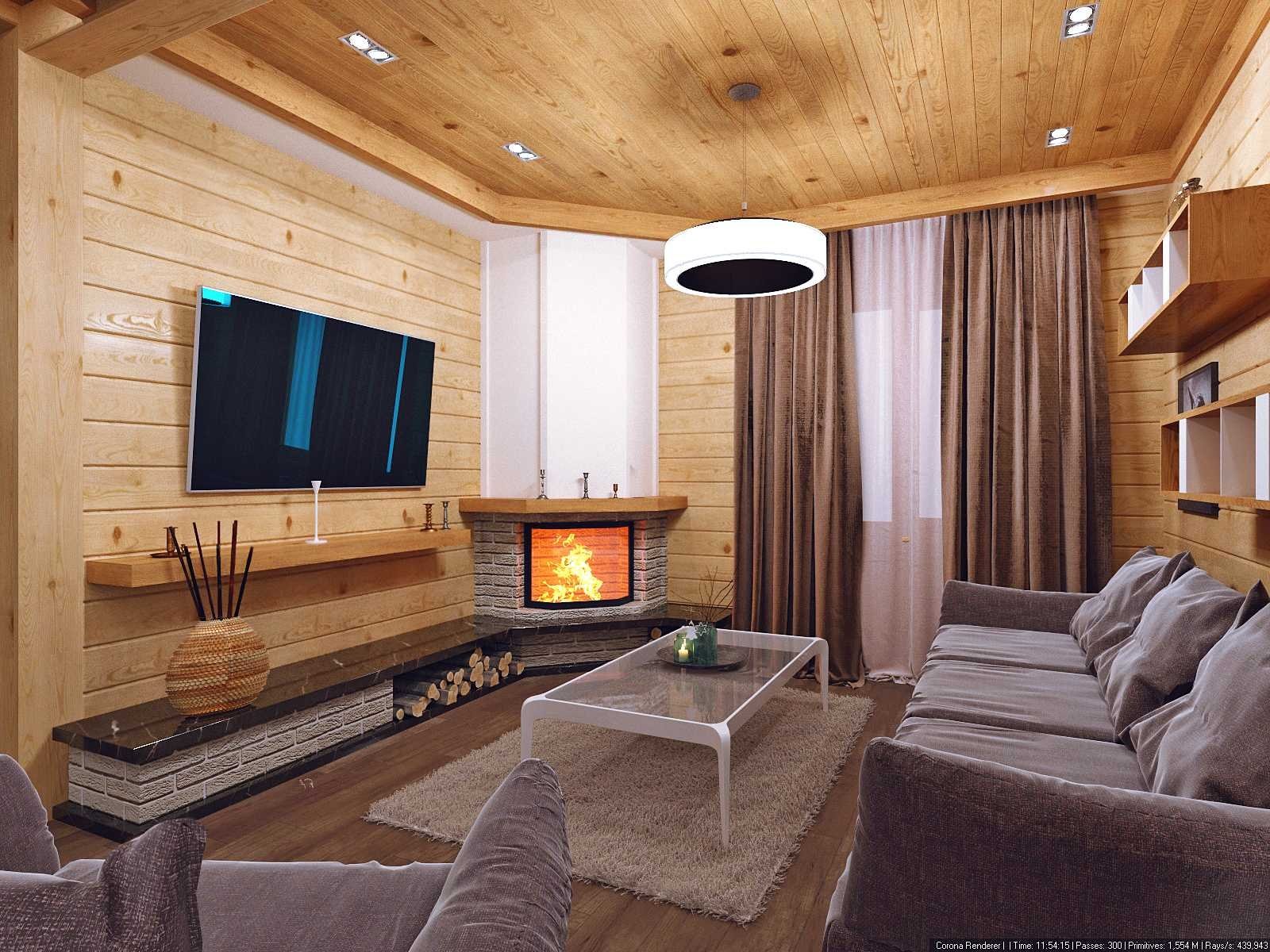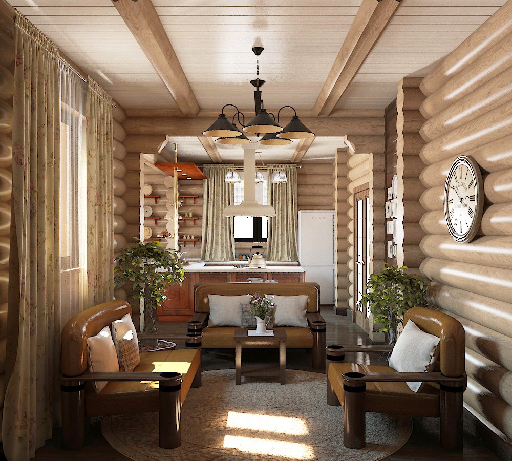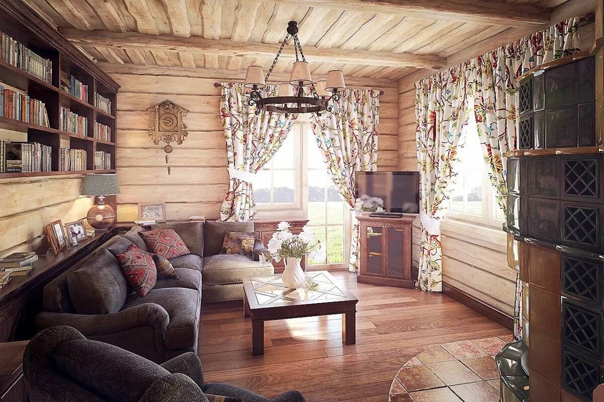 Интерьер гостиной в деревянном доме из бруса