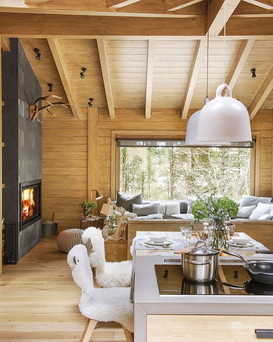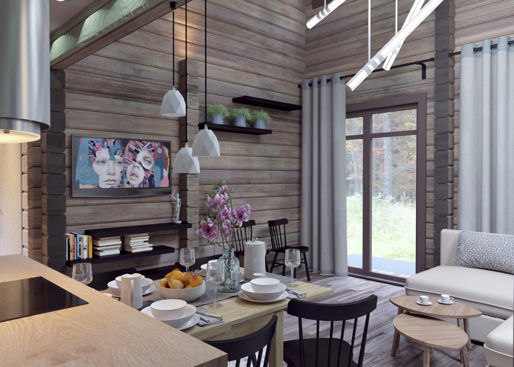 Кухня-гостиная 30м2 деревянный дом Сканди стиль