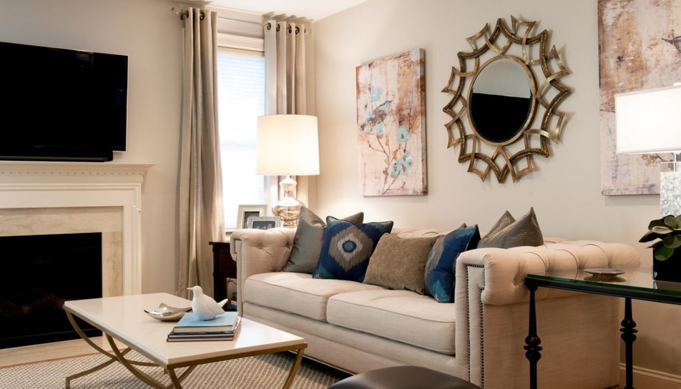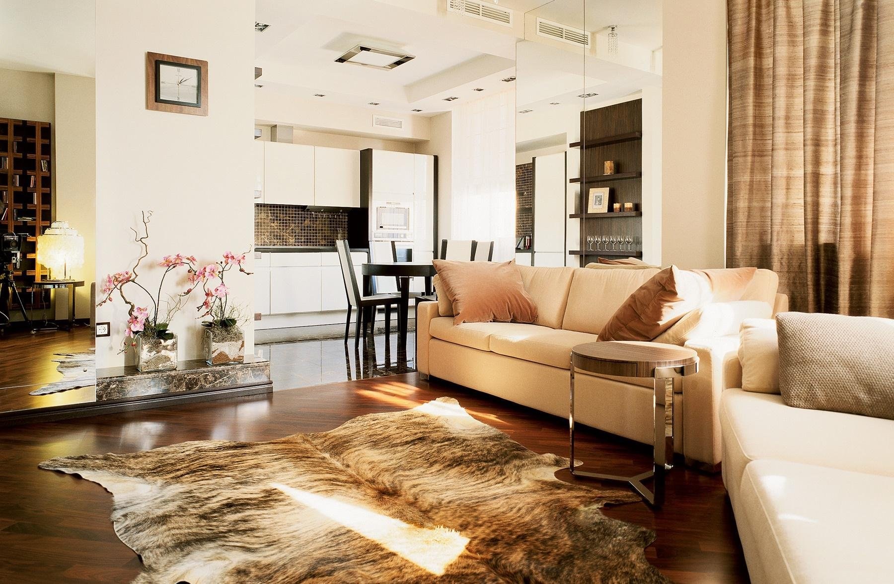 Бежевый диван в интерьере гостиной