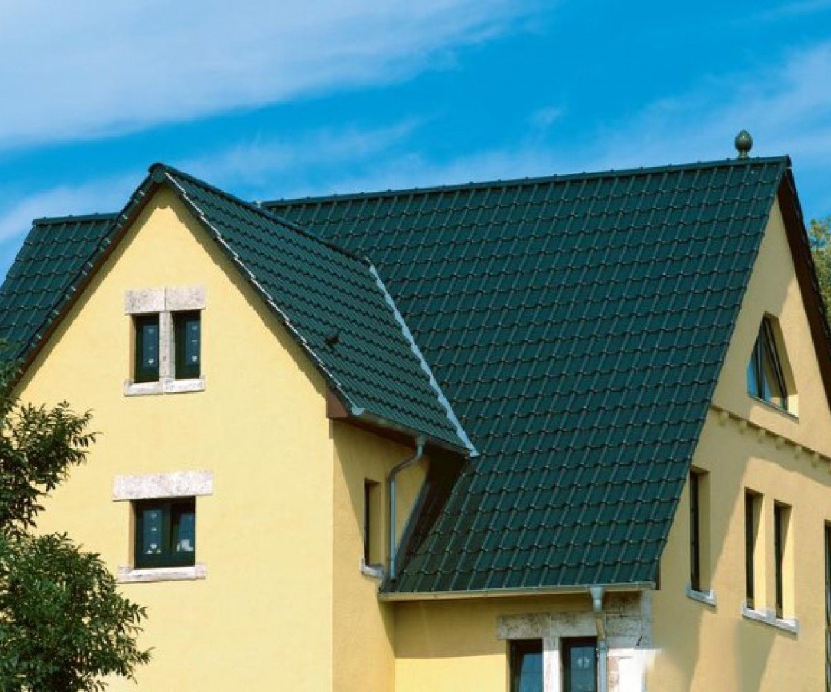 Желтый фасад дома с зеленой крышей