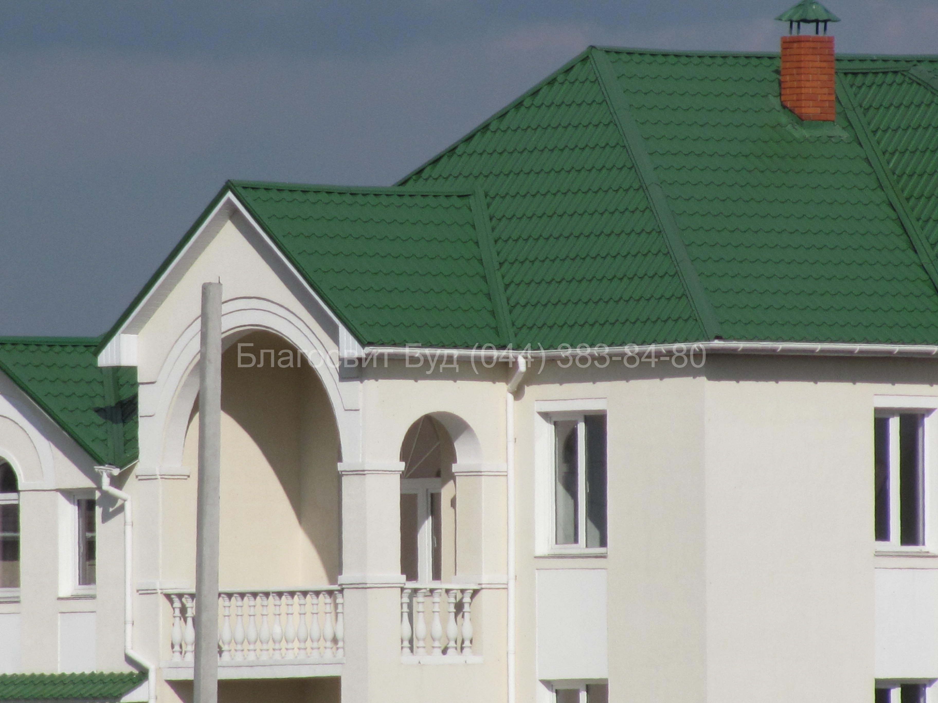 Фасад дома с зеленой крышей