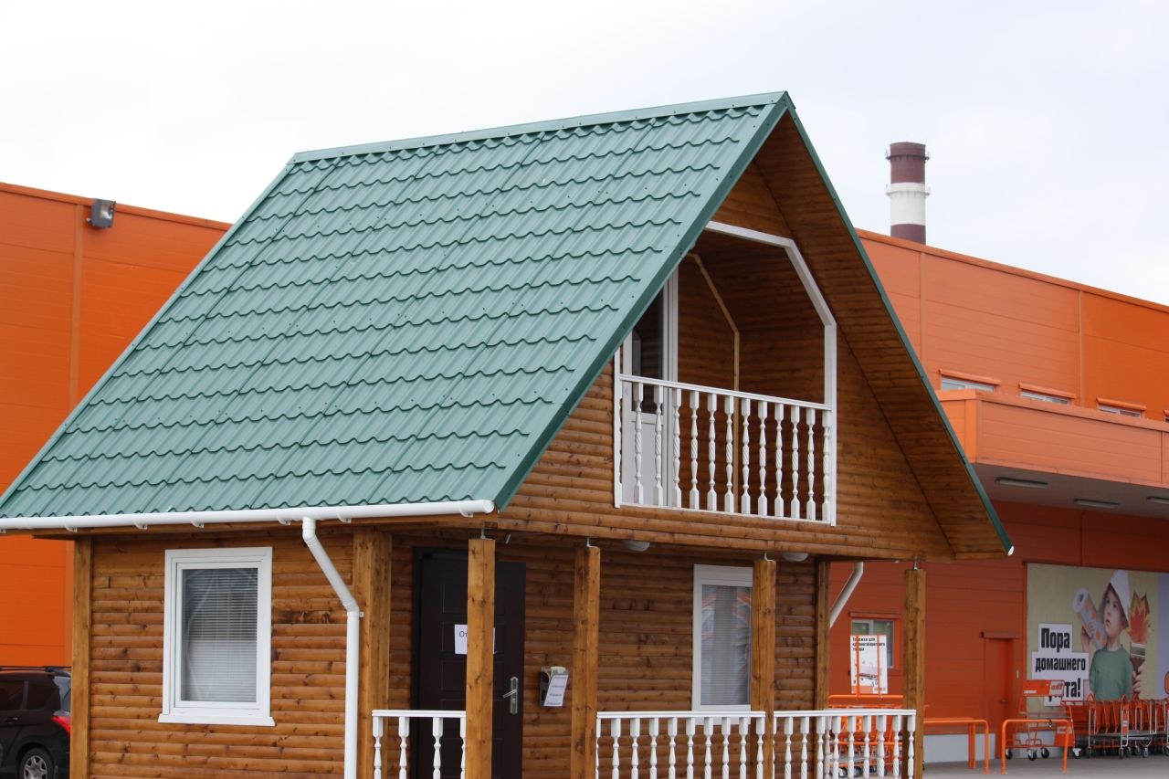 Деревянный дом с зеленой крышей