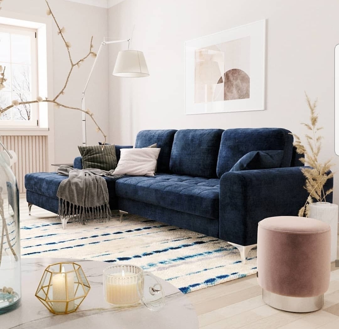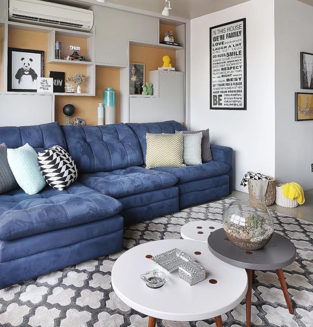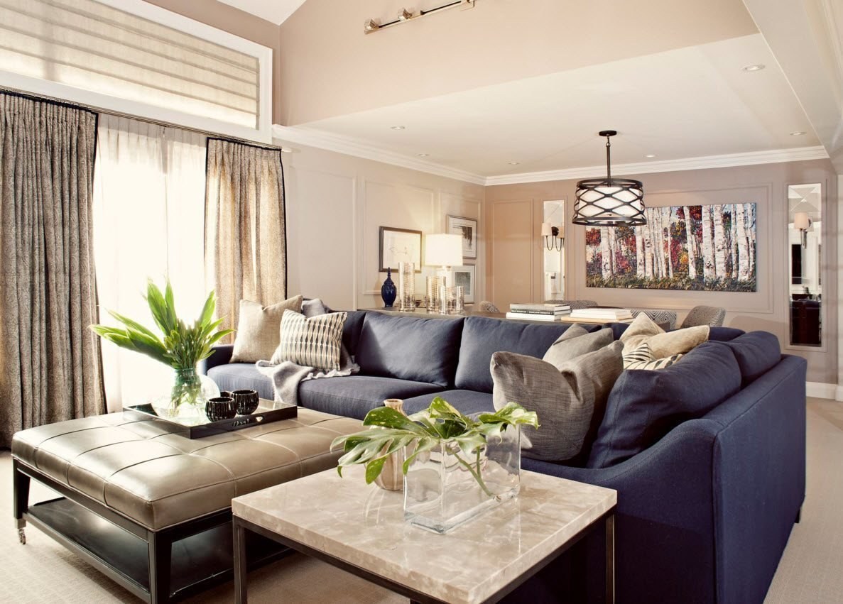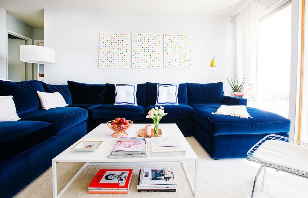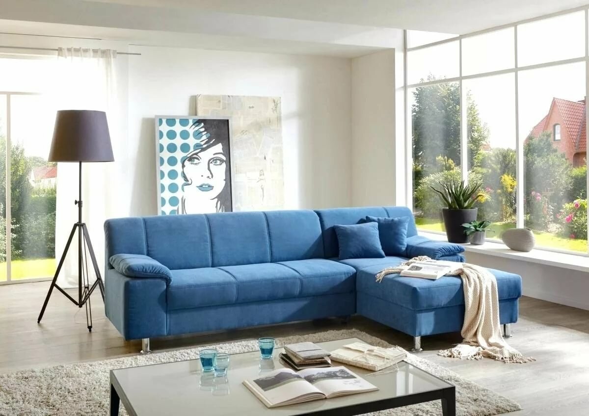 Интерьер гостиной с синим угловым диваном (98 фото)
