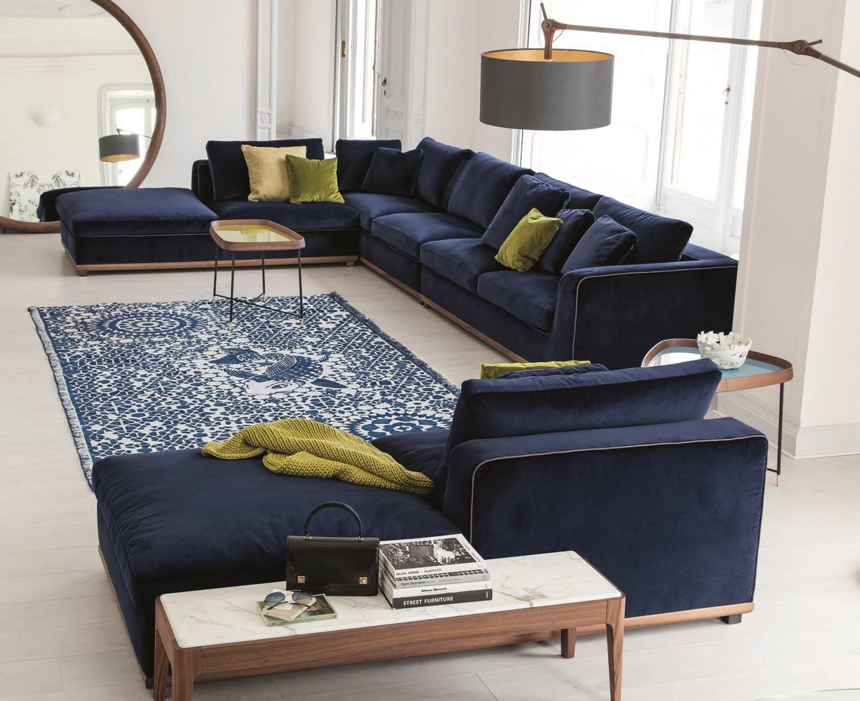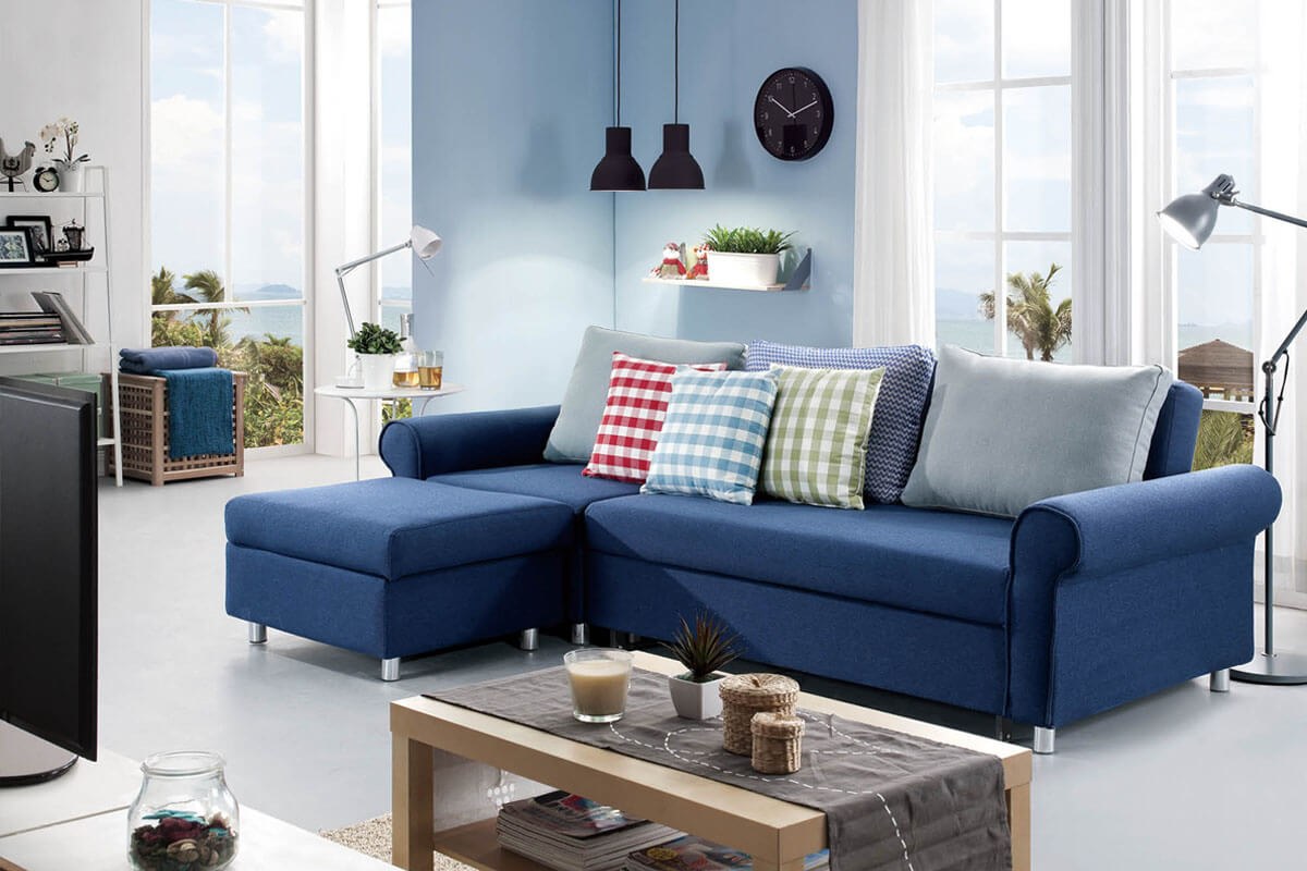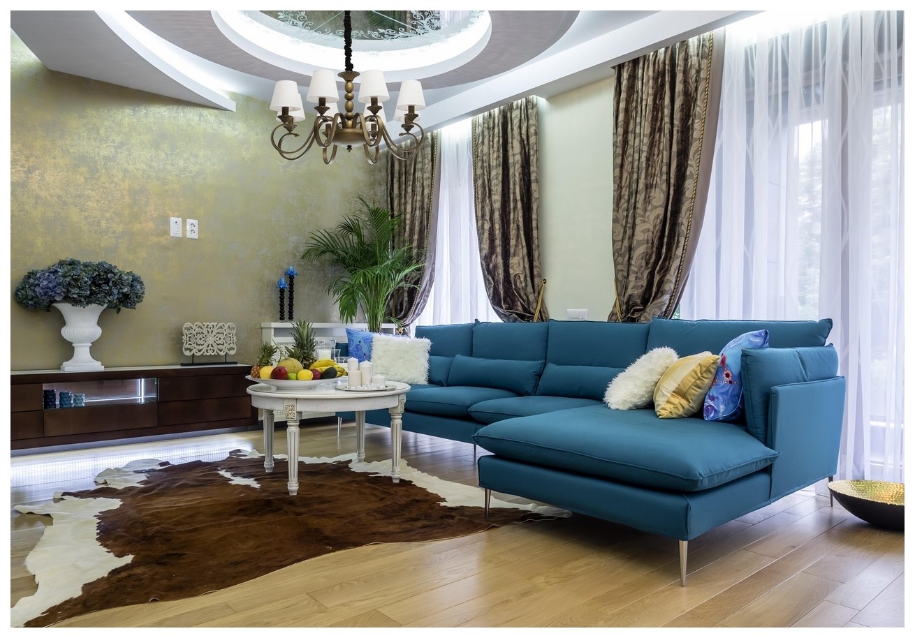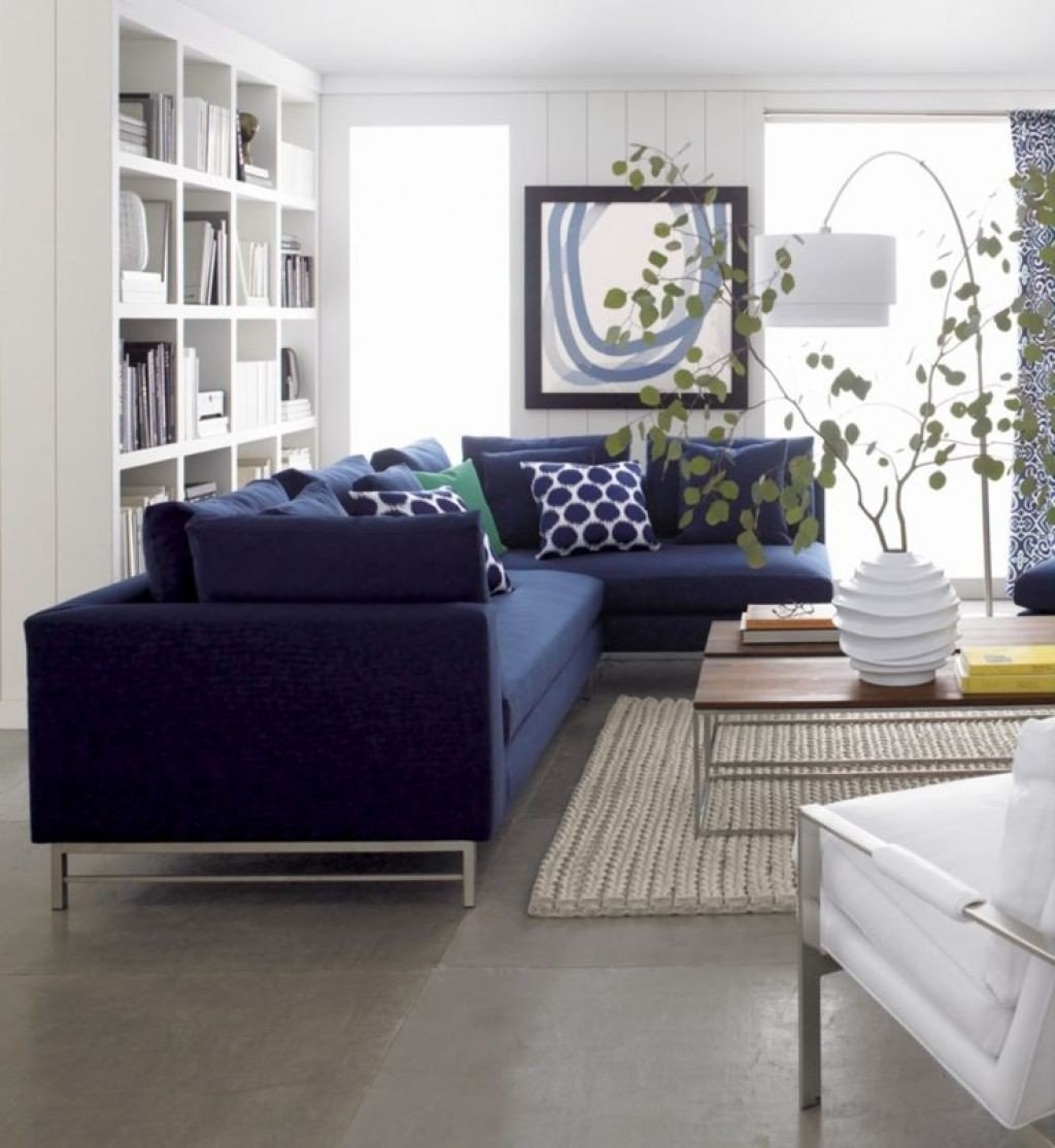 Интерьер гостиной с синим угловым диваном (98 фото)