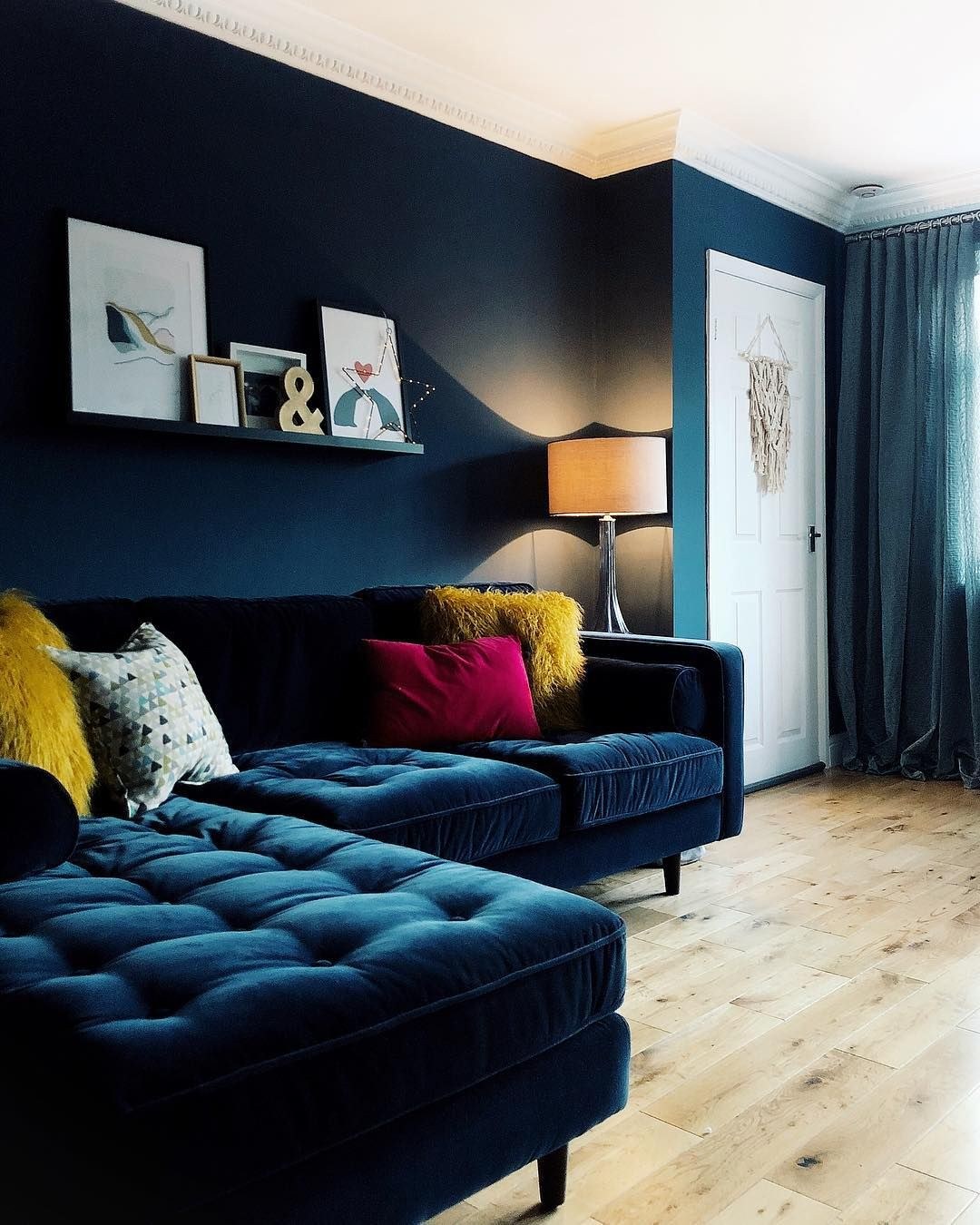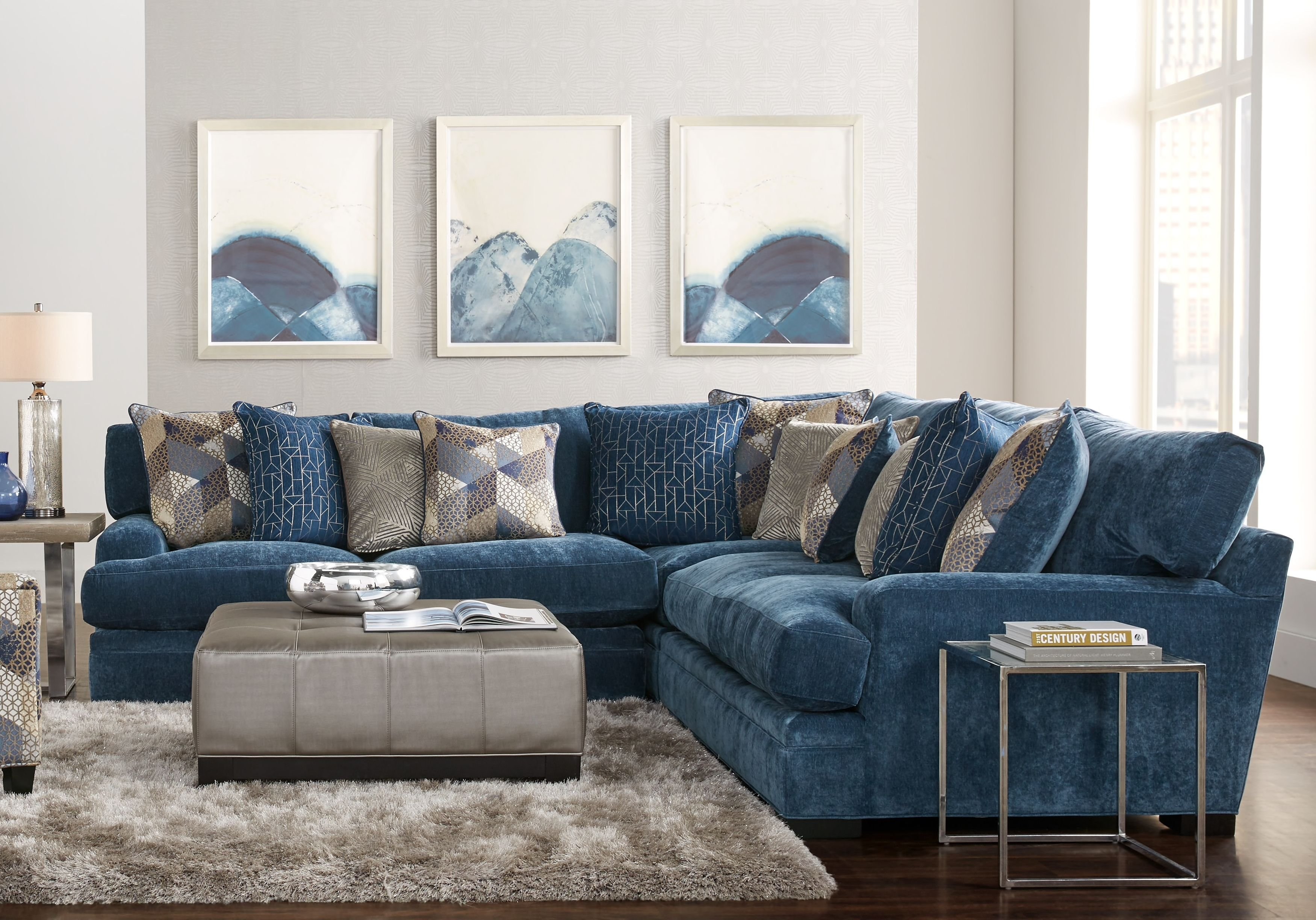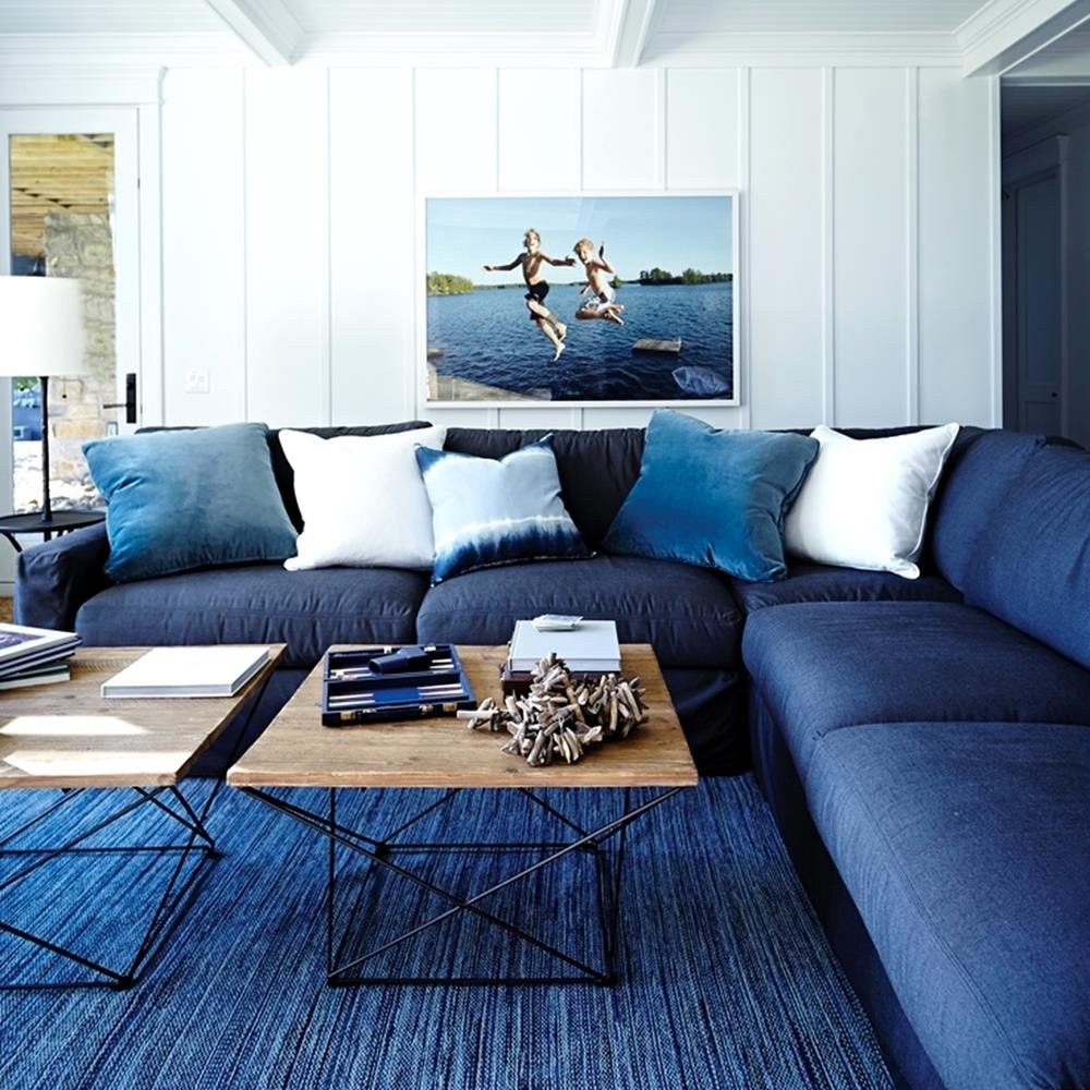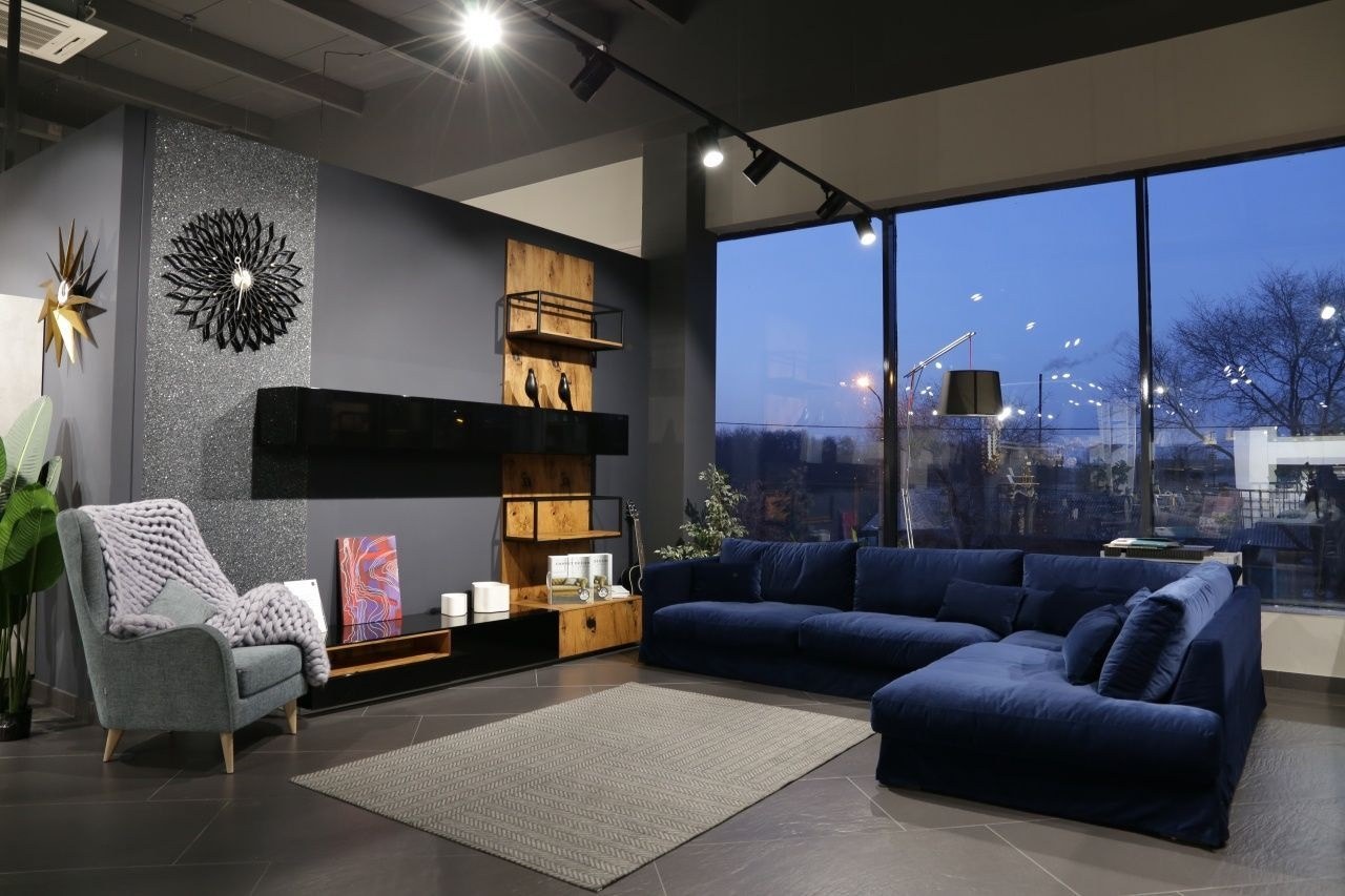 Интерьер гостиной с синим угловым диваном (98 фото)