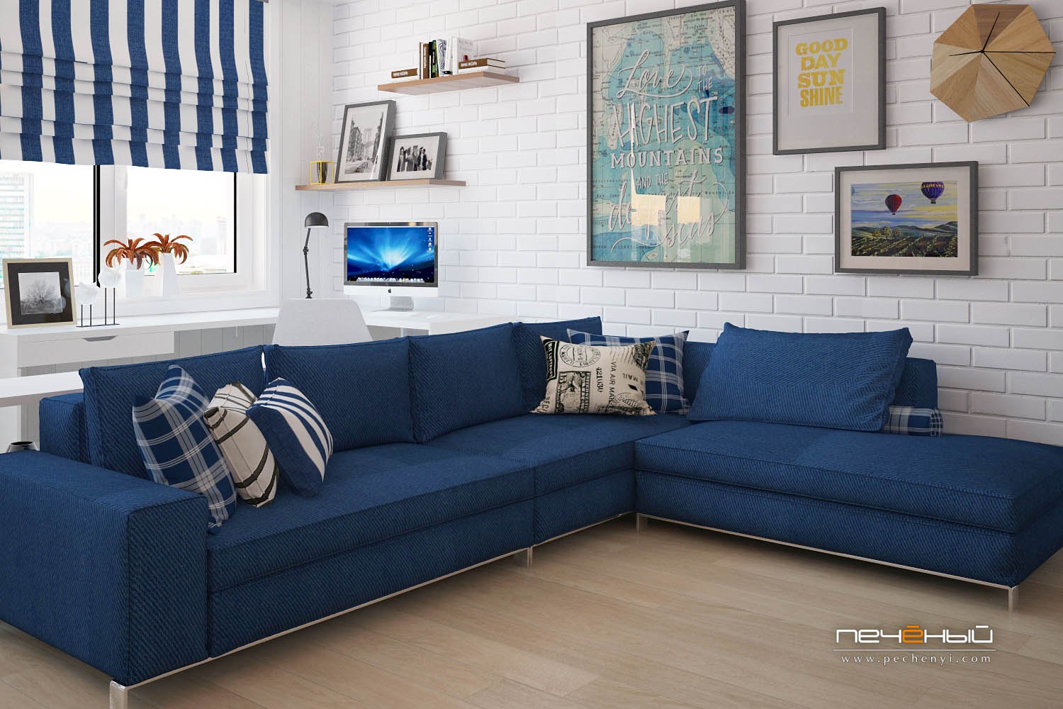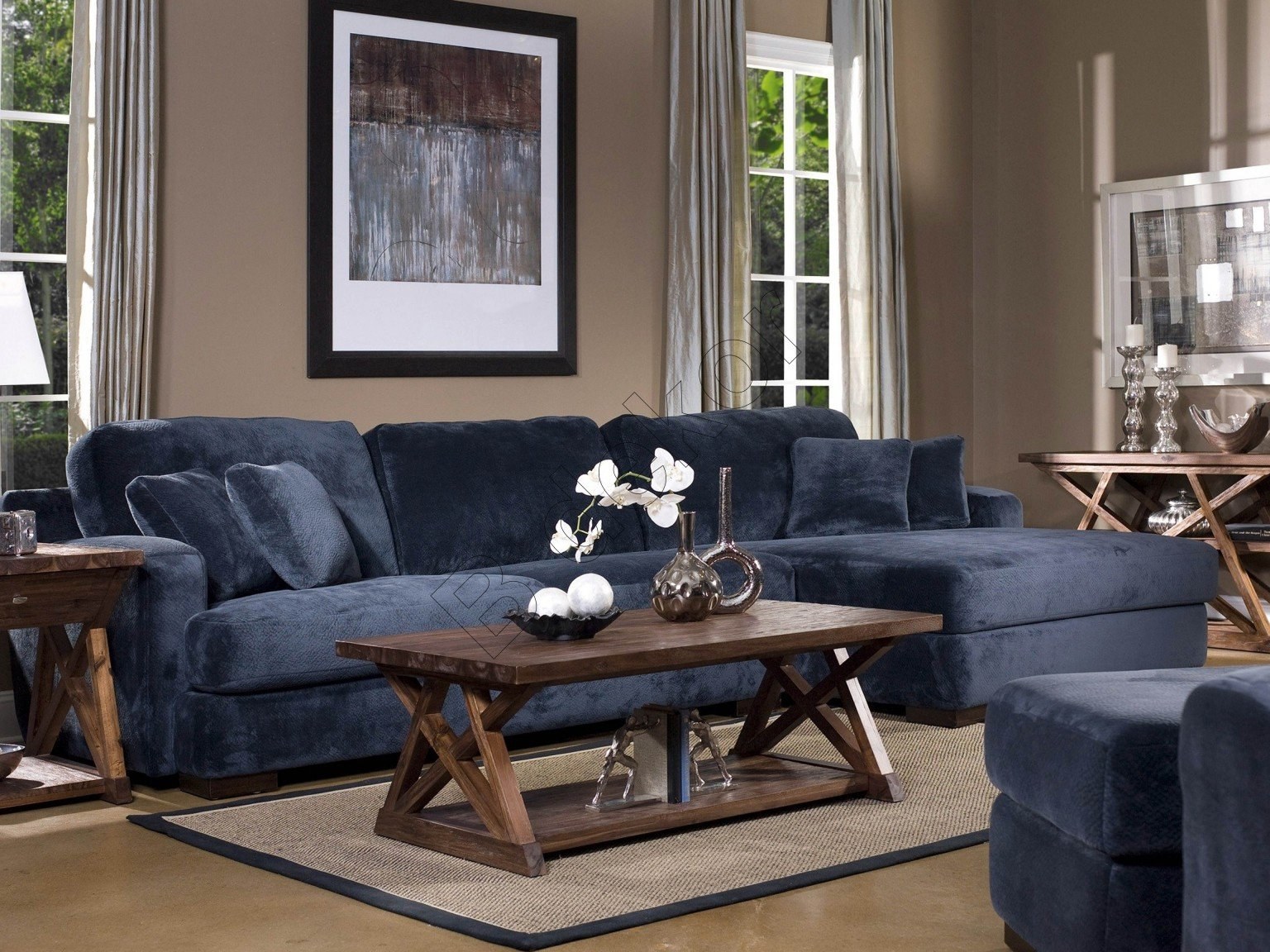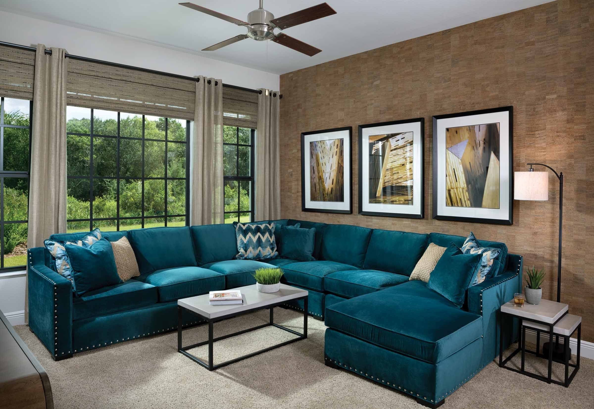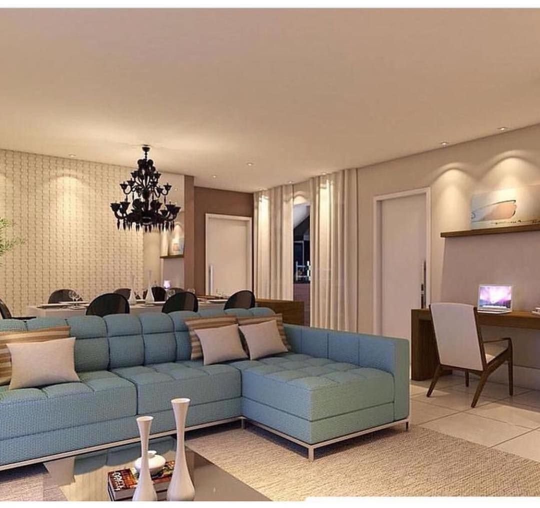 Интерьер гостиной с синим угловым диваном (98 фото)