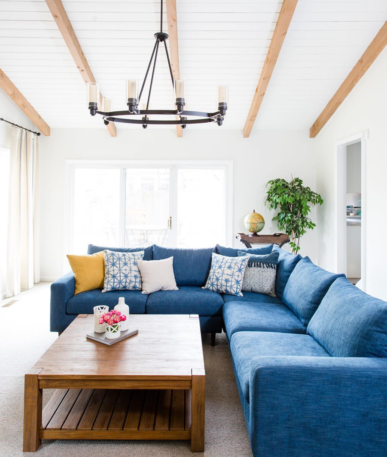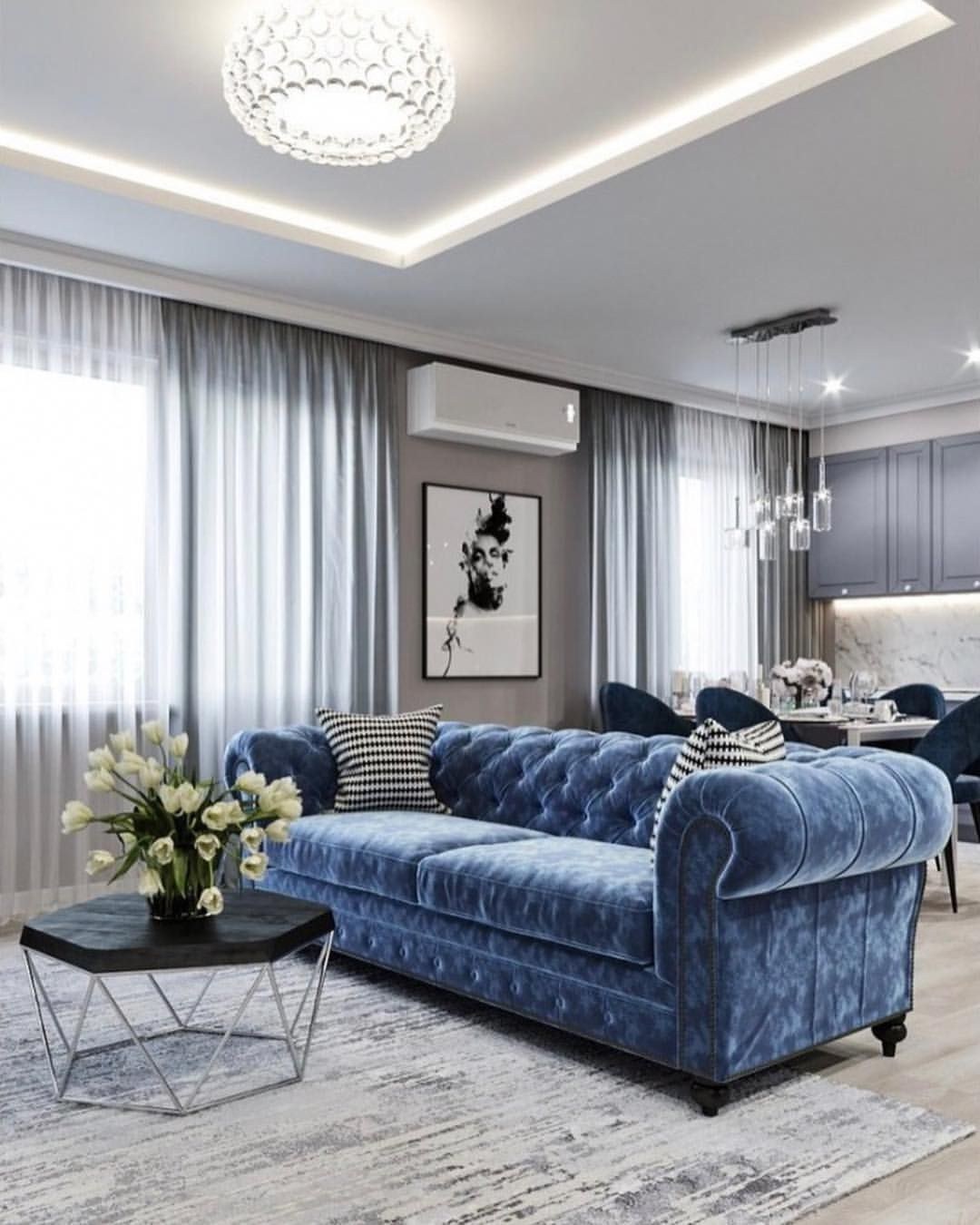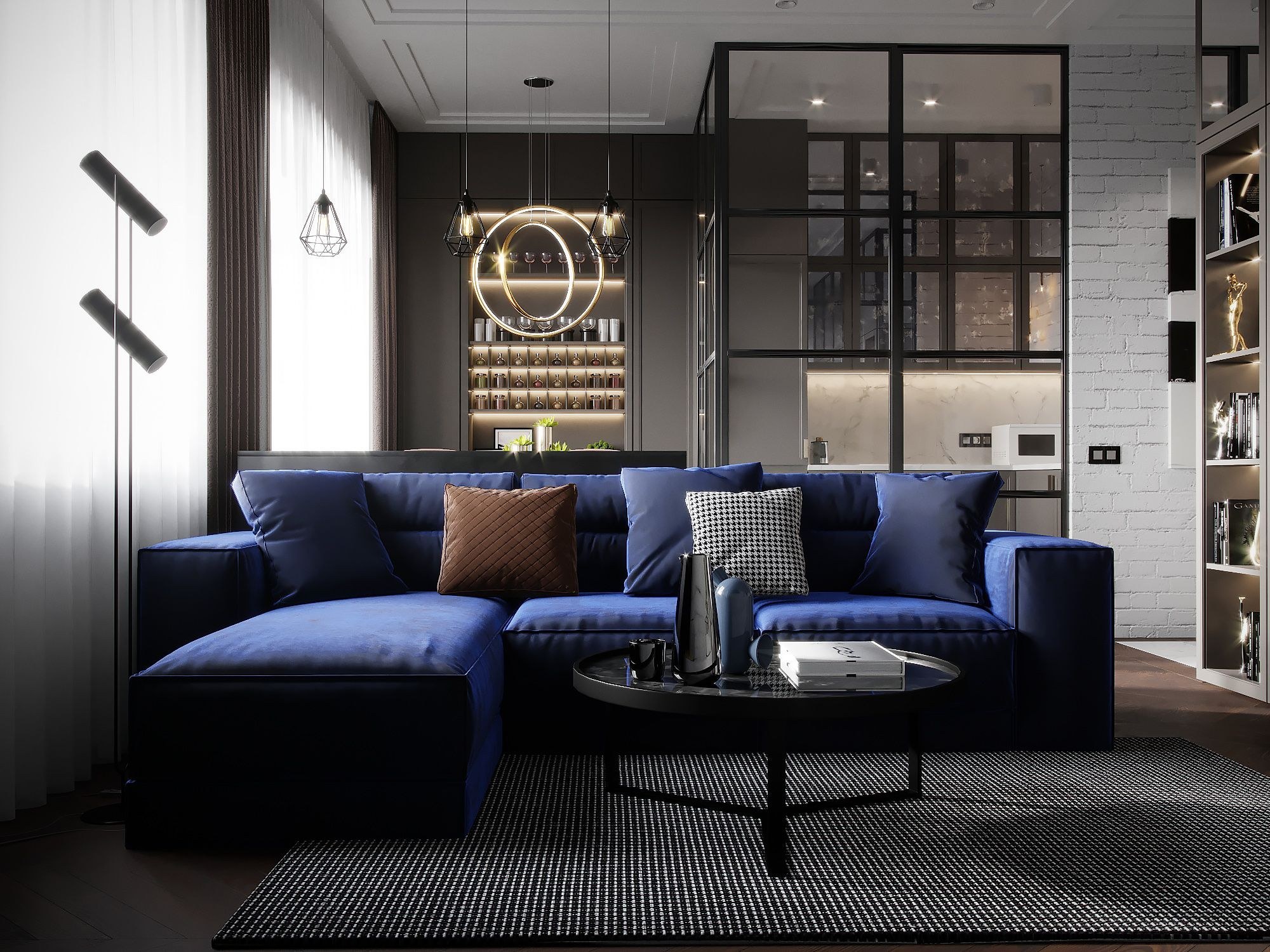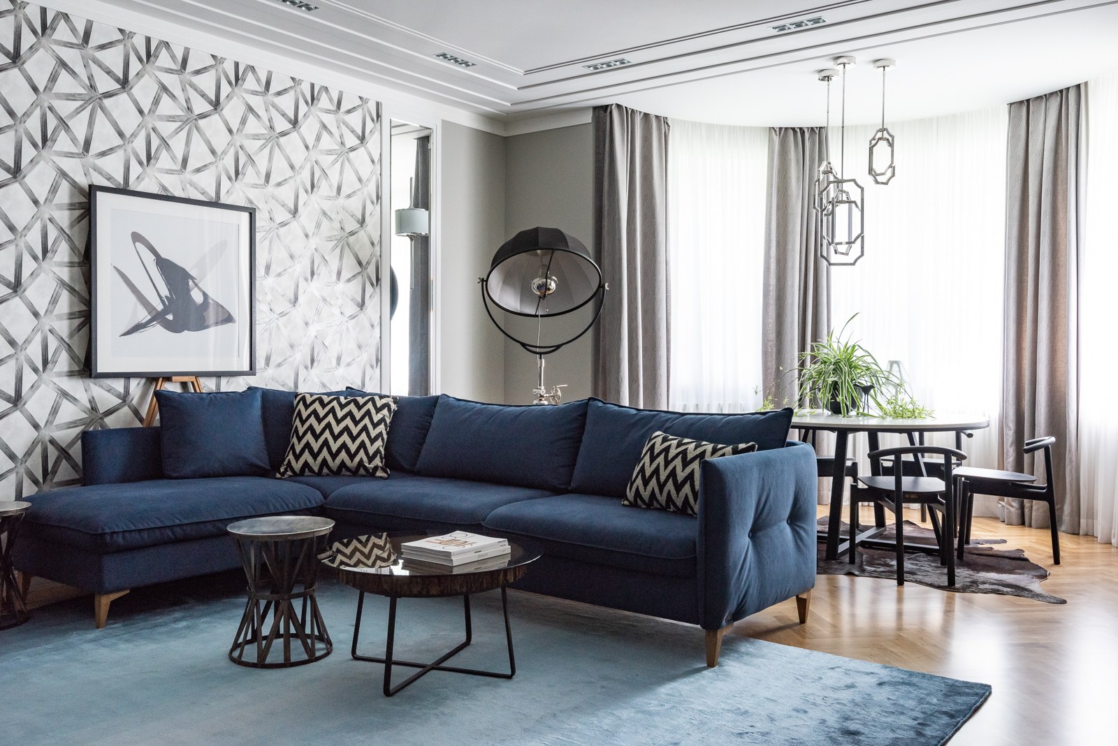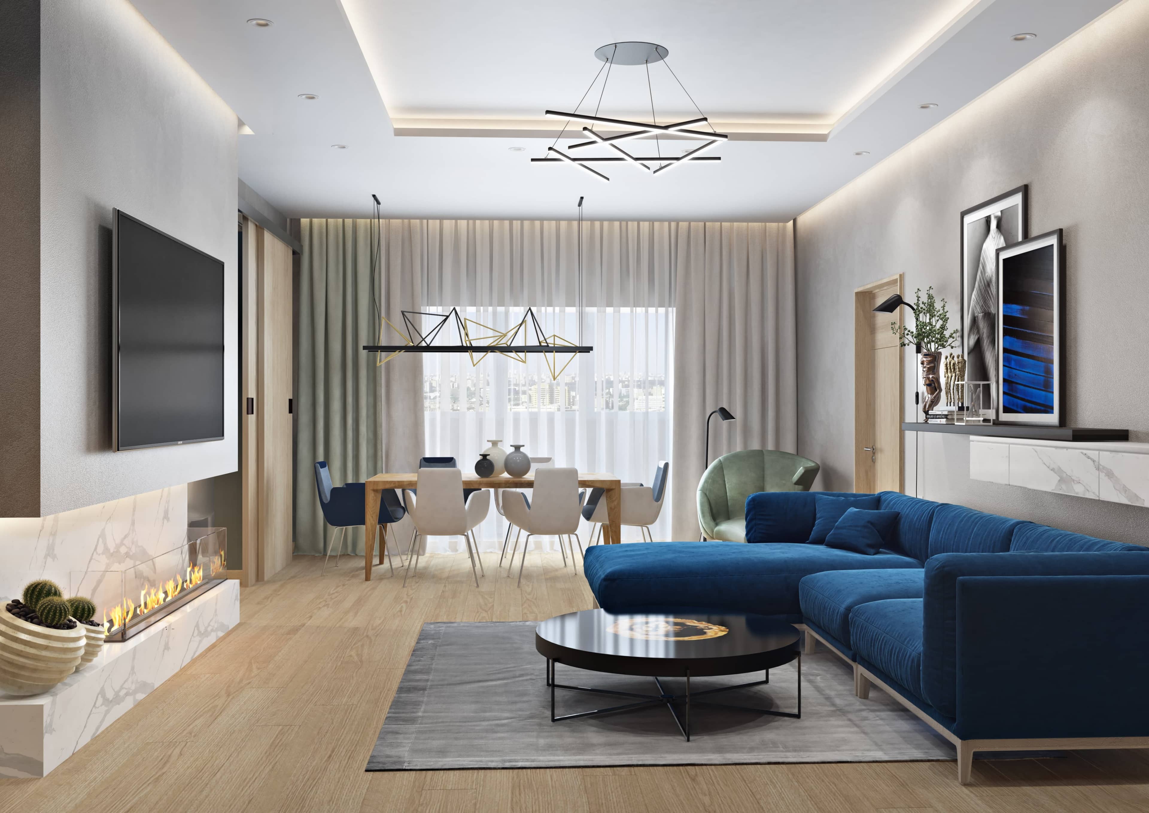 Современная гостиная с синим диваном