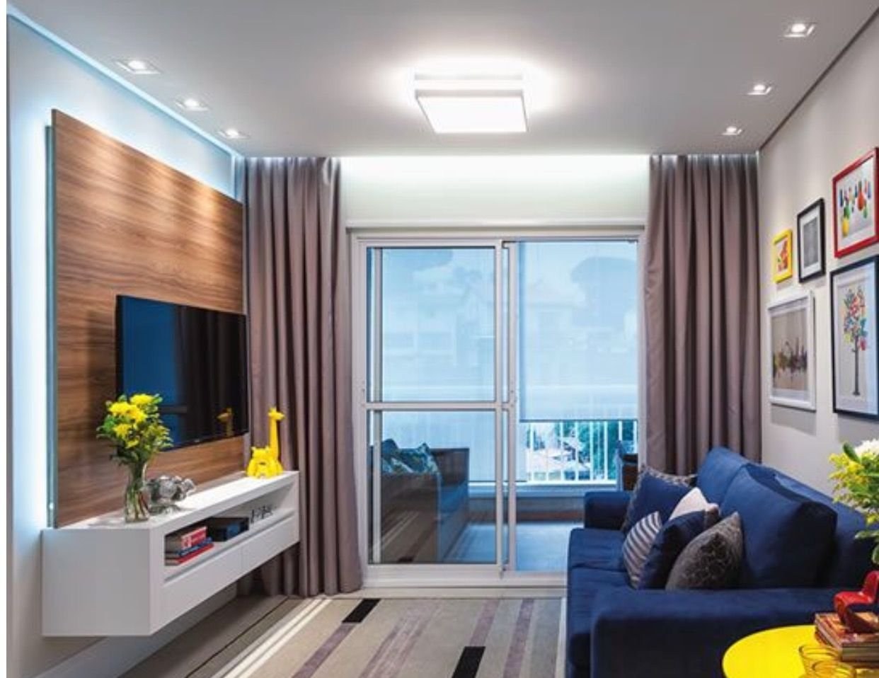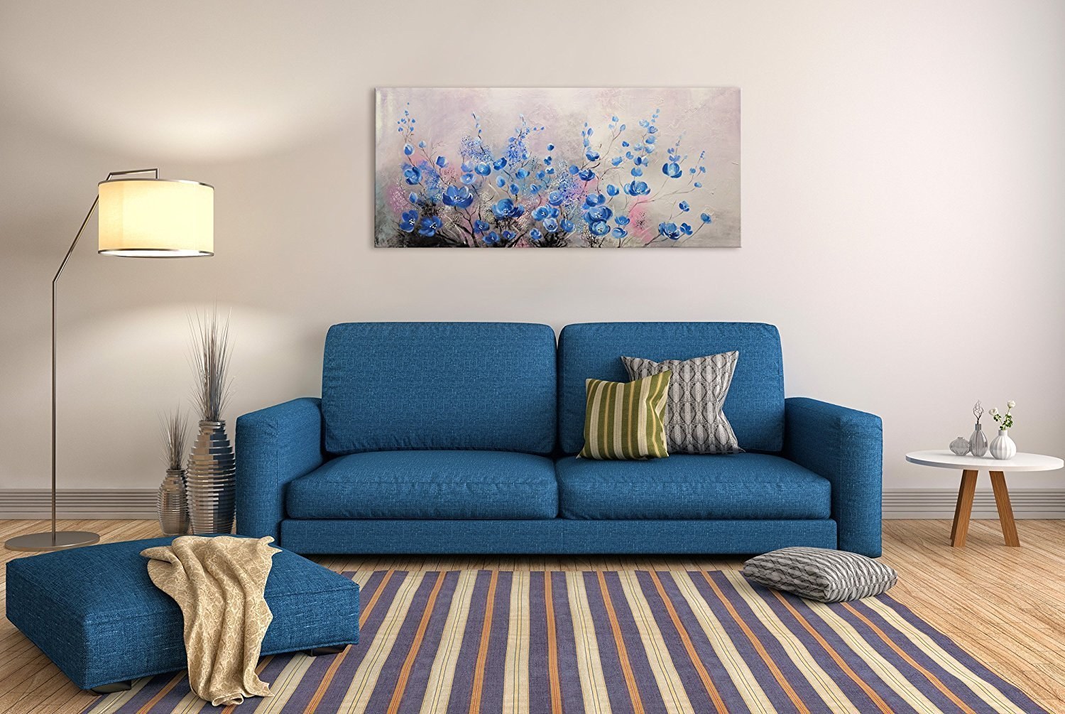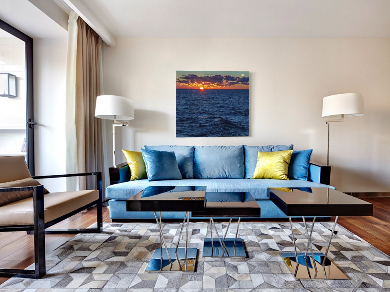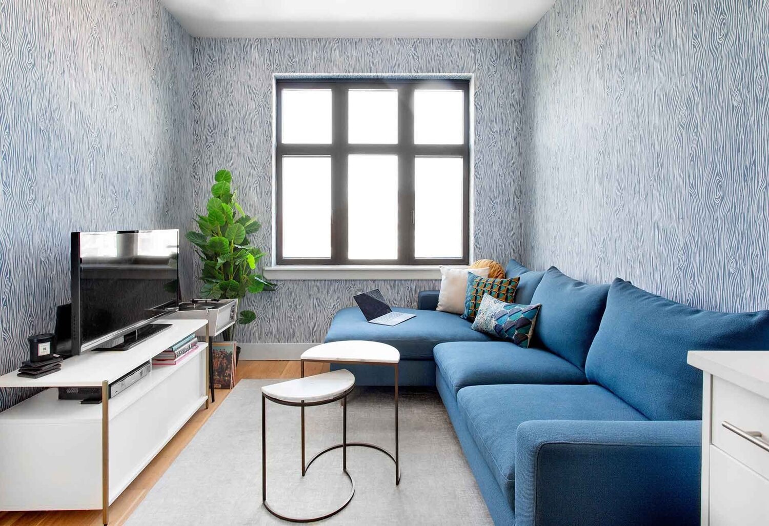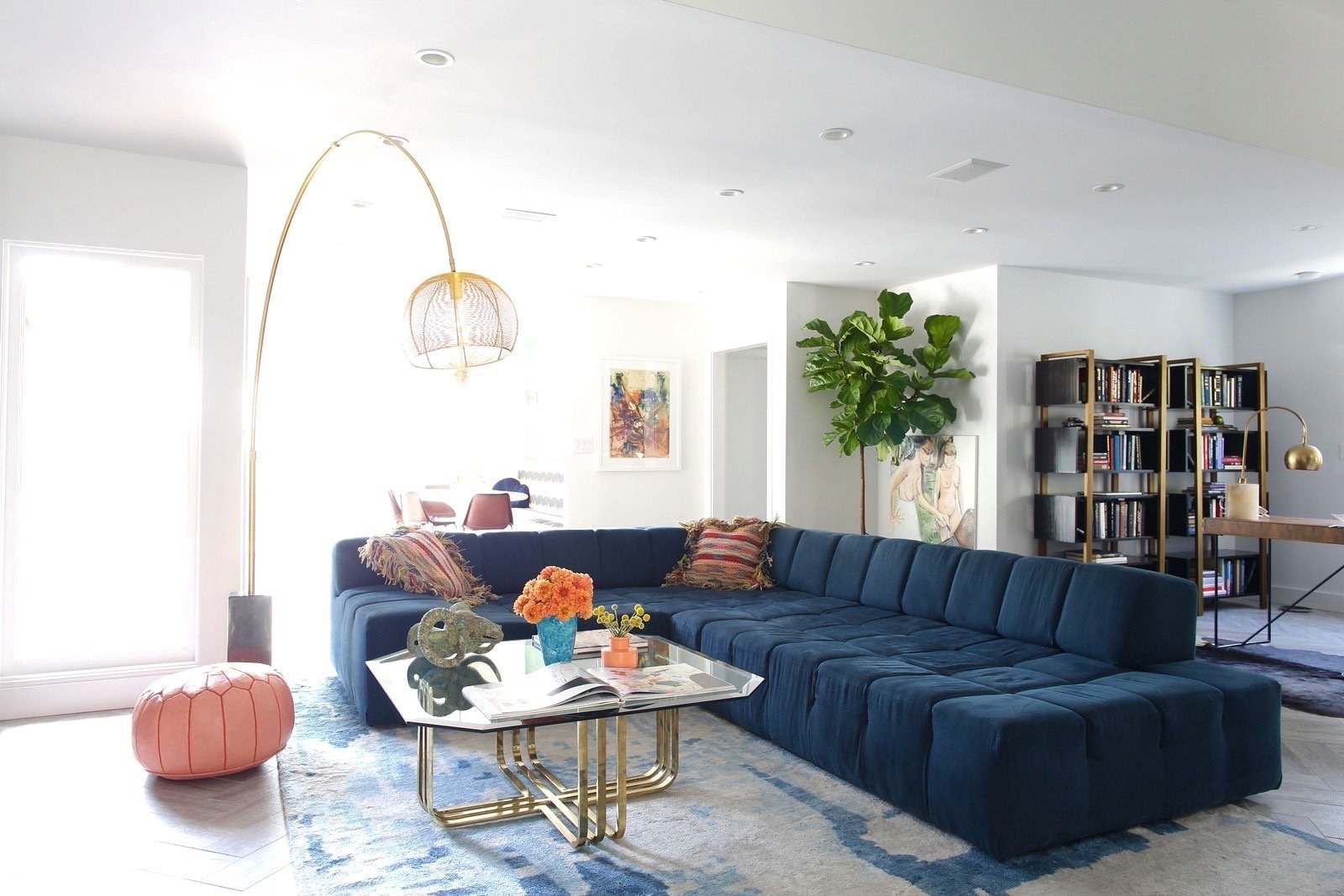 Современная гостиная с синим диваном