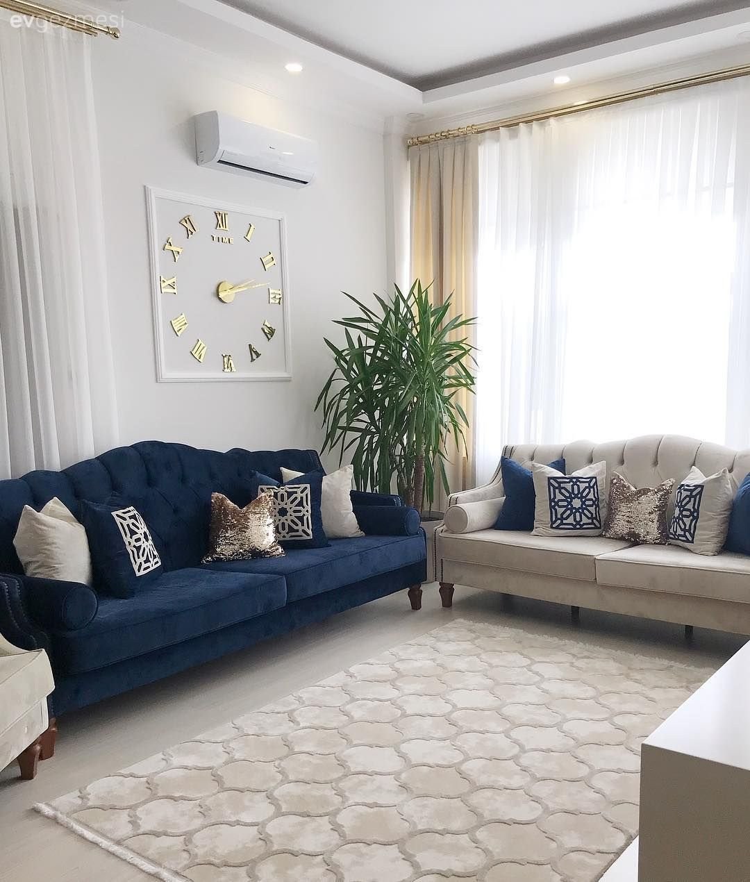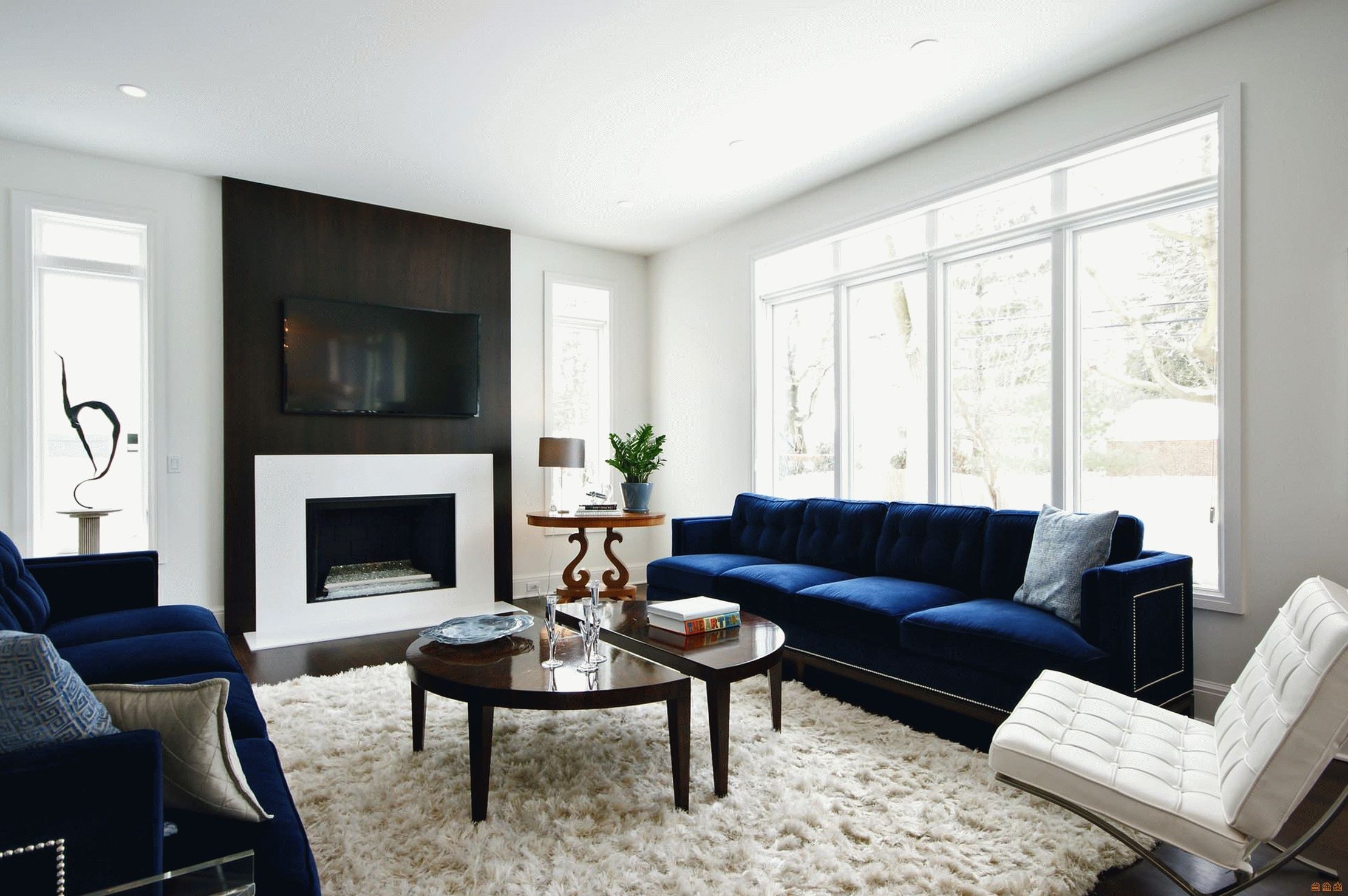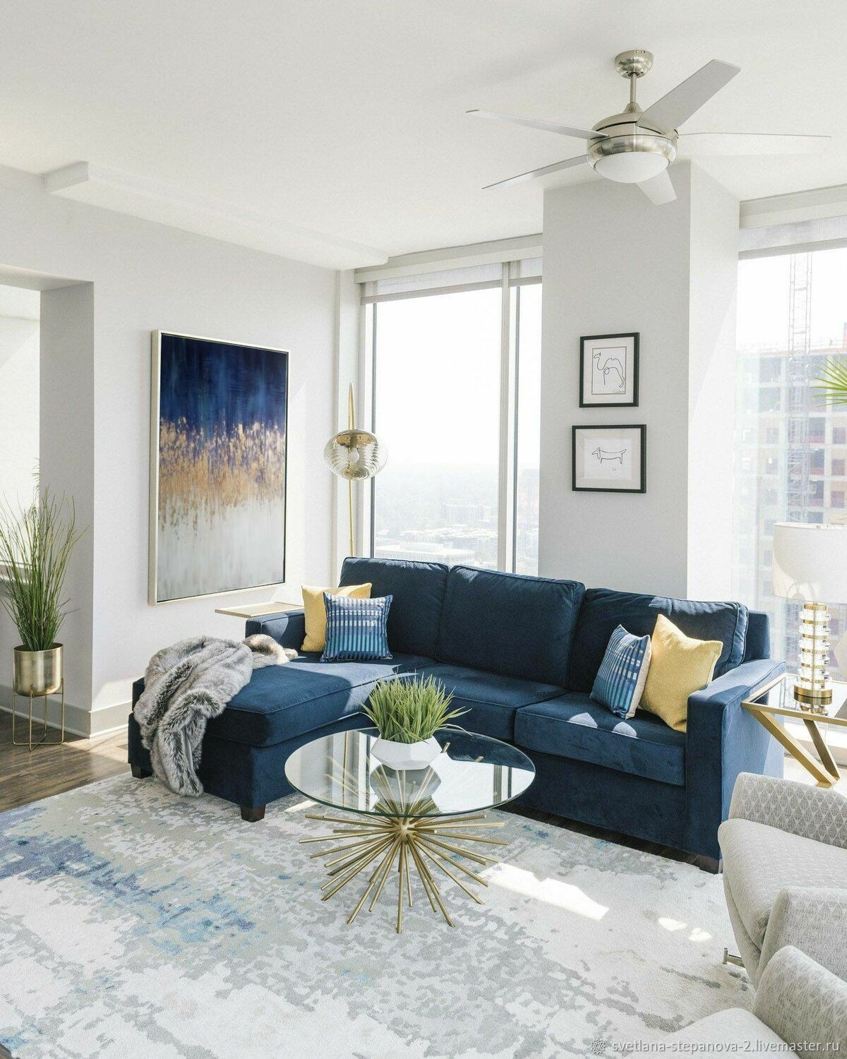 Белая гостиная с синим диваном