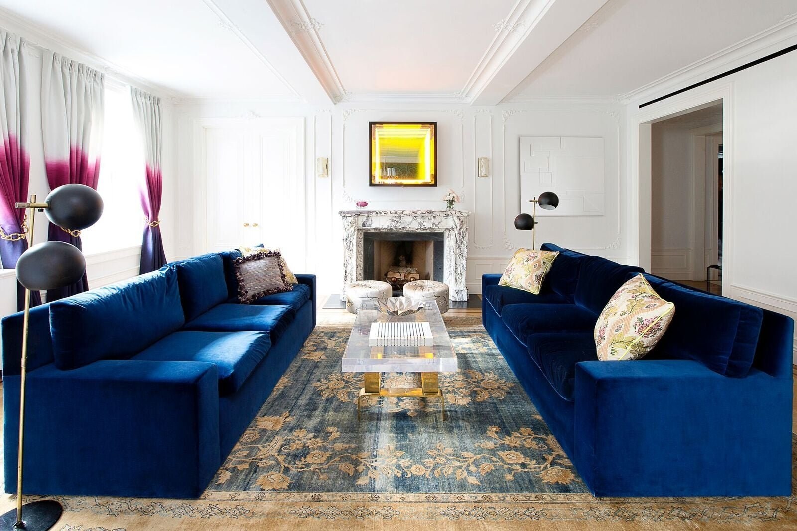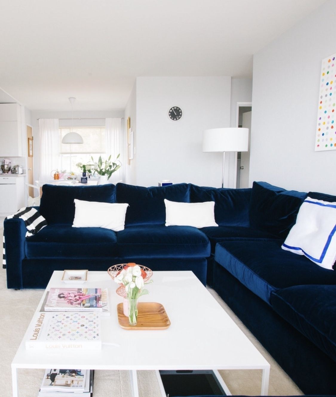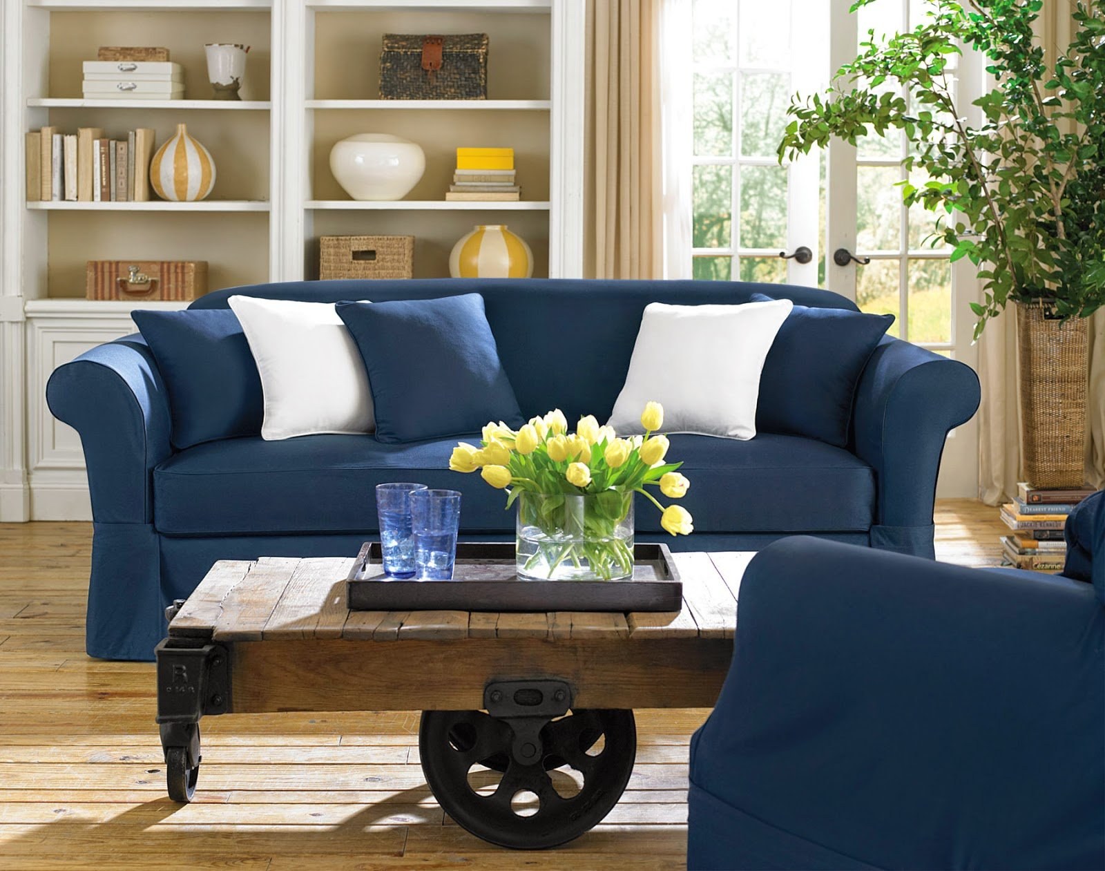Белая гостиная с синим диваном