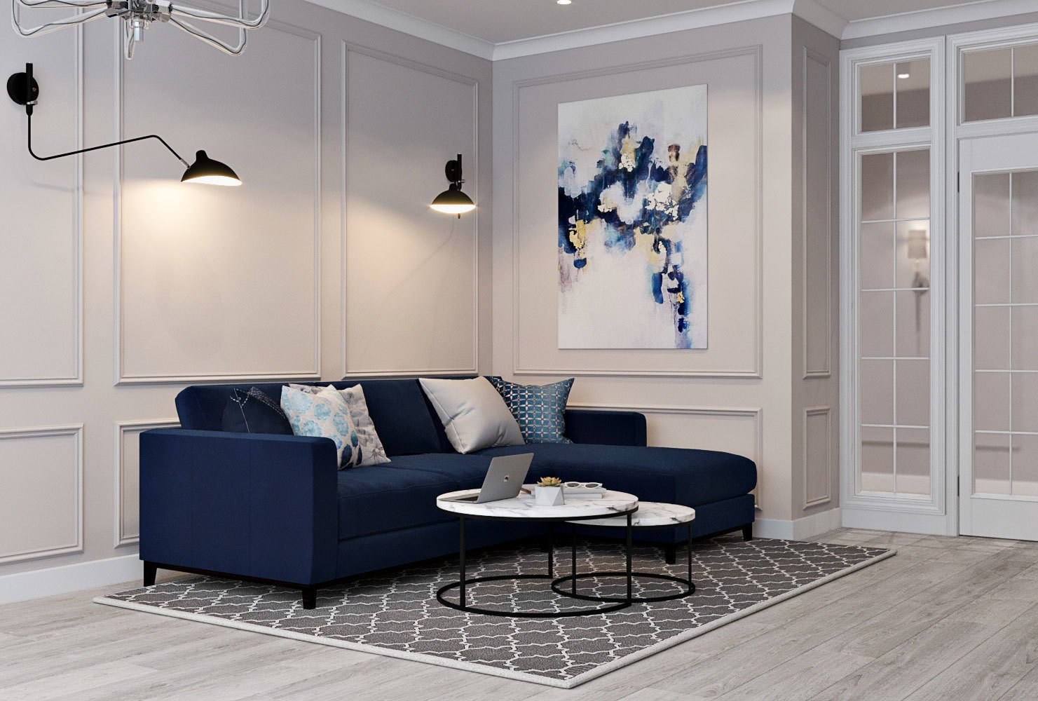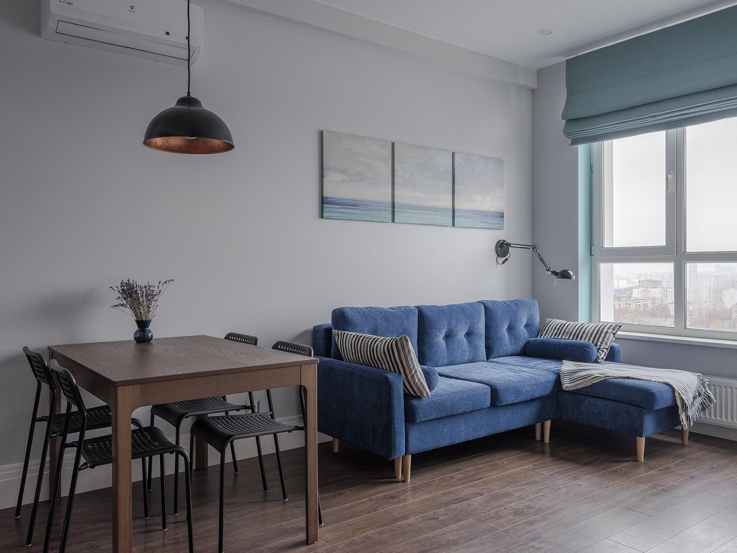 Синий диван в сером интерьере
