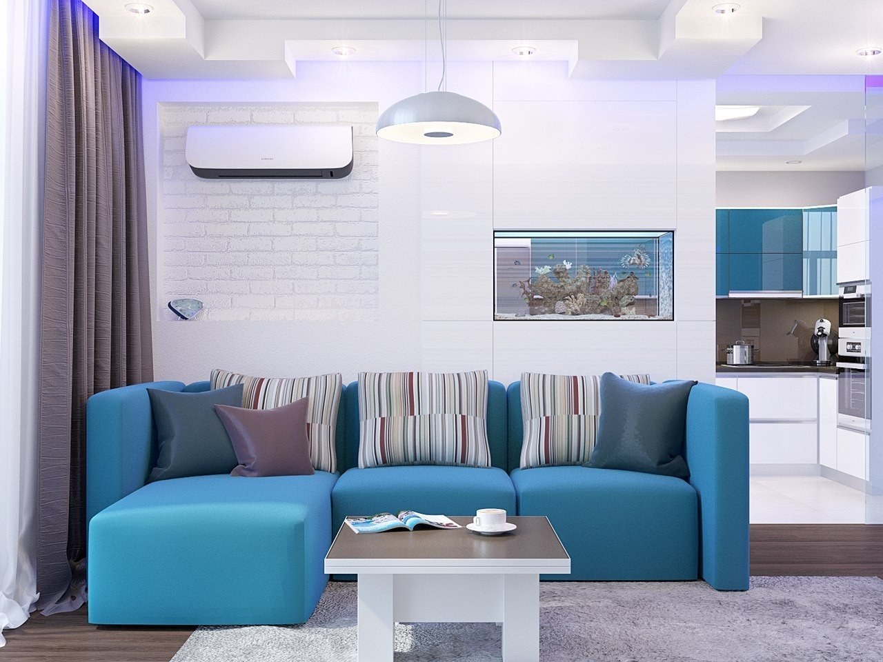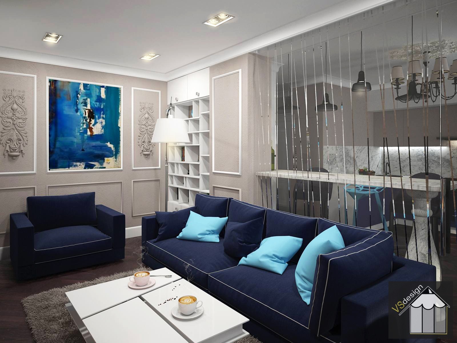 Бело синий интерьер гостиной