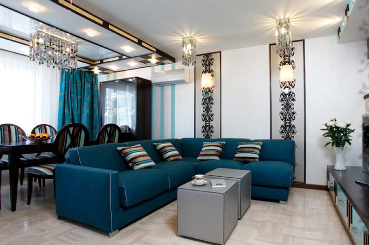 Синий диван в интерьере гостиной