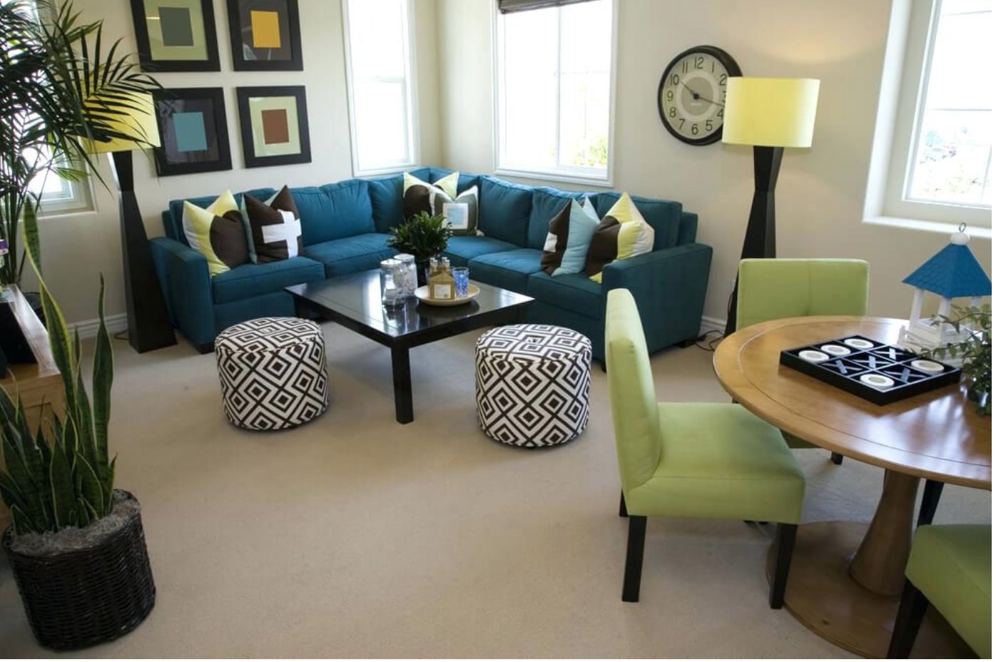 Цветные диваны в интерьере гостиной