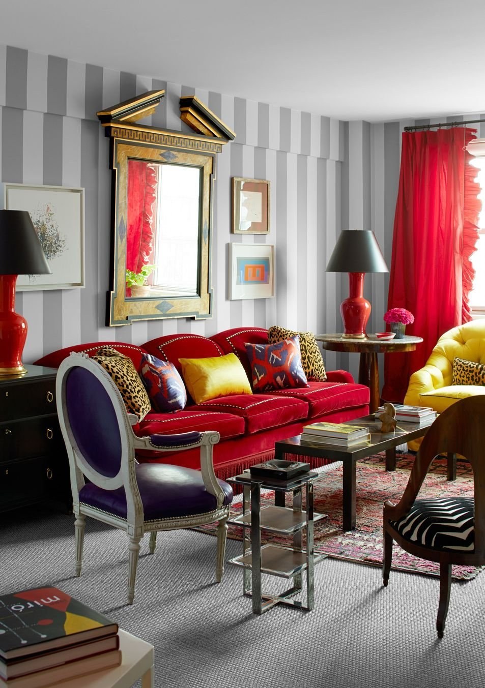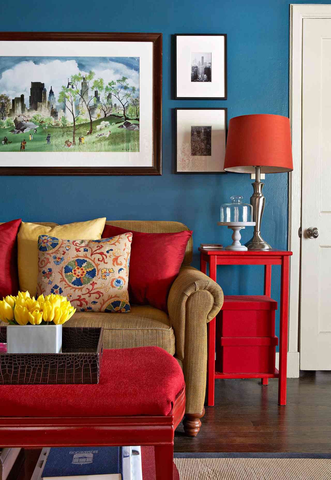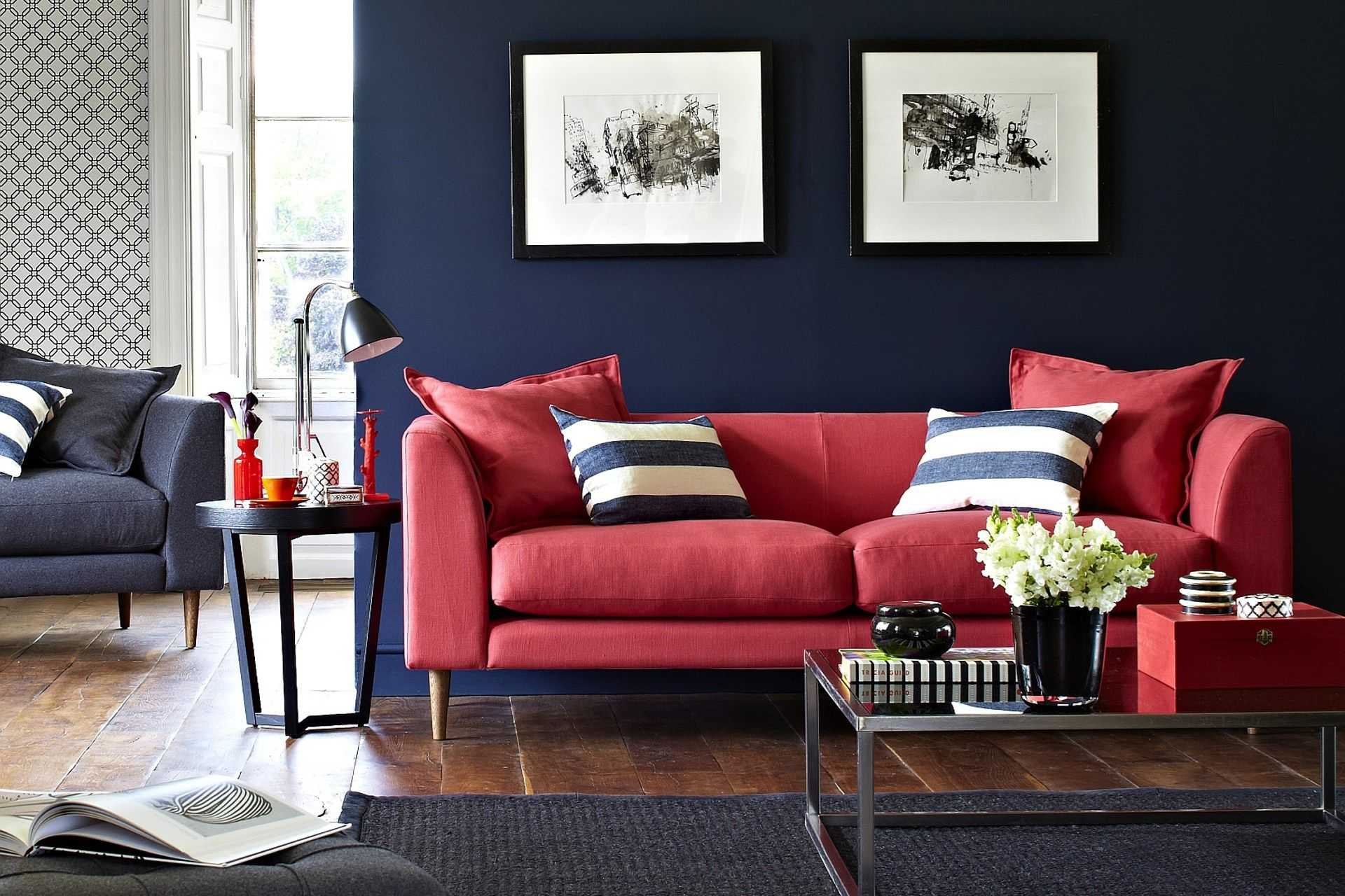 Красный диван в интерьере гостиной